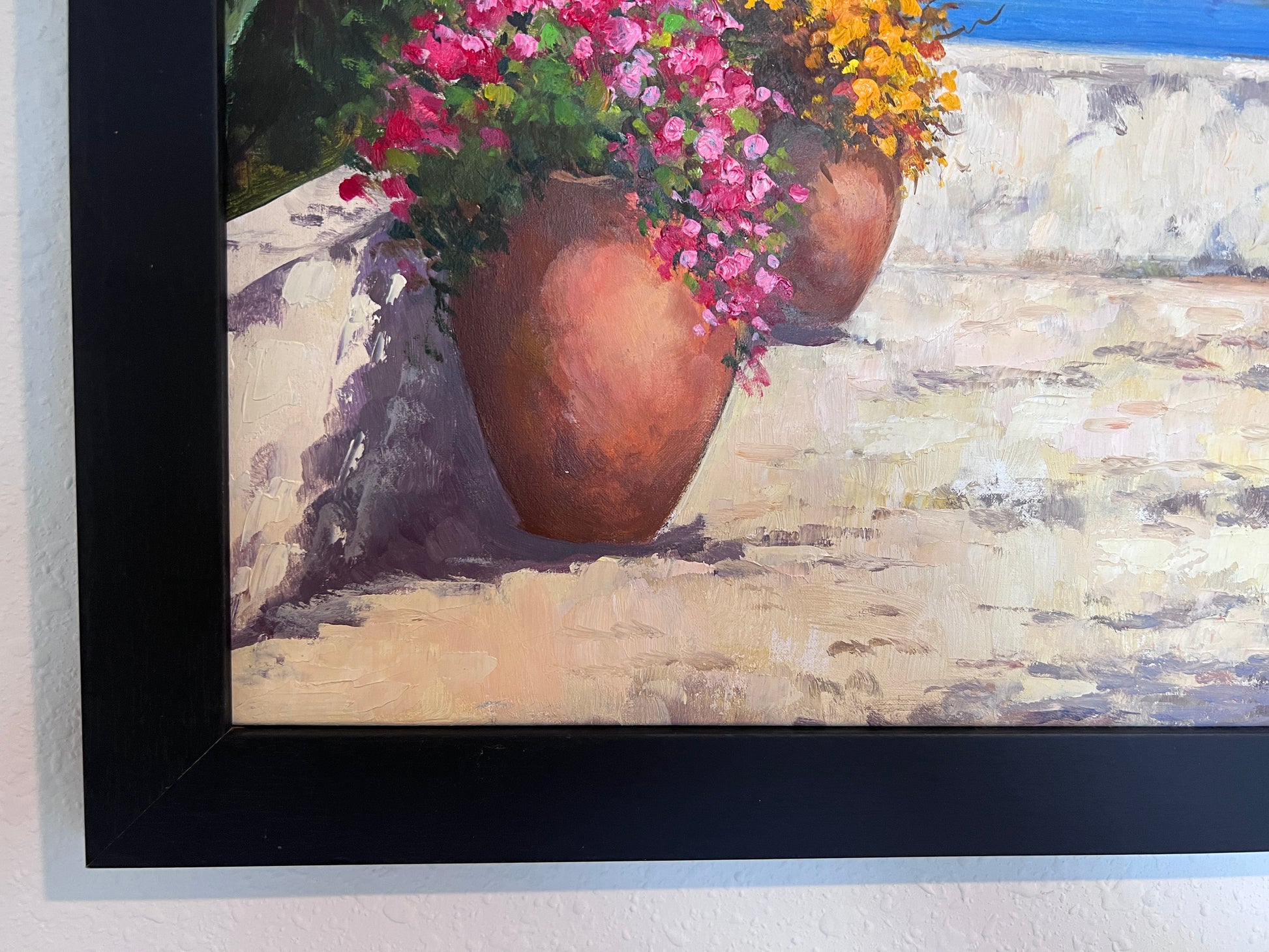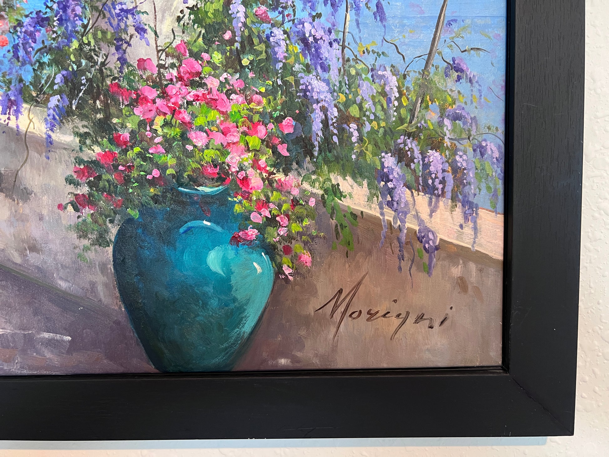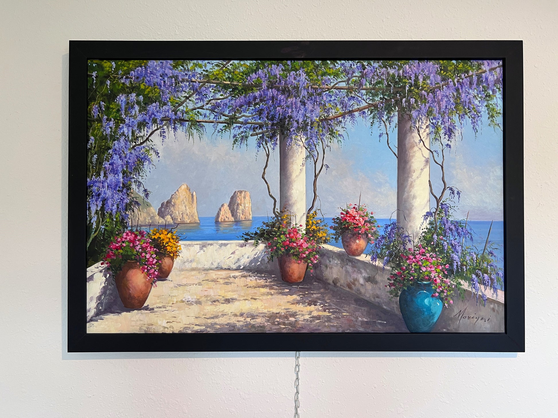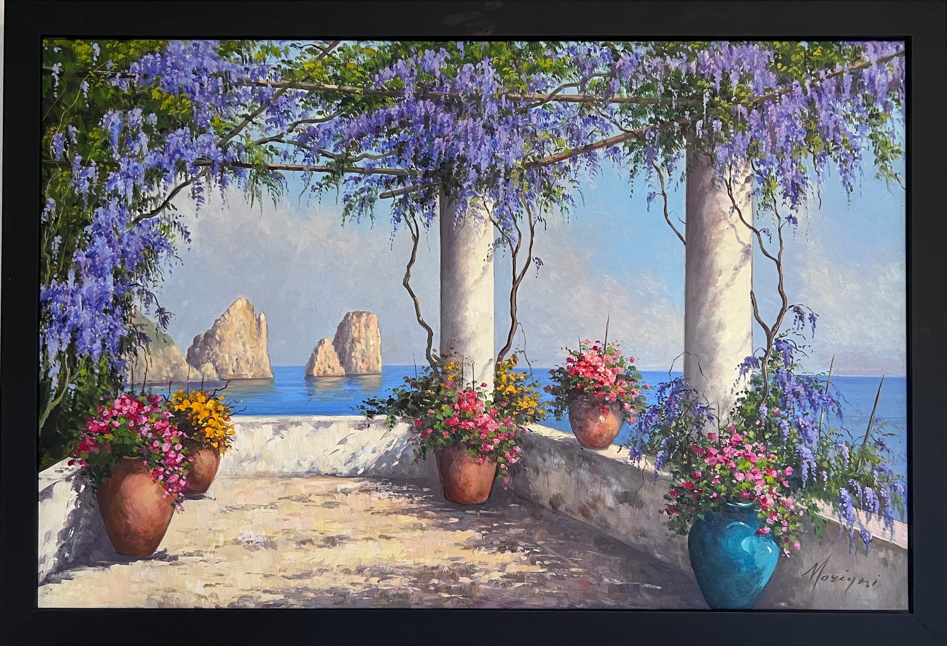 This original oil painting by Italian artist Moriani beautifully captures the charm of the Mediterranean coast.