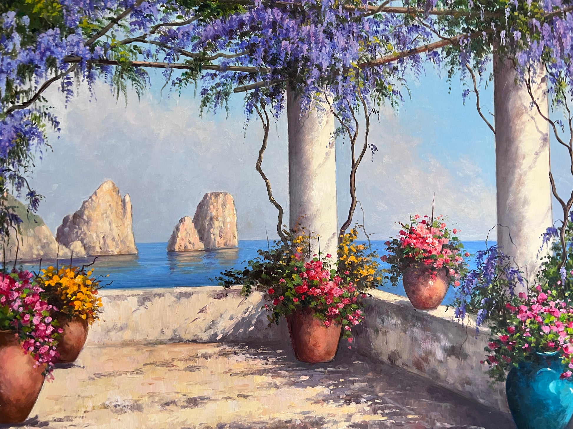 The scene depicts a sunlit terrace overlooking the sparkling blue sea, framed by classical white columns supporting a pergola draped with cascading purple wisteria. Terracotta pots filled with vibrant blooming flowers add warmth and contrast against the cool tones of the ocean and sky. In the distance, the iconic Faraglioni rock formations rise majestically from the water, evoking the romantic allure of Capri.