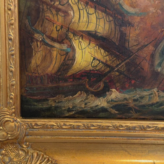 This vintage oil on canvas presents a dramatic maritime scene featuring a large sailing ship navigating turbulent waters beneath a dark, expressive sky. The vessel is angled sharply into the waves, sails straining with wind, rigging taut, and the sea rendered with thick, energetic brushstrokes. The palette of deep blues, browns, and warm ochres emphasizes motion, tension, and the raw power of open water.