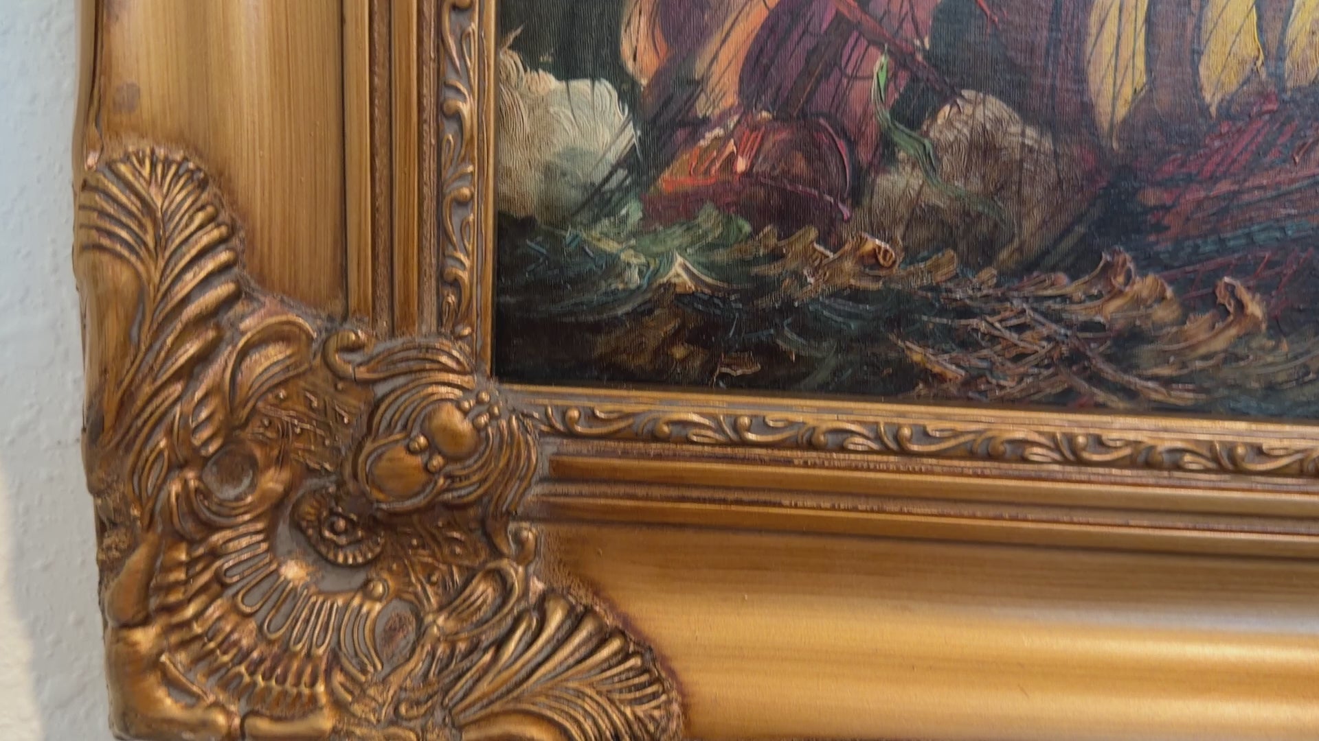 The artwork is housed in a richly ornate gold-tone wooden frame with heavy baroque-style corner ornaments and detailed relief molding. The frame significantly enhances the visual impact of the piece and gives it a strong, gallery-ready presence despite its smaller scale.