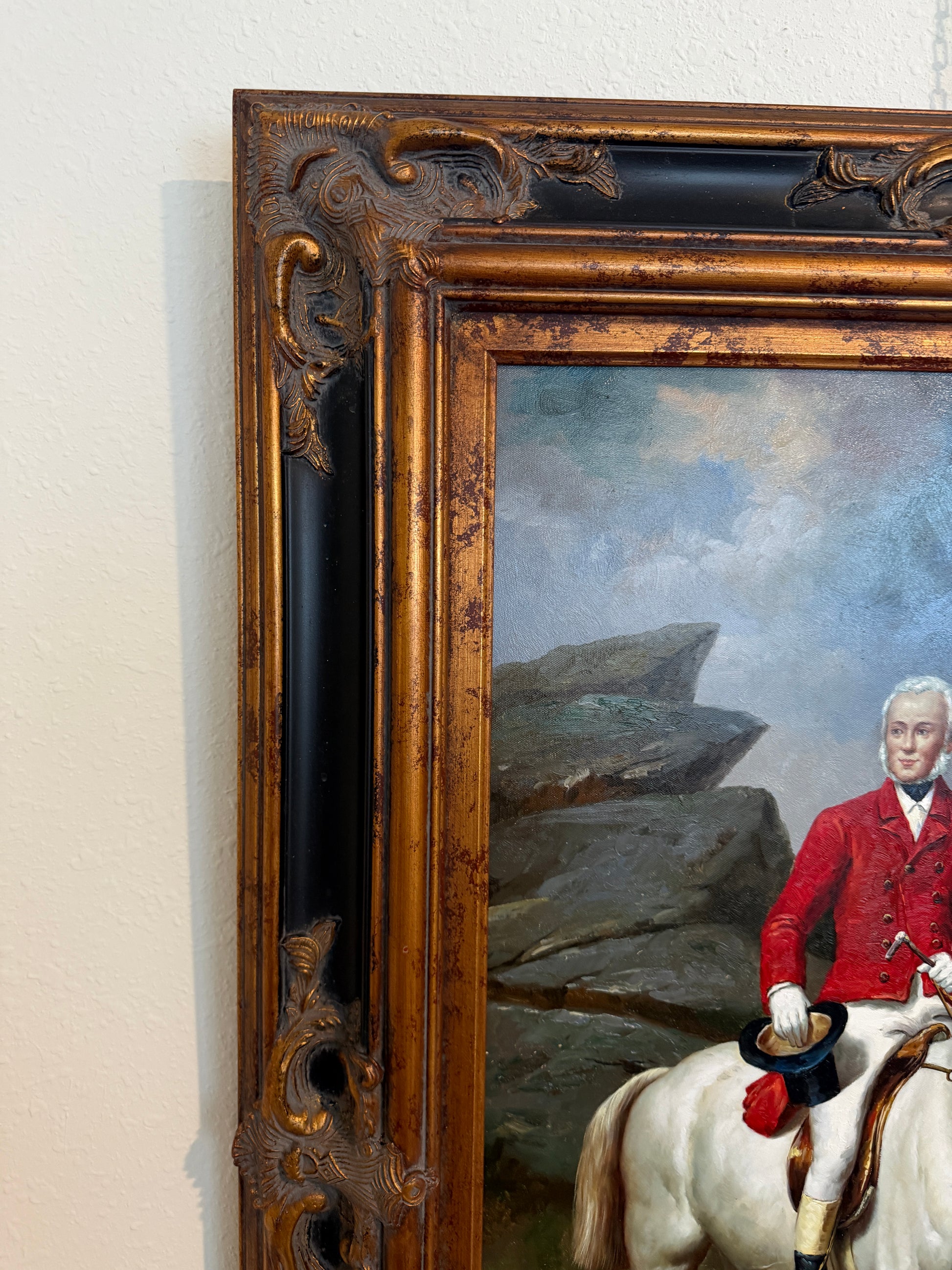 The artwork is presented in an impressive, heavily carved wooden frame with a dark and gilt finish, featuring ornate scrollwork and corner embellishments. The substantial frame enhances the formal, traditional character of the painting and gives it commanding wall presence.