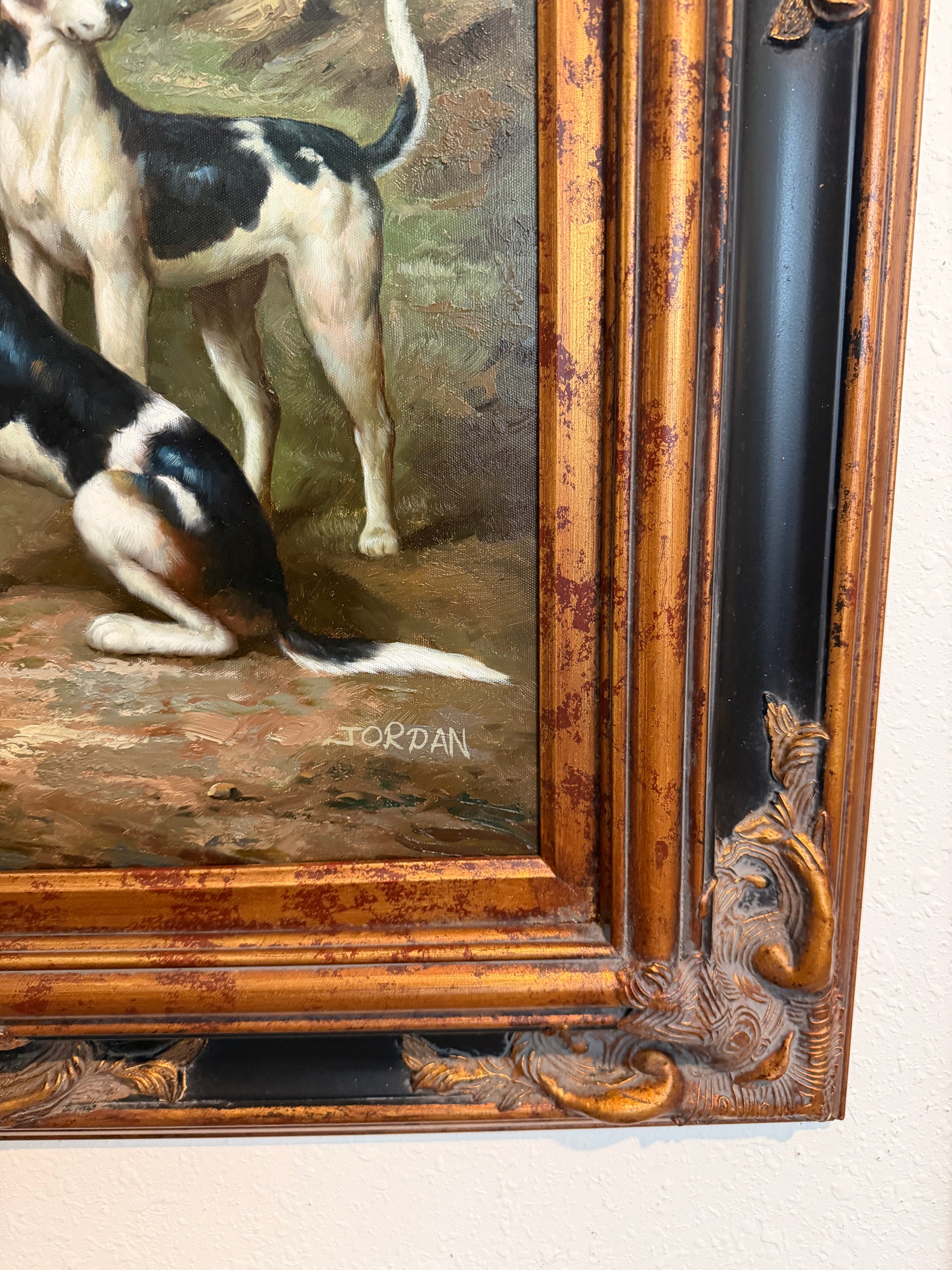 The painting is signed Jordan in the lower right. Strong anatomical rendering of the horse, careful attention to costume, and expressive detailing of the hounds demonstrate the artist’s technical skill and understanding of equestrian subjects.
