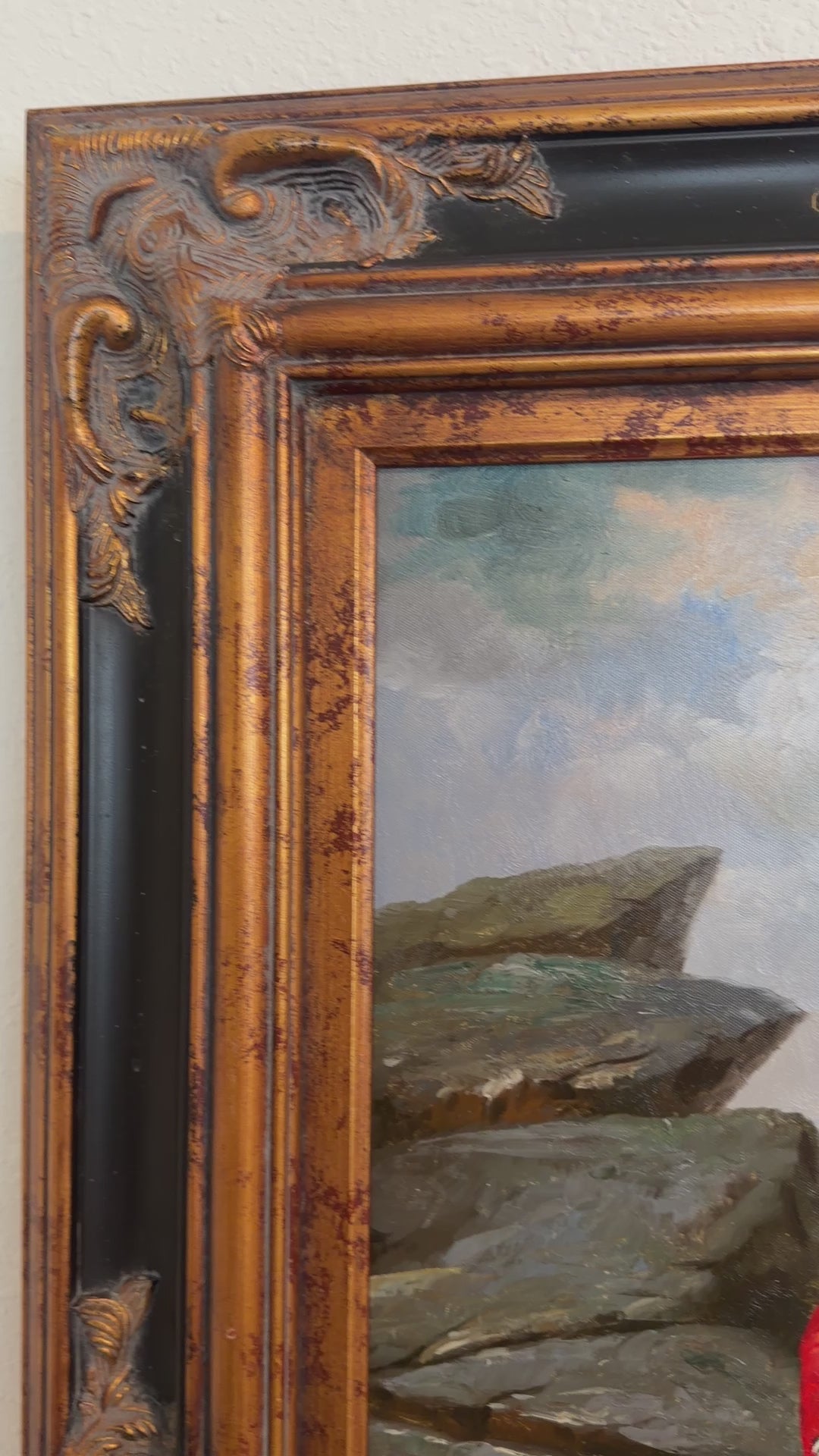 ✔️ Frame: Ornate carved wood frame with dark and gilt finish, decorative scroll and corner motifs