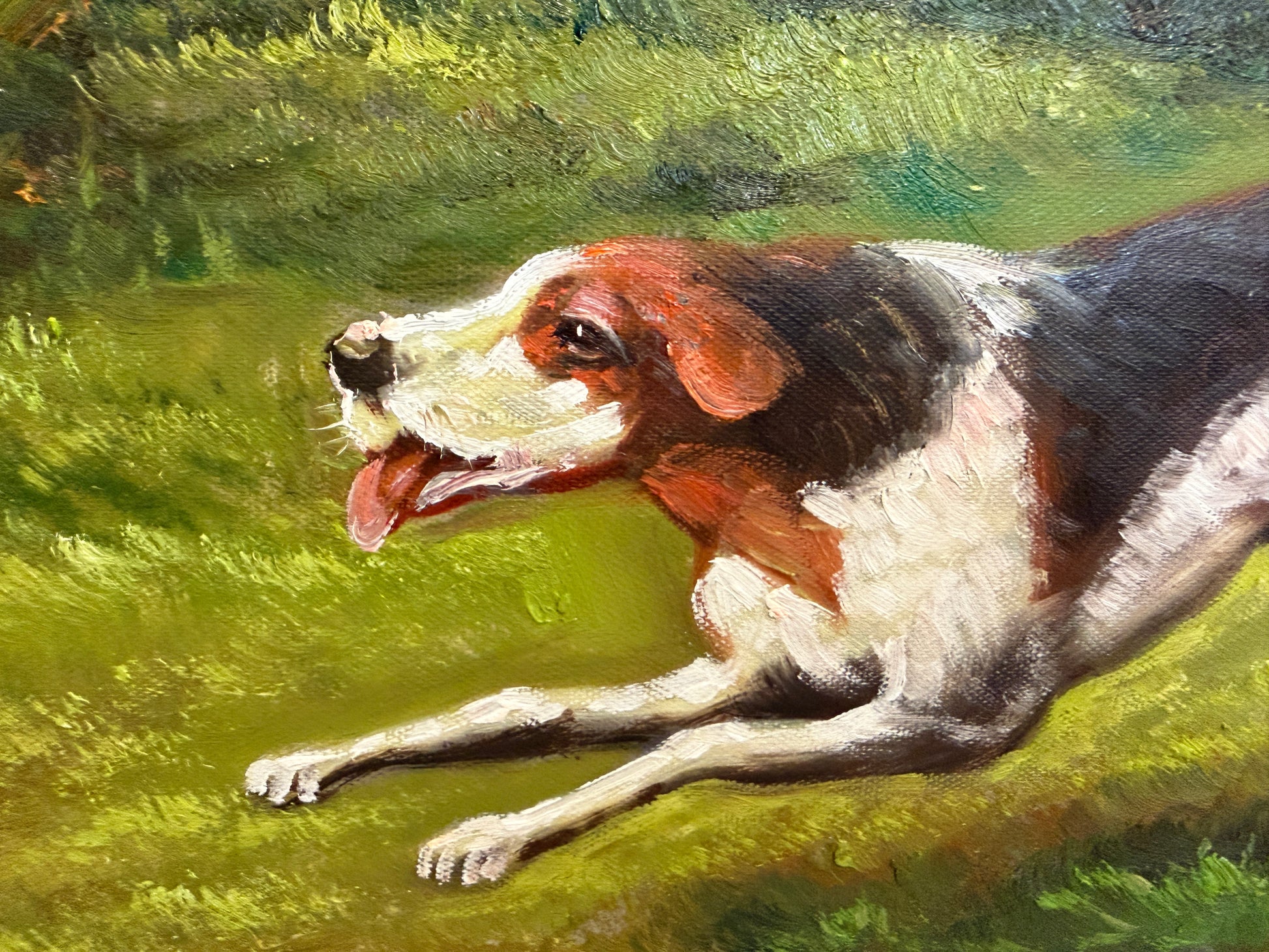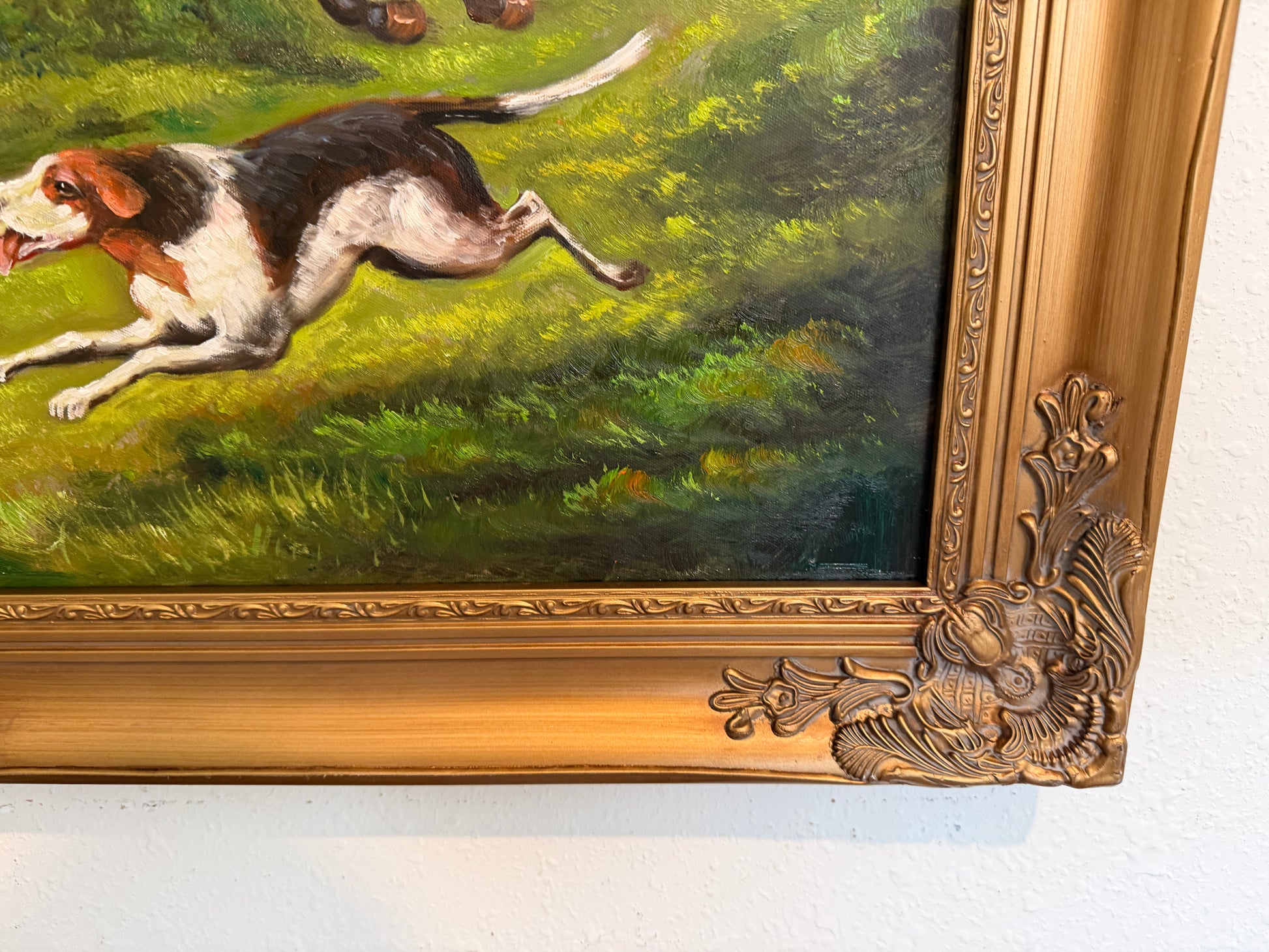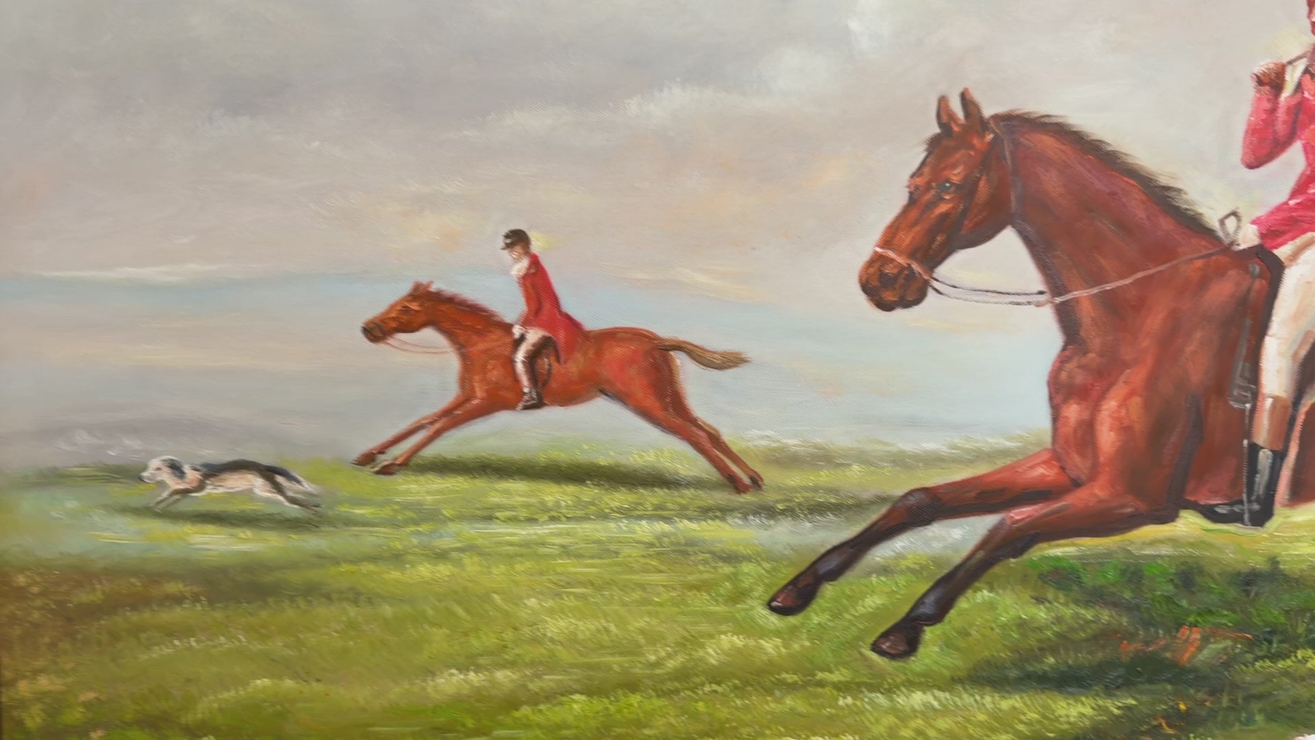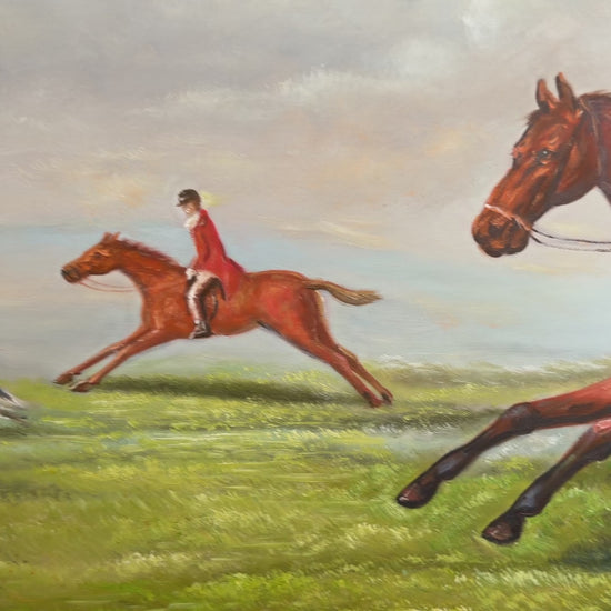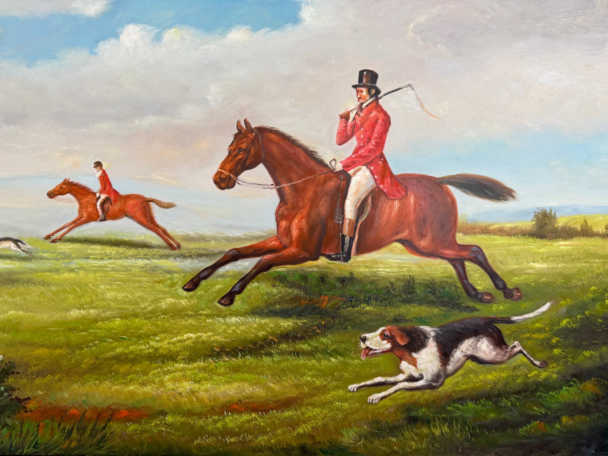Executed in a traditional sporting style, the painting reflects 20th century English hunt scene conventions inspired by 19th century British equestrian painters.