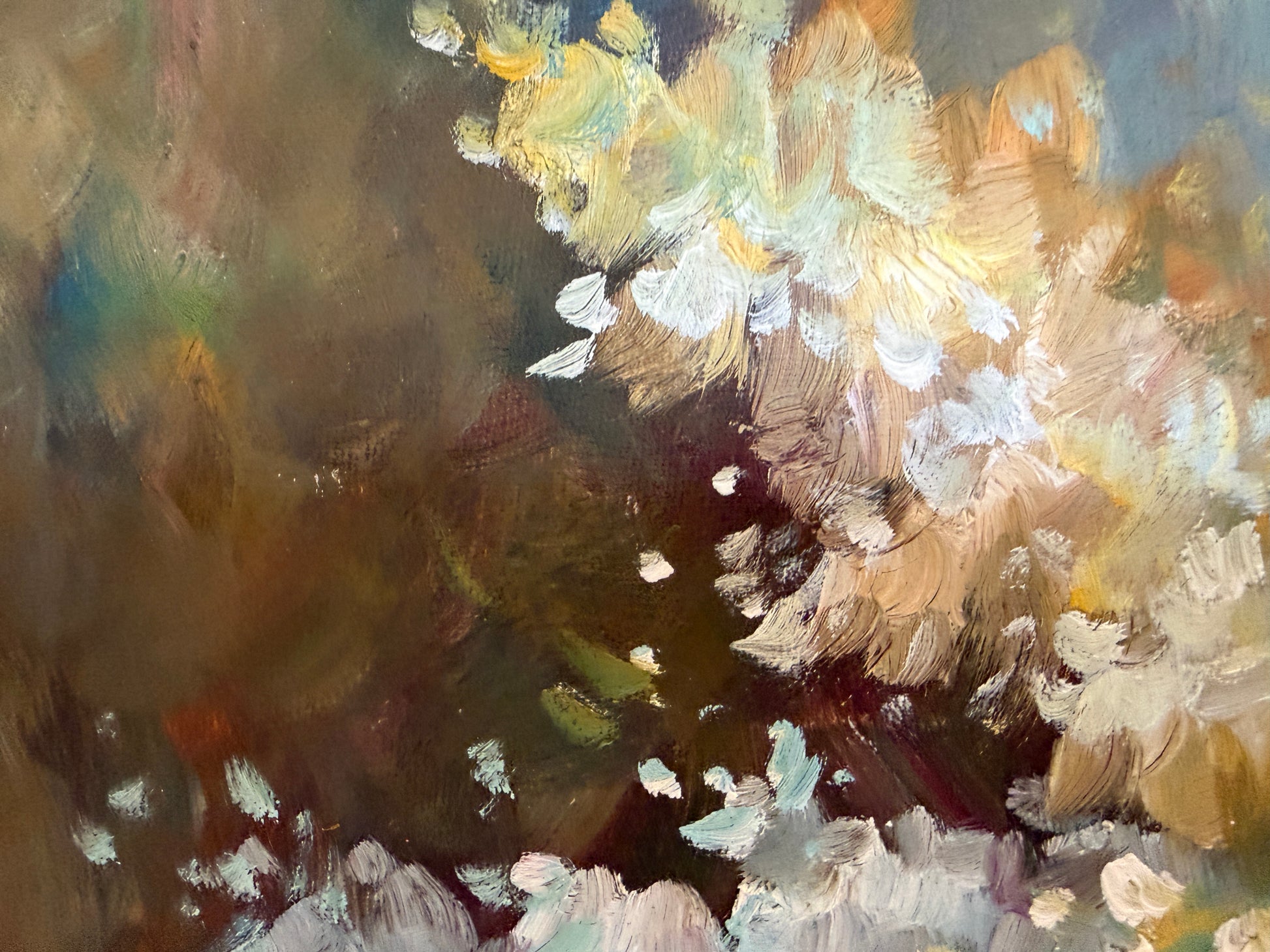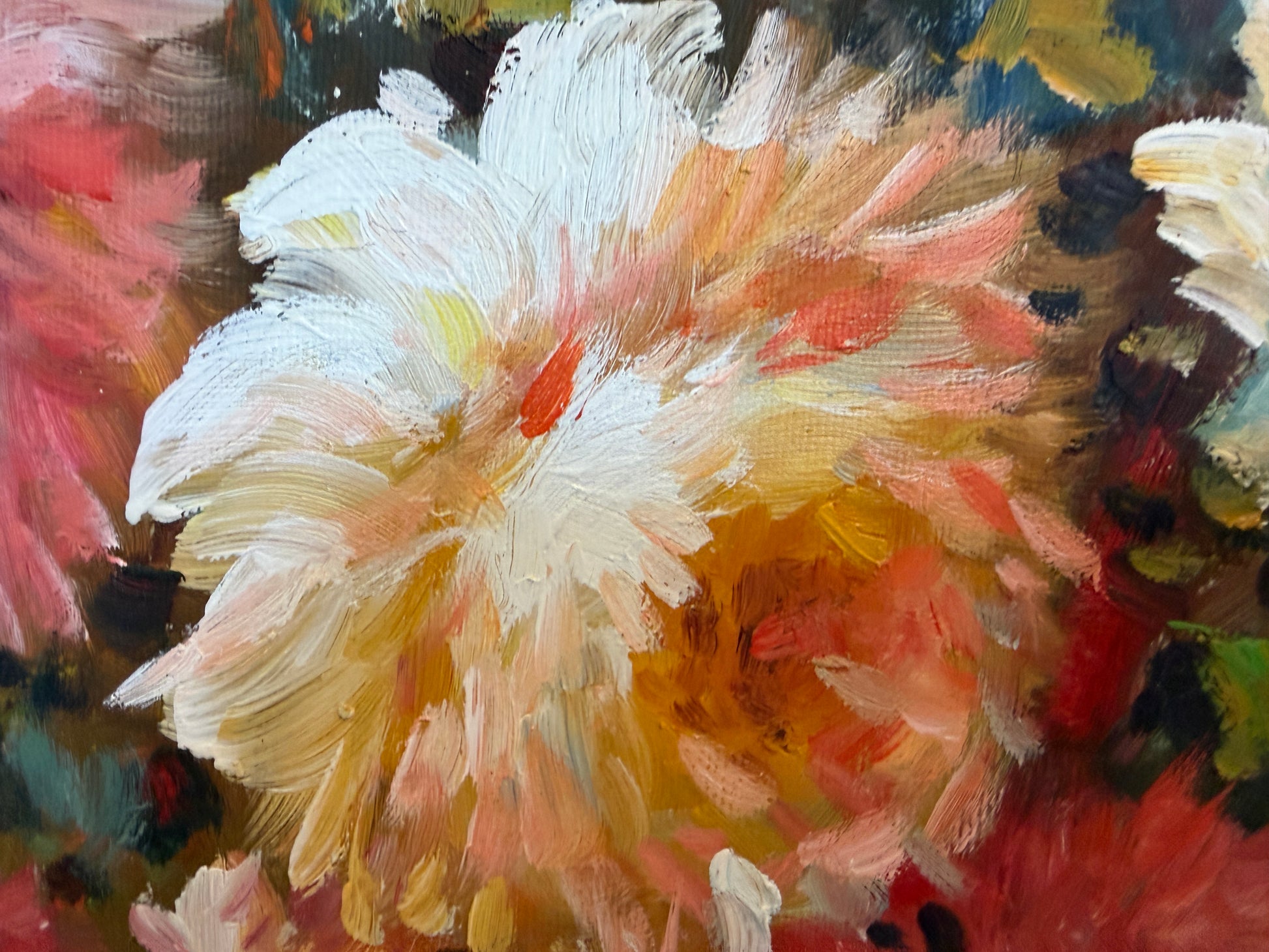 This is a contemporary work executed in a classic still life style, ideal for collectors seeking decorative impact and timeless subject matter without the fragility of antique pieces.