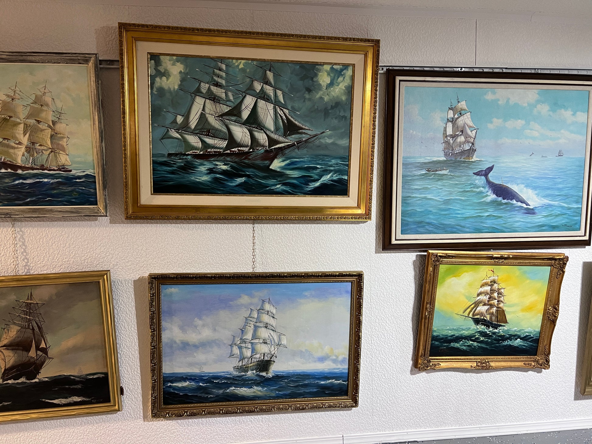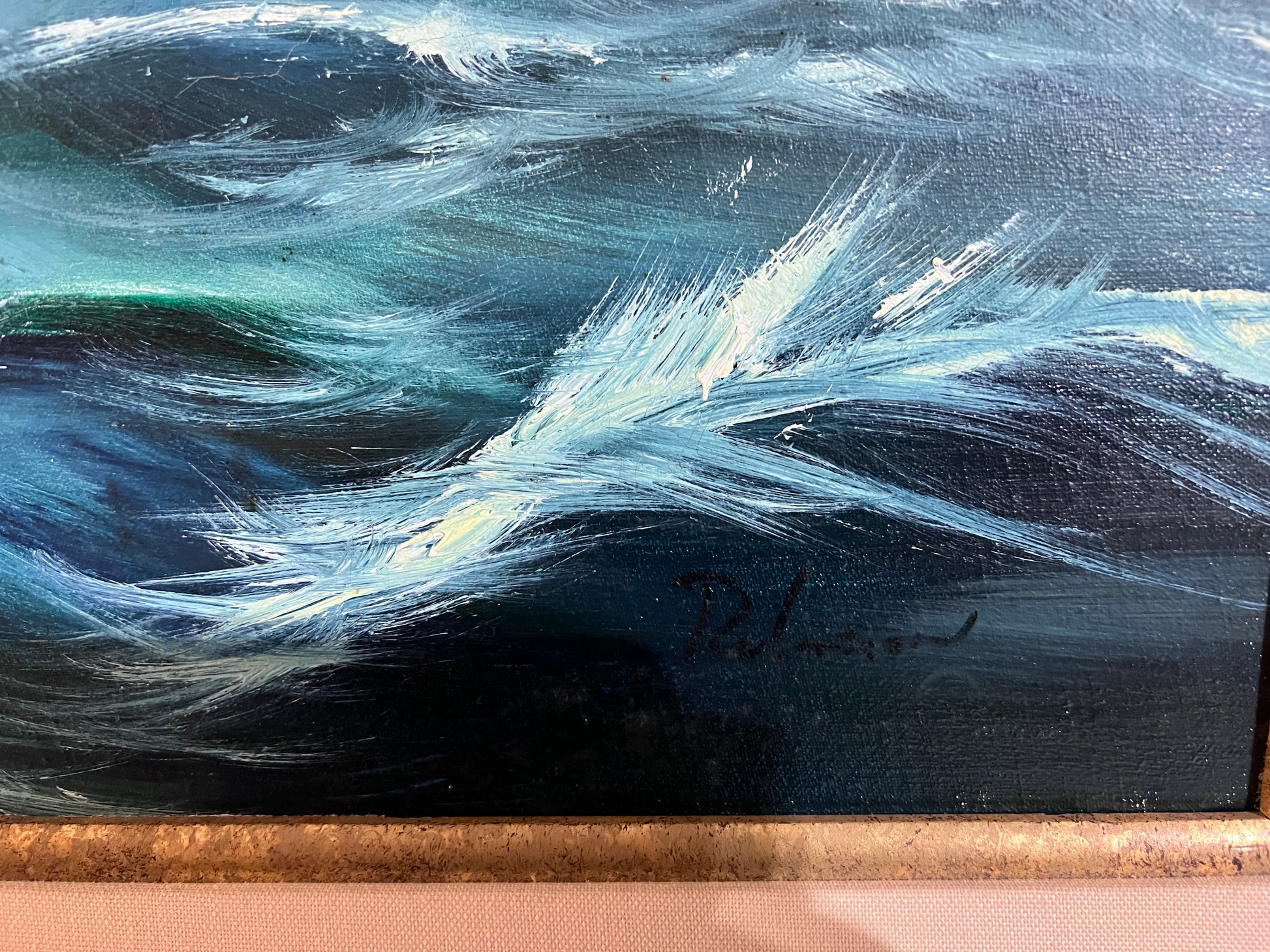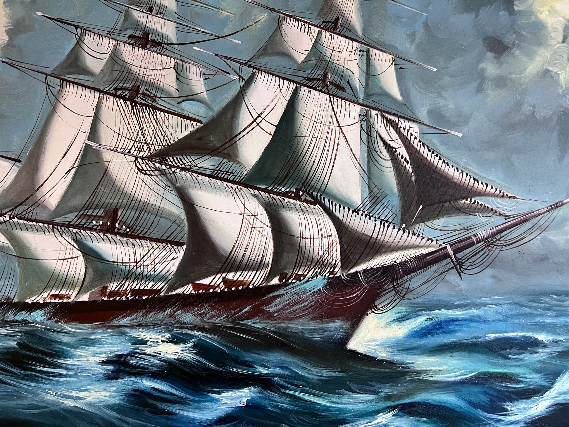 Up for sale is an original oil painting on canvas, depicting a majestic sailing ship vigorously navigating through turbulent seas. The ship is rendered in great detail, with all sails unfurled and catching the wind, adding a dramatic sense of movement and power. The surrounding ocean is painted with swirling, frothy waves in deep shades of blue and white, conveying the intensity of the stormy sea.