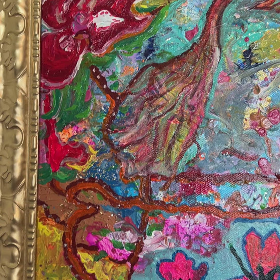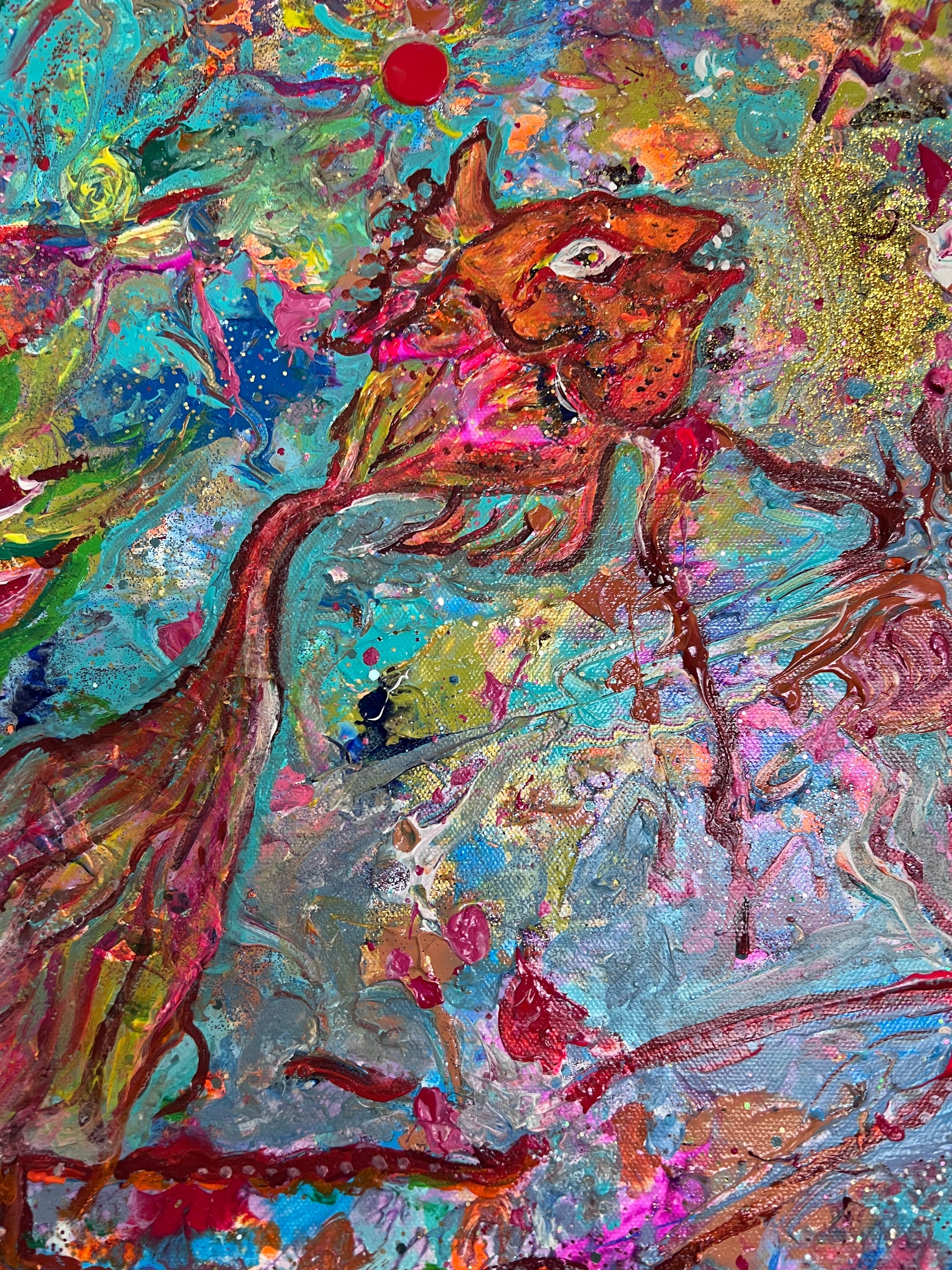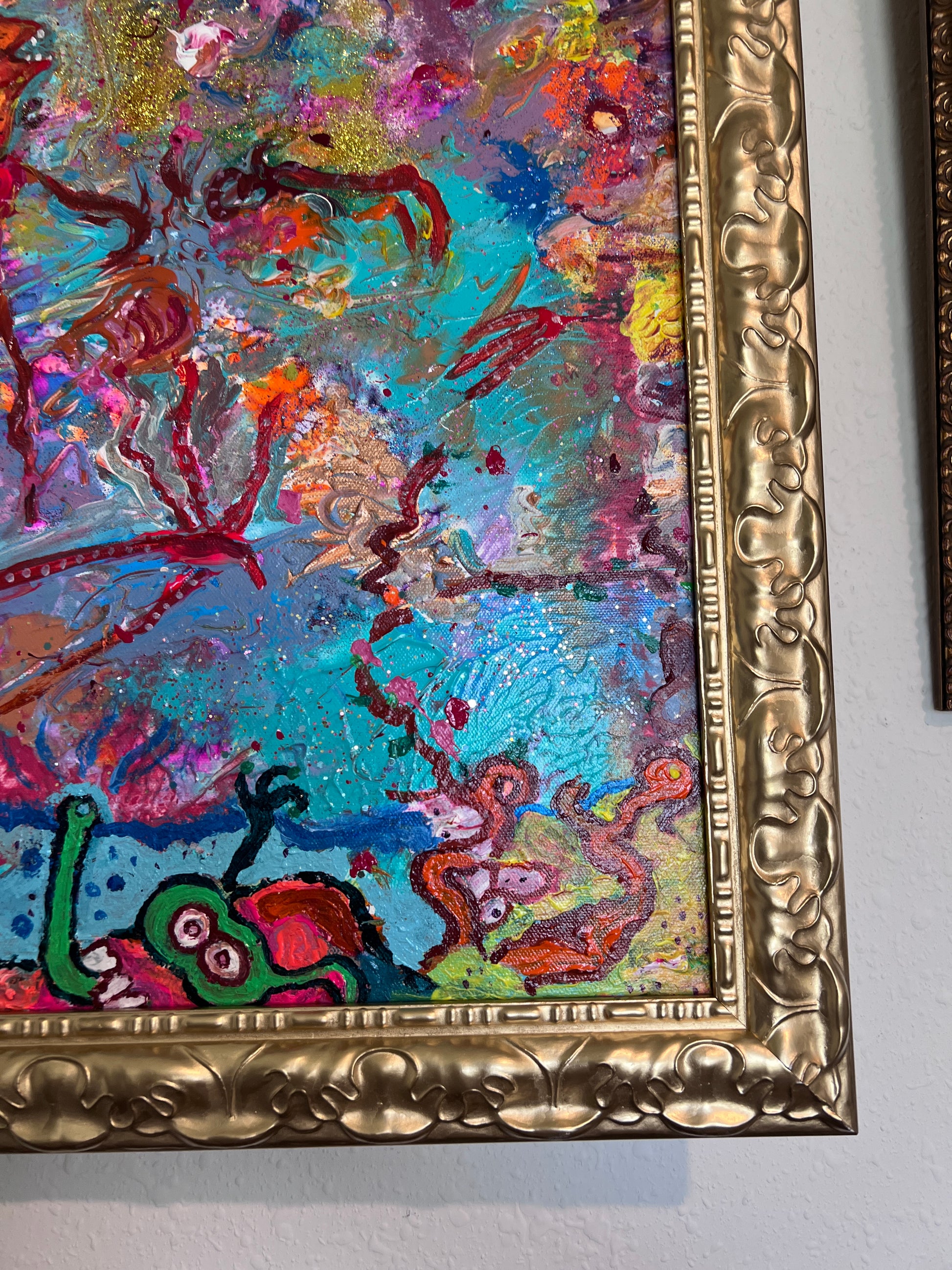 A symphony of flowing forms and layered colors seems to ripple like water, evoking the sense of a mysterious lagoon coming to life. Vivid hues of blue, green, gold, and magenta intermingle with dynamic brushwork, creating depth and movement that draw the viewer into its dreamlike world. The composition invites endless interpretation—an emotional journey rather than a fixed narrative—making it a powerful centerpiece for any space.