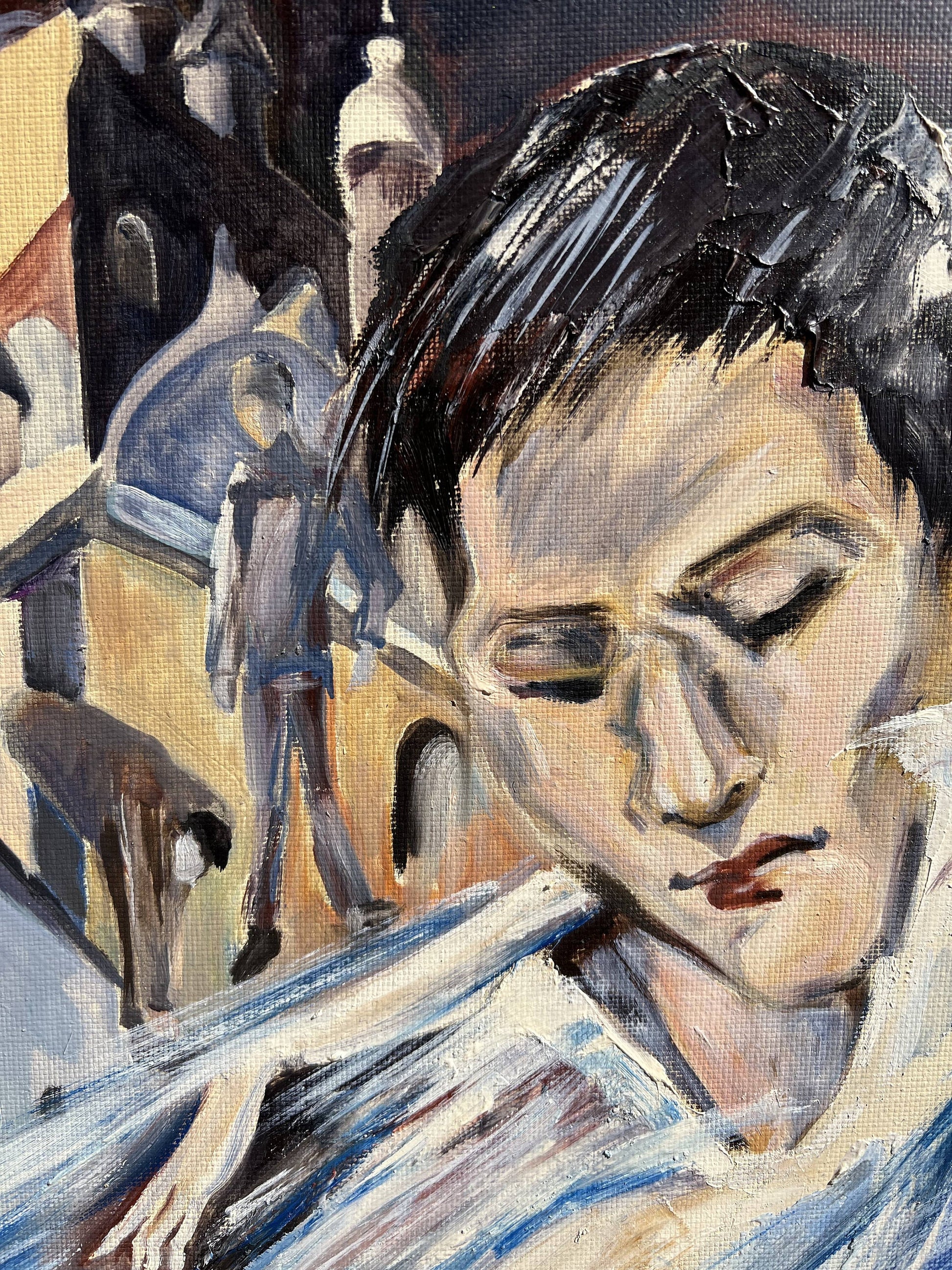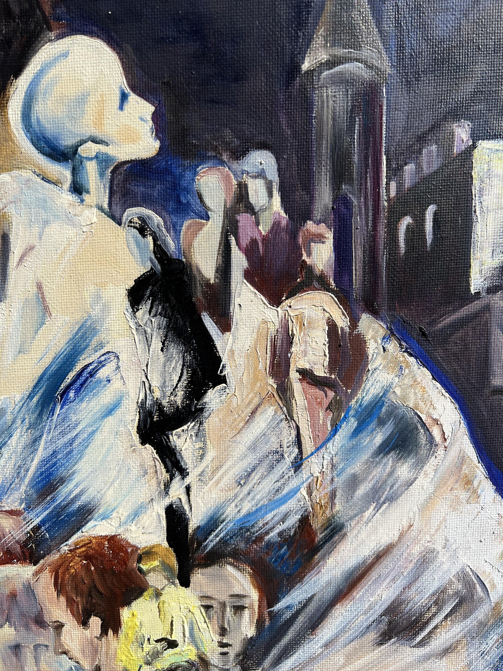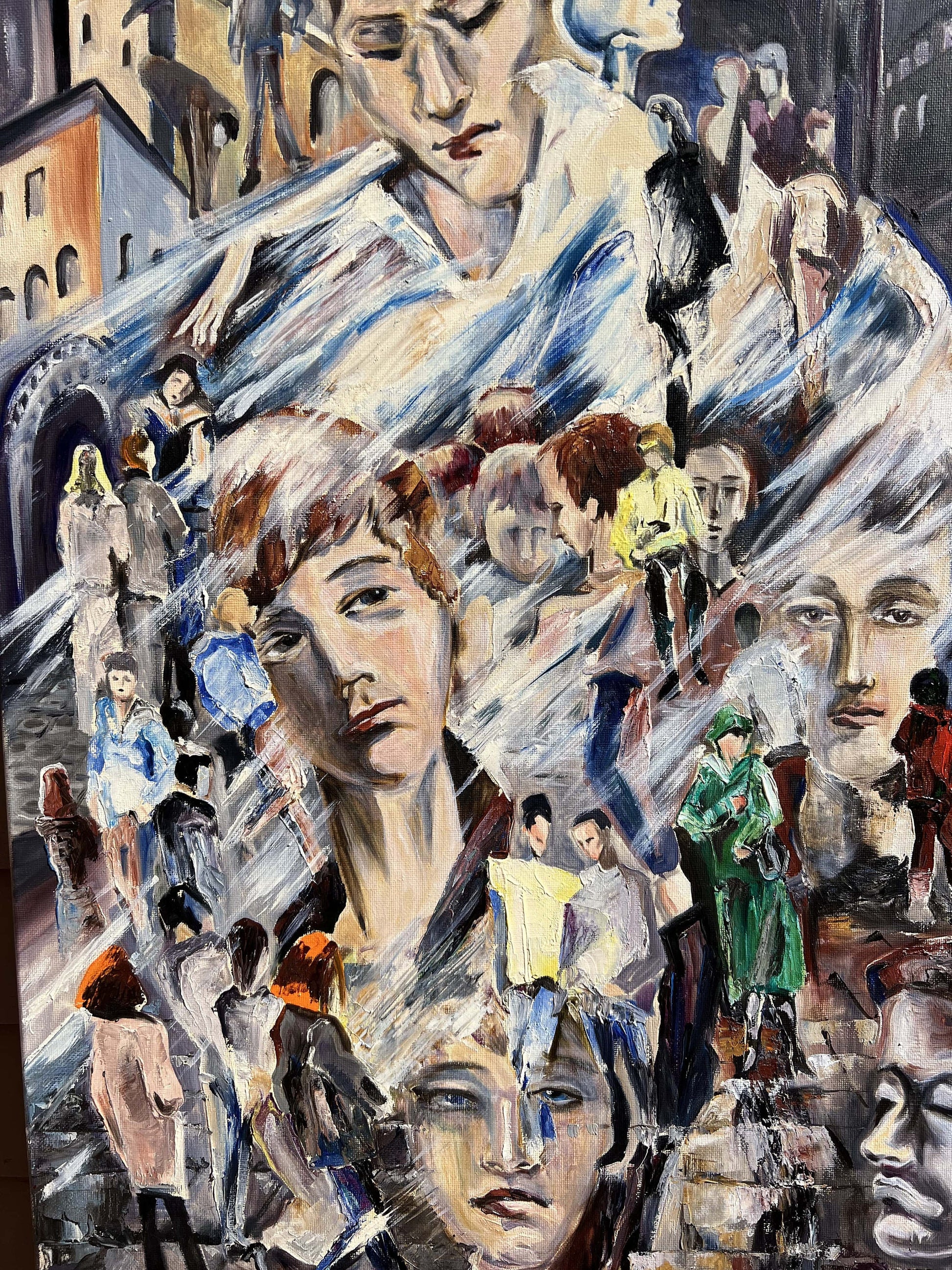 This emotionally charged painting presents a whirlwind of human faces and figures interwoven with architectural elements, capturing the chaos, beauty, and introspection of modern urban life. Expressive brushstrokes sweep diagonally across the canvas, merging crowds of people with haunting, oversized faces that reflect a range of emotions—from melancholy and contemplation to disconnection and yearning.