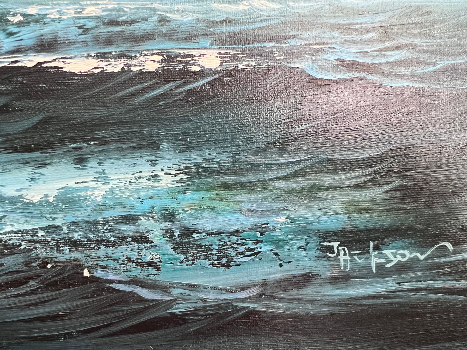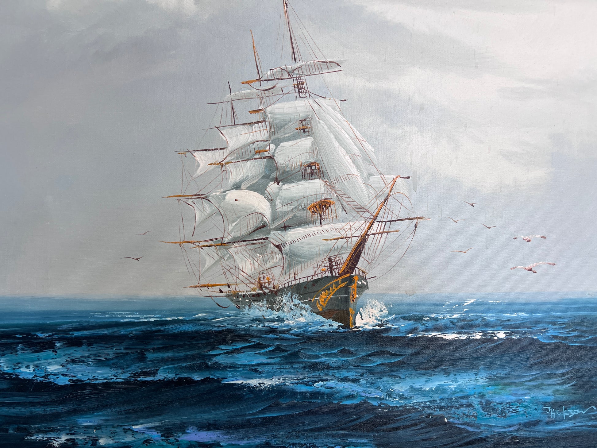 Up for sale is an original oil painting on canvas by listed maritime artist Hewett R. Jackson (1914–2007). This striking nautical scene depicts a majestic tall sailing ship breaking through deep blue waves, leaving a dramatic white wake behind. The ship’s detail and movement are expertly rendered, a hallmark of Jackson’s celebrated marine artistry. The painting is signed “Jackson” in the lower right corner.
