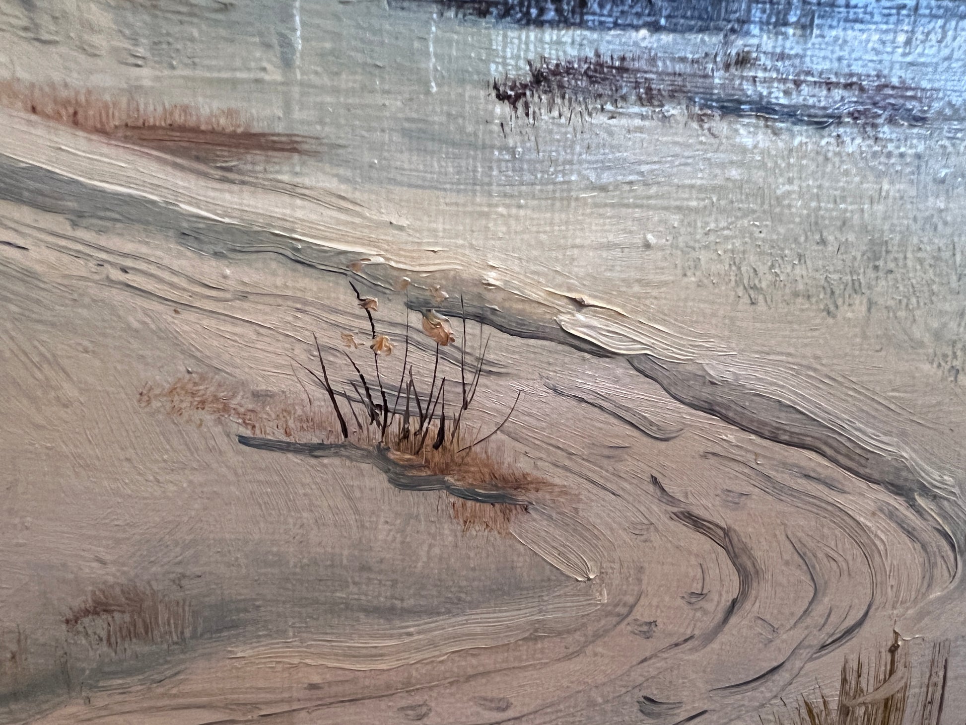 Painted in delicate cool tones of blue, gray, and white, the work evokes the serene beauty of the Russian winter. The artist’s brushwork brings subtle texture to the snow, sky, and trees, creating a harmonious and atmospheric composition.