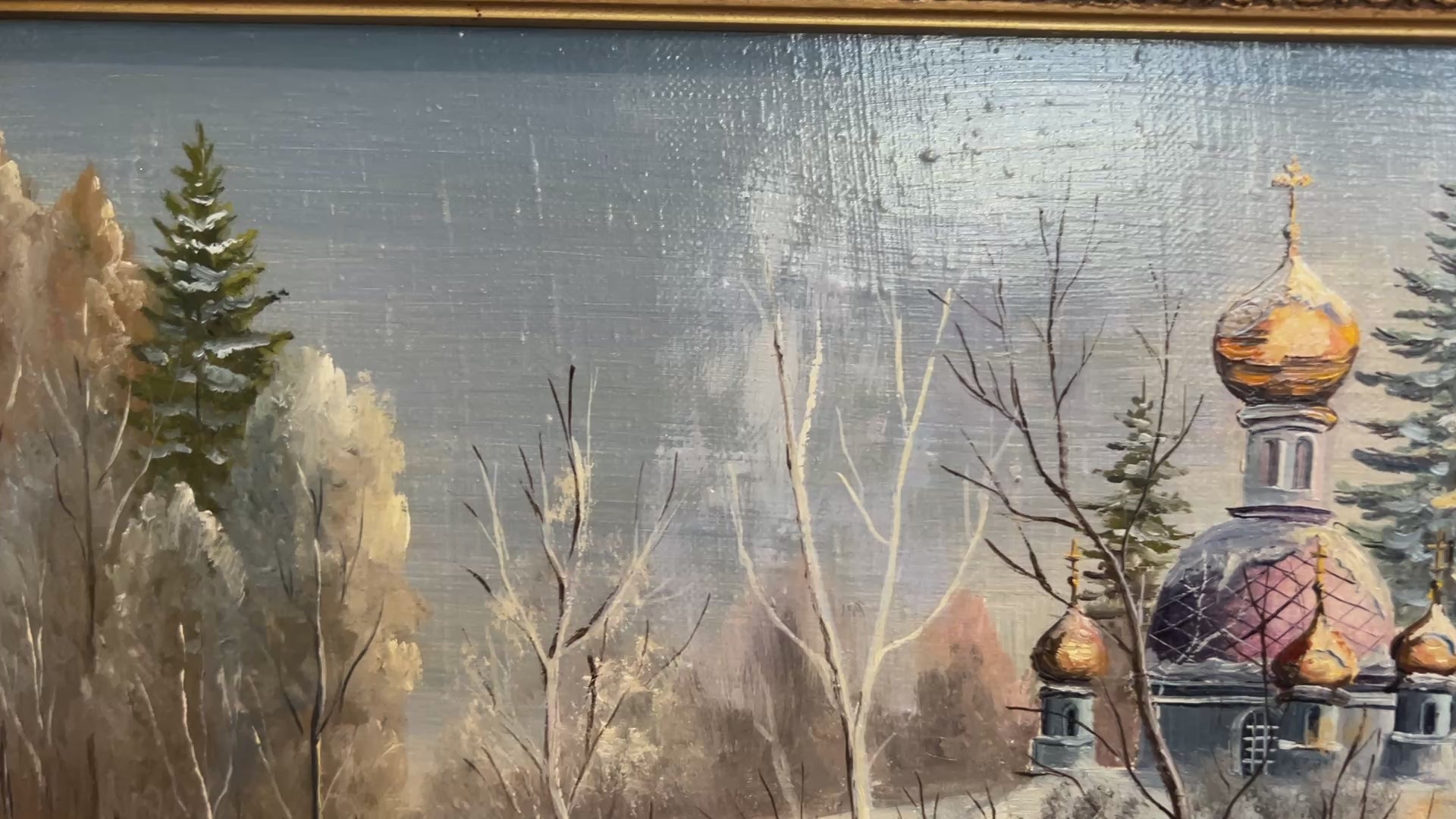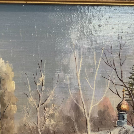 Up for sale is a beautiful original oil painting on canvas by Russian artist V. Ya. Tresnevskiy, completed in 1989. This peaceful winter landscape depicts a quiet rural village covered in soft snow, featuring a traditional Russian Orthodox church with golden domes rising gracefully above the treetops.