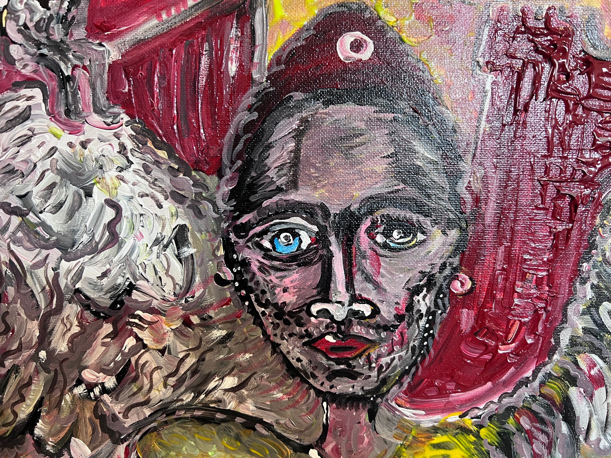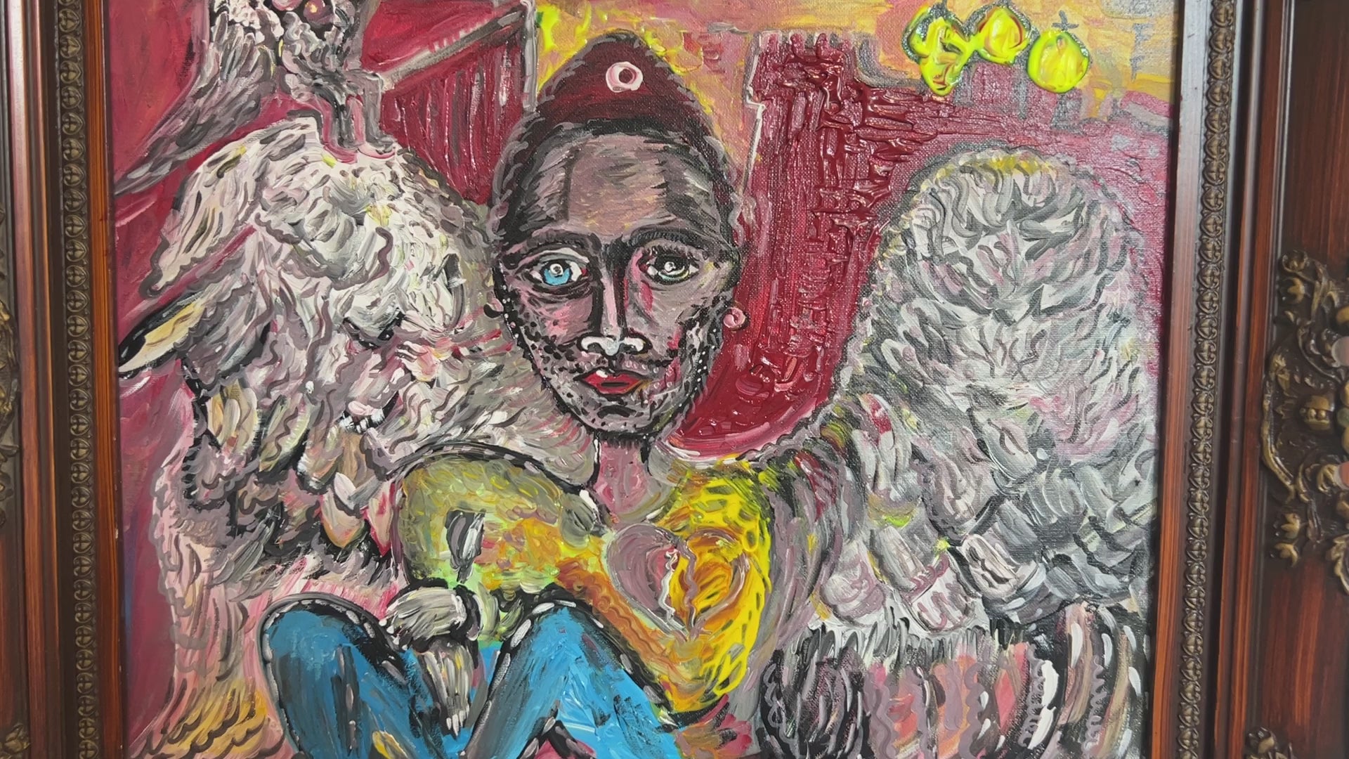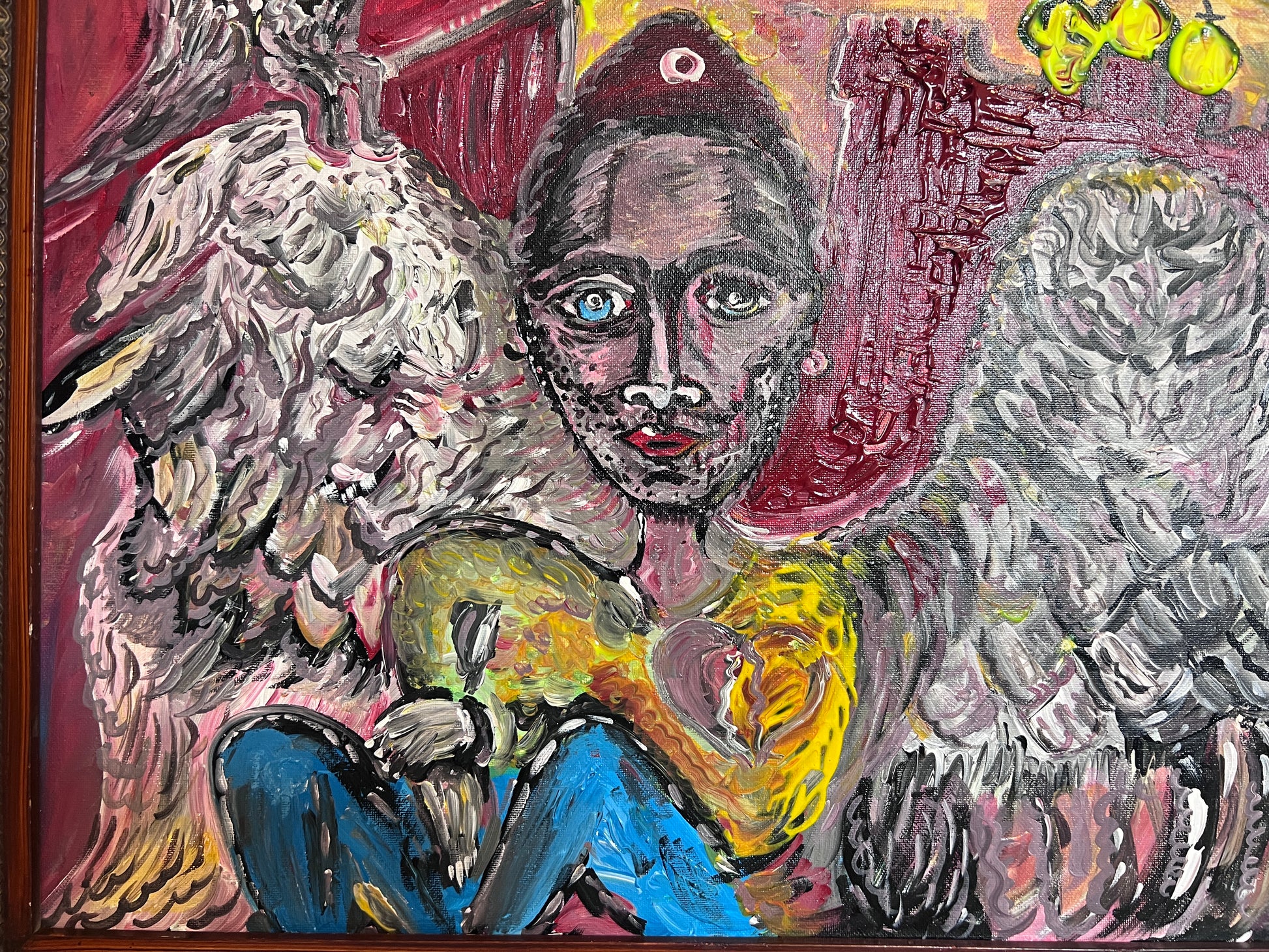The work combines an expressionistic and abstract approach, with bold, emotive colors and thick, impasto brushstrokes. At the center is a striking figure with **large, exaggerated eyes—one bright blue and the other dark—**creating an unsettling, otherworldly presence. The character’s wings, painted in muted grays and whites with rough, heavy lines, bring a tactile, feather‑like texture that suggests both angelic and mythological symbolism.