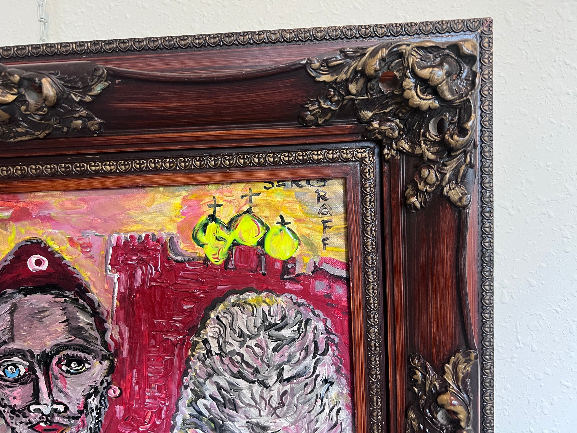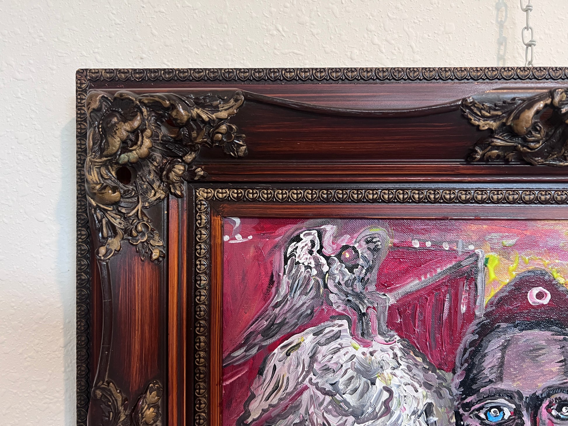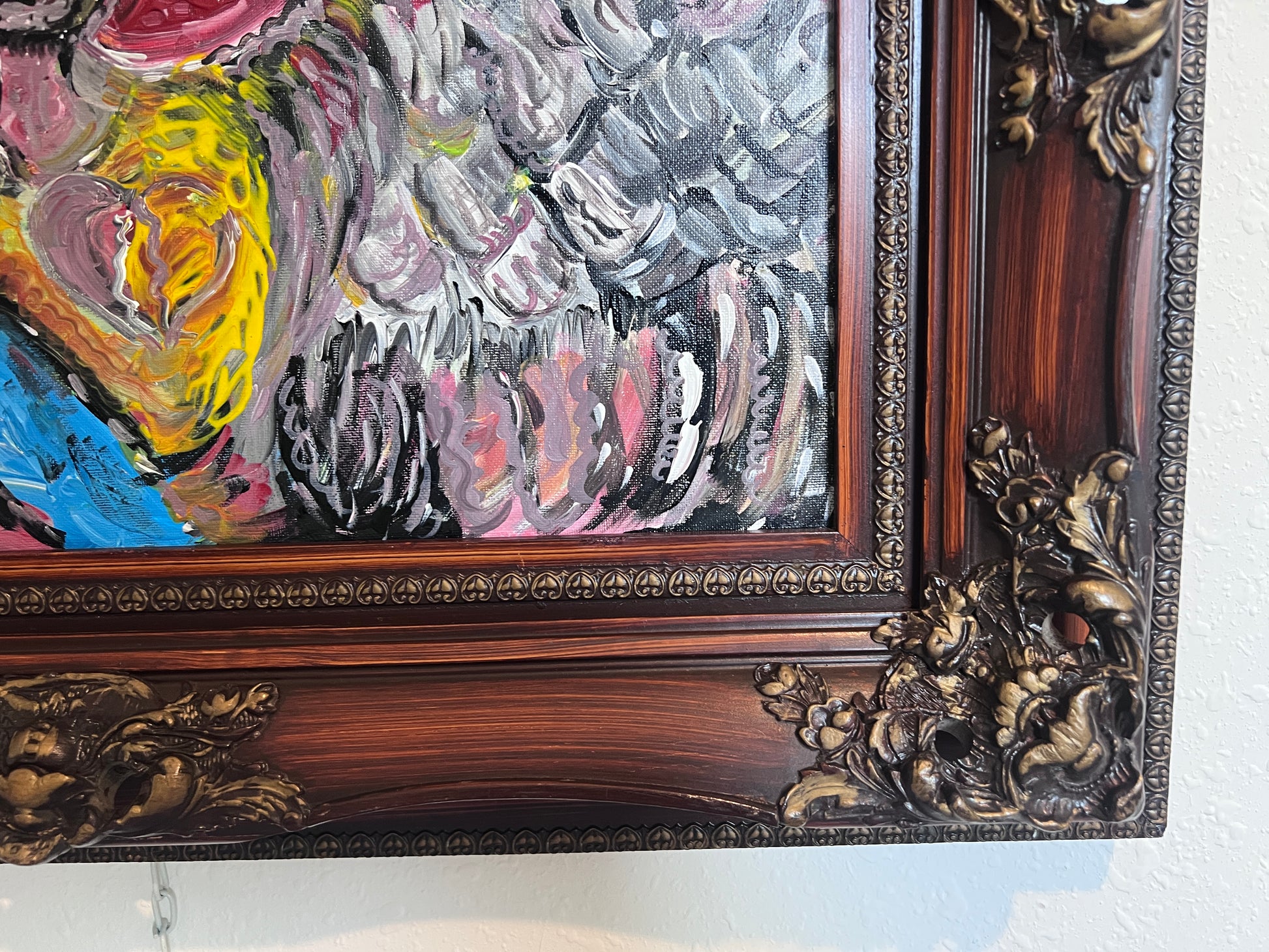 The painting’s raw energy contrasts beautifully with its dark wooden frame adorned with elaborate gold accents, a mix of classical elegance and modern abstraction. The result is a piece rich with emotional depth, spiritual undertones, and surrealist intrigue, making it a captivating focal point in any collection.