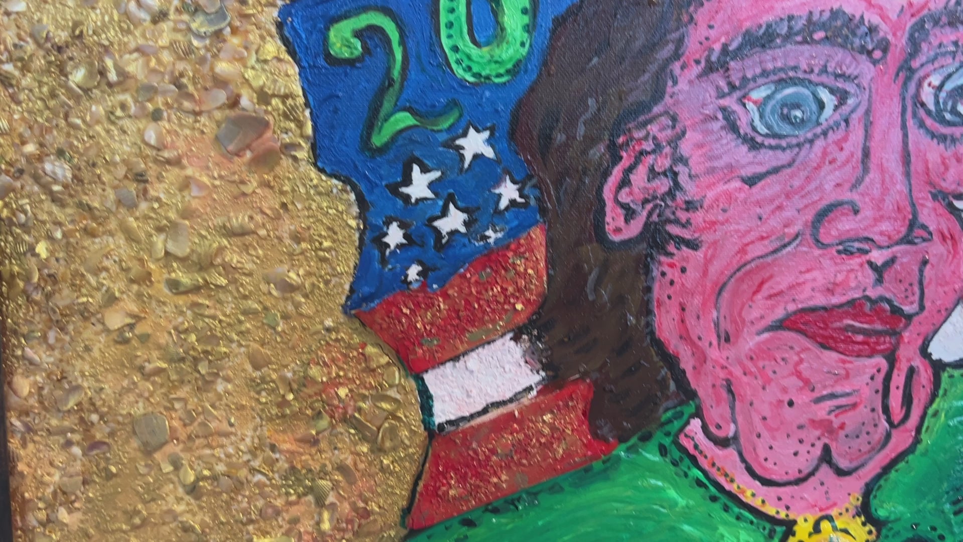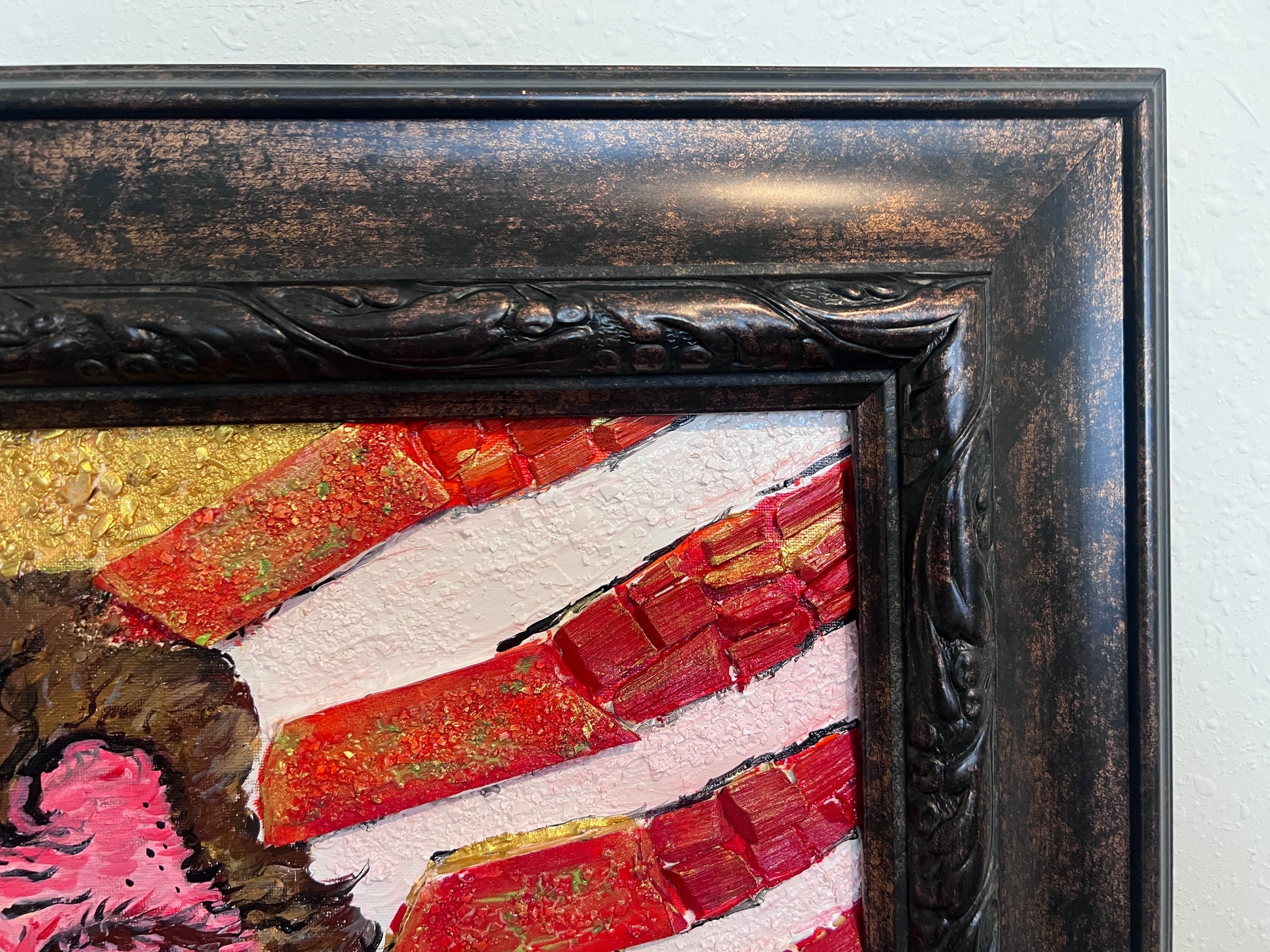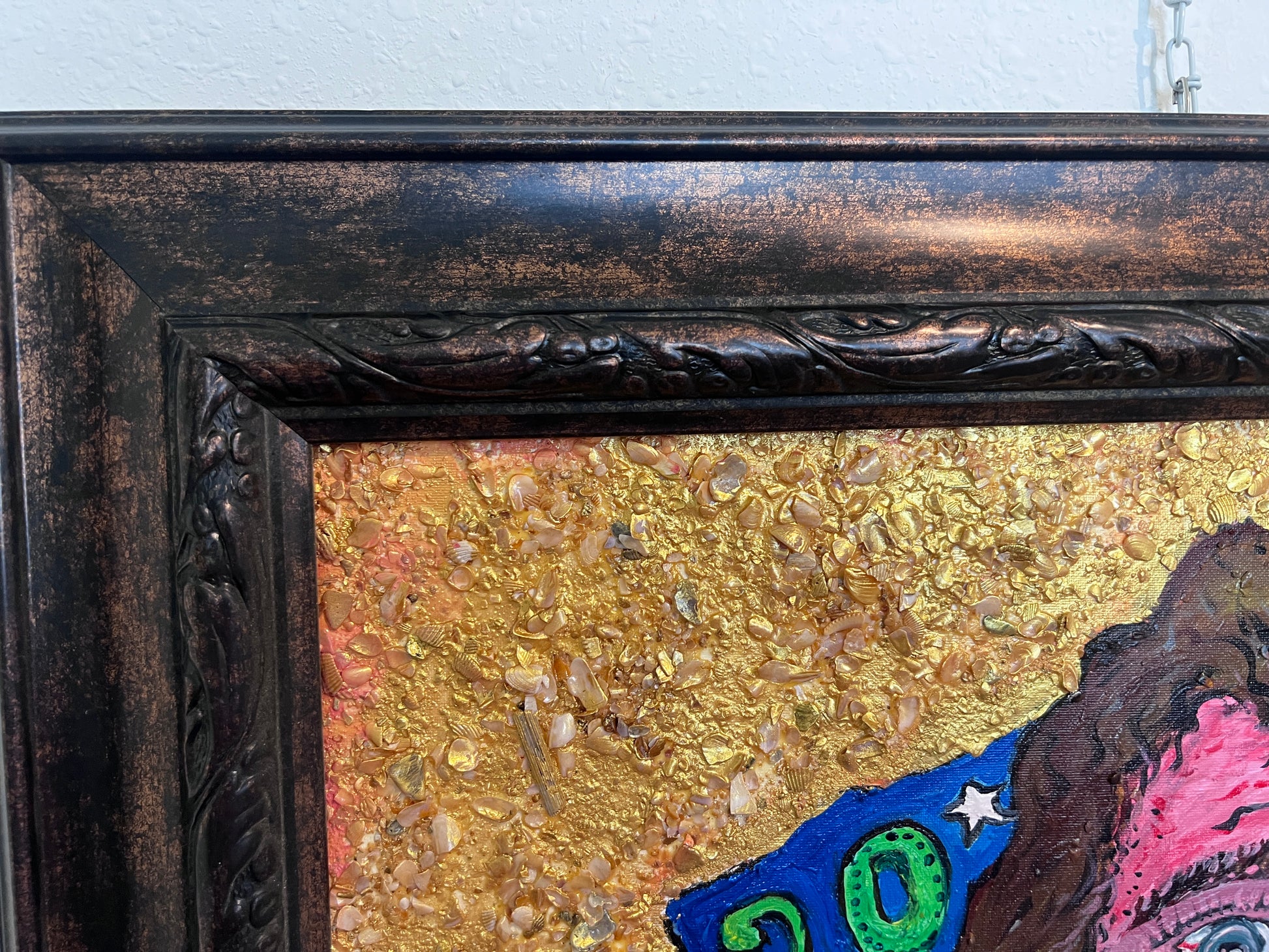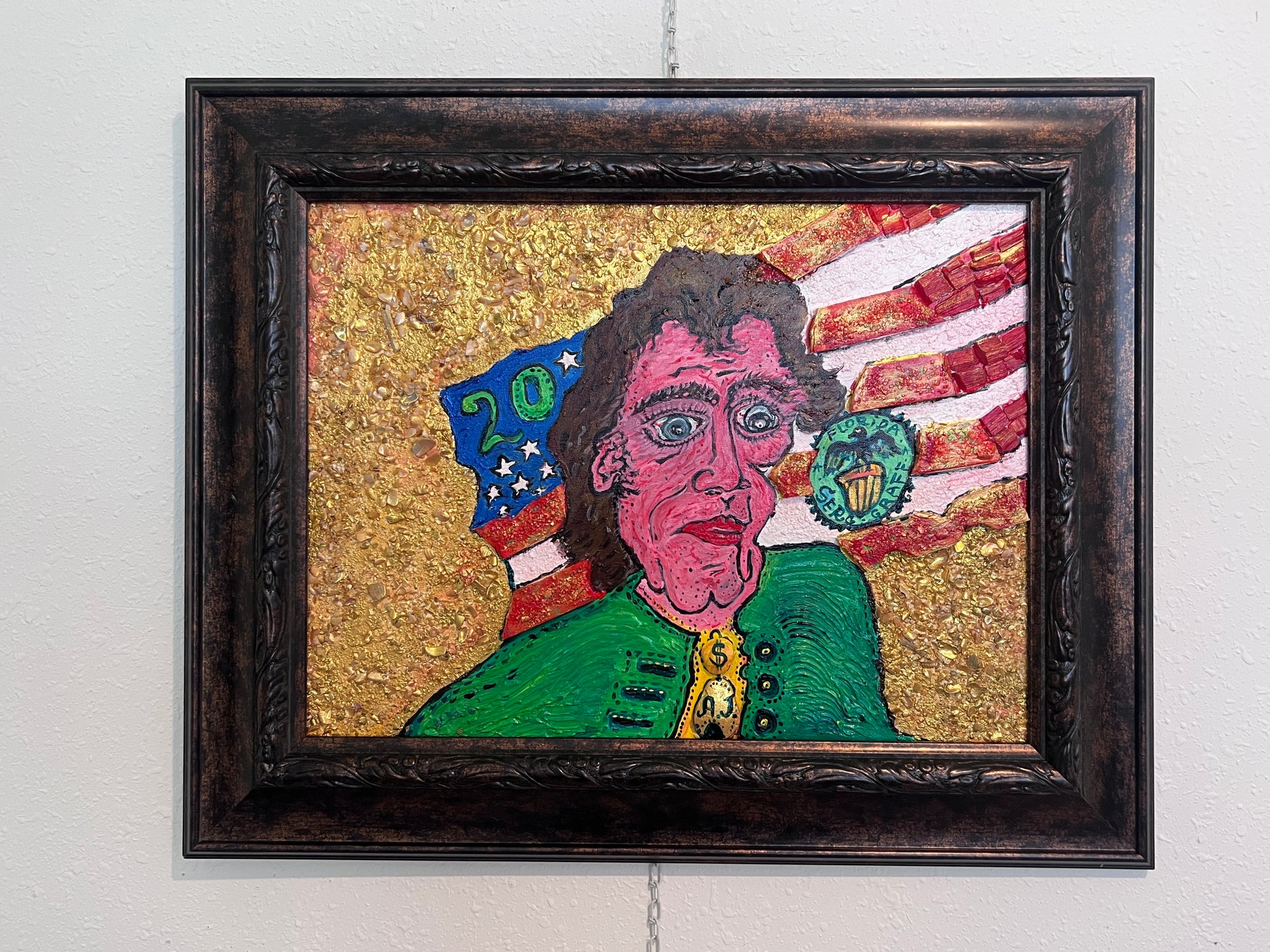 Surrounding him, bursts of gold glitter shimmer like currency, while vivid renditions of the American flag add layers of meaning around wealth, power, and national identity. Graff signs his work within a Florida emblem, infusing the piece with personal and regional character.