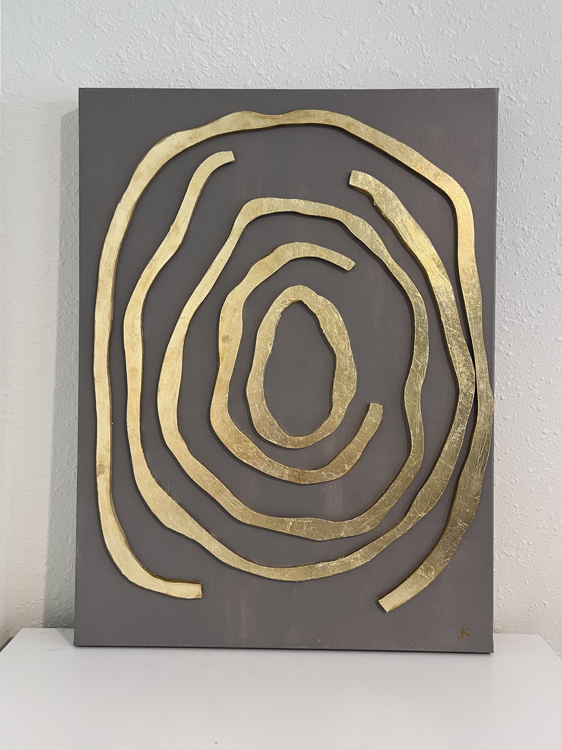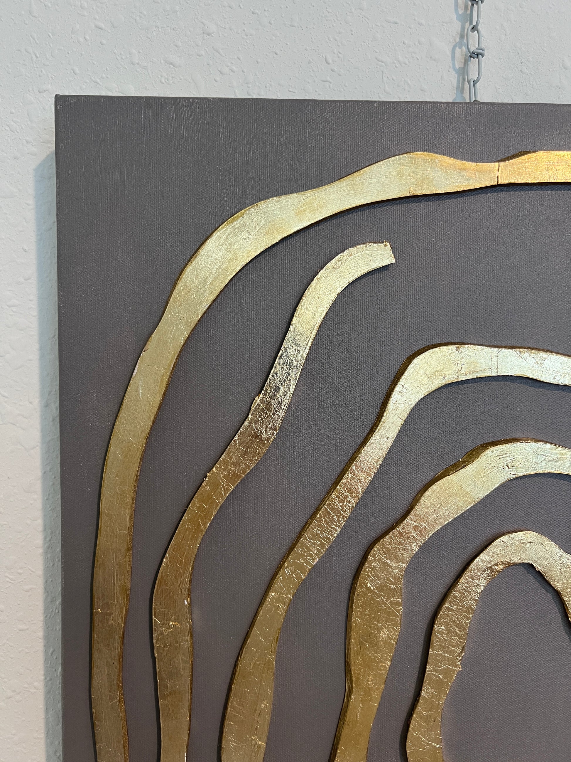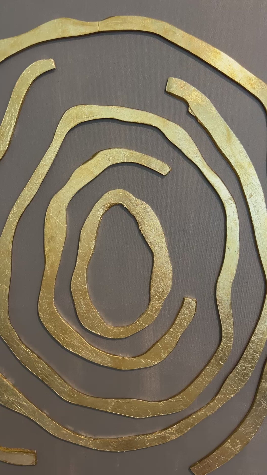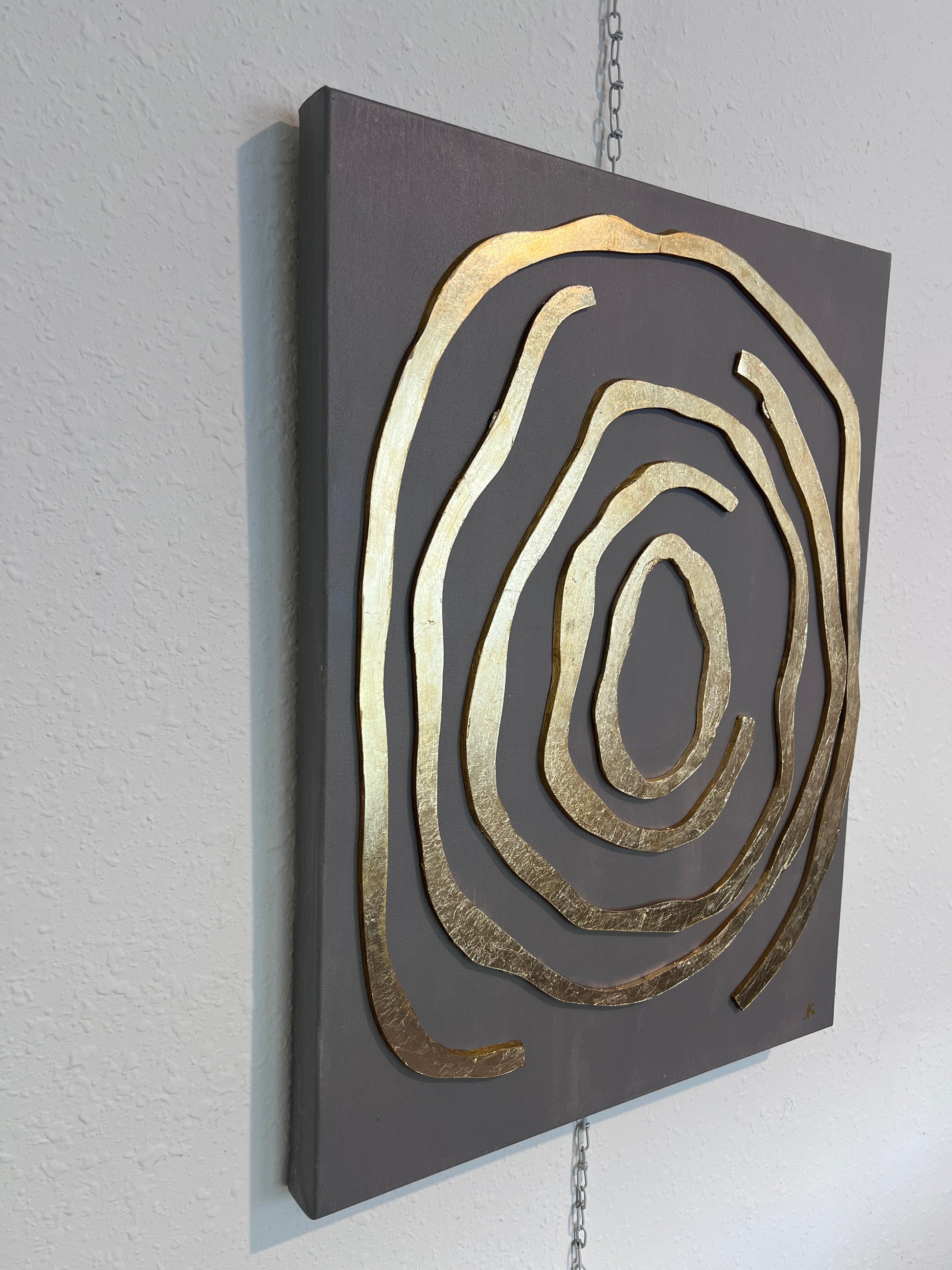 Kalen’s signature use of texture and metallics imbues the canvas with both elegance and mystery. Each ringed contour is carefully raised and gilded, offering a rich tactile dimension that changes with light and shadow. Bold yet minimalistic, the piece blends timeless symbolism with modern design—perfect for collectors of geometric, spiritual, or intuitive art.