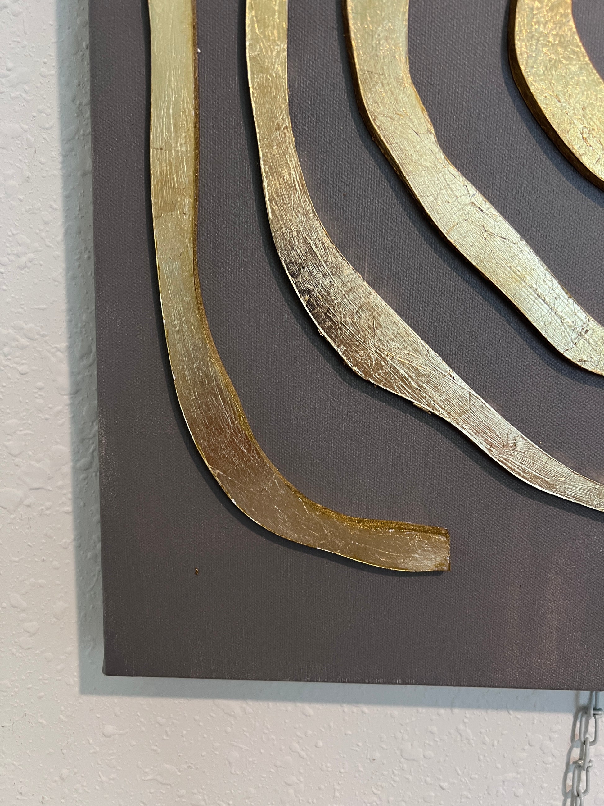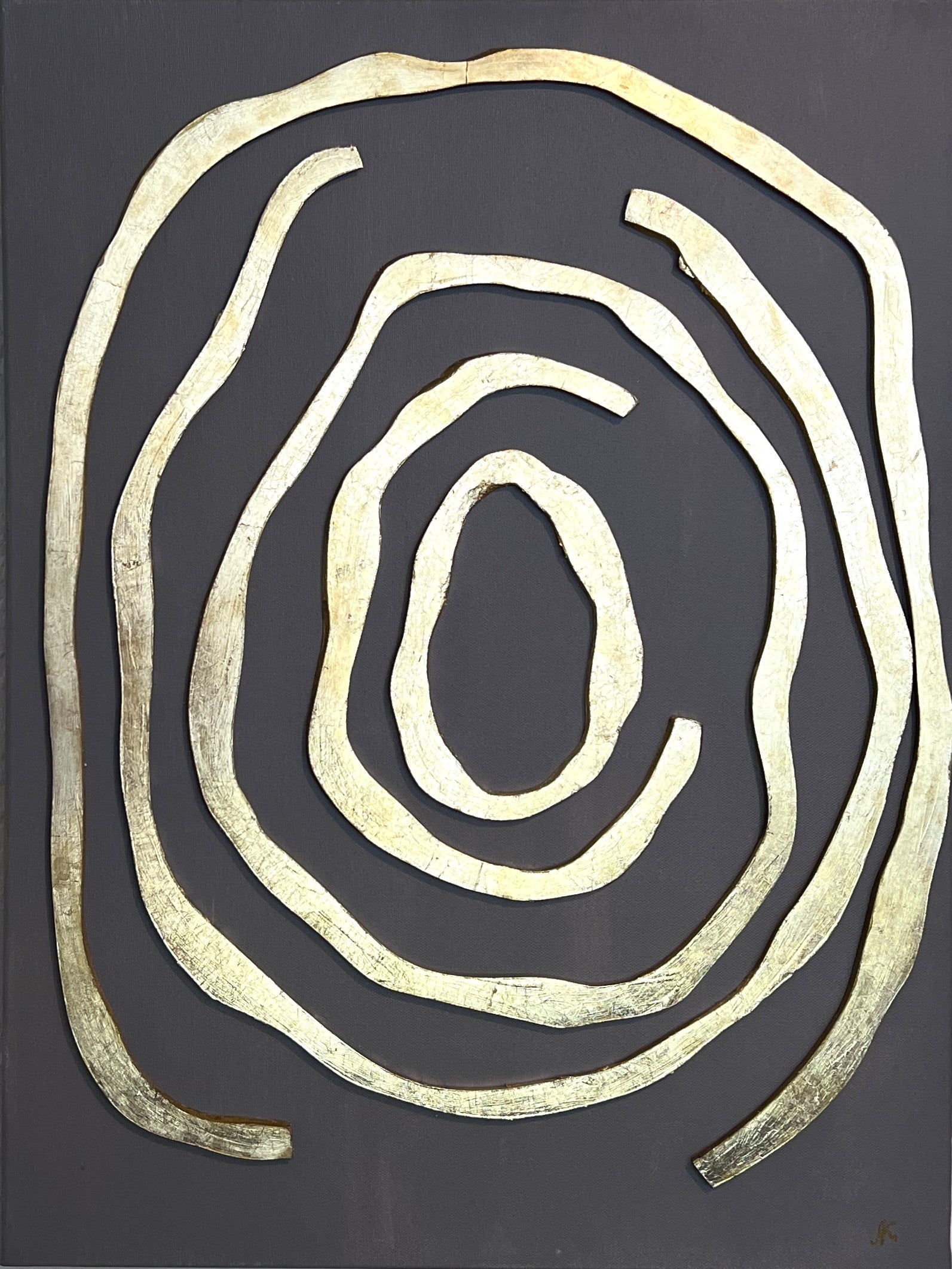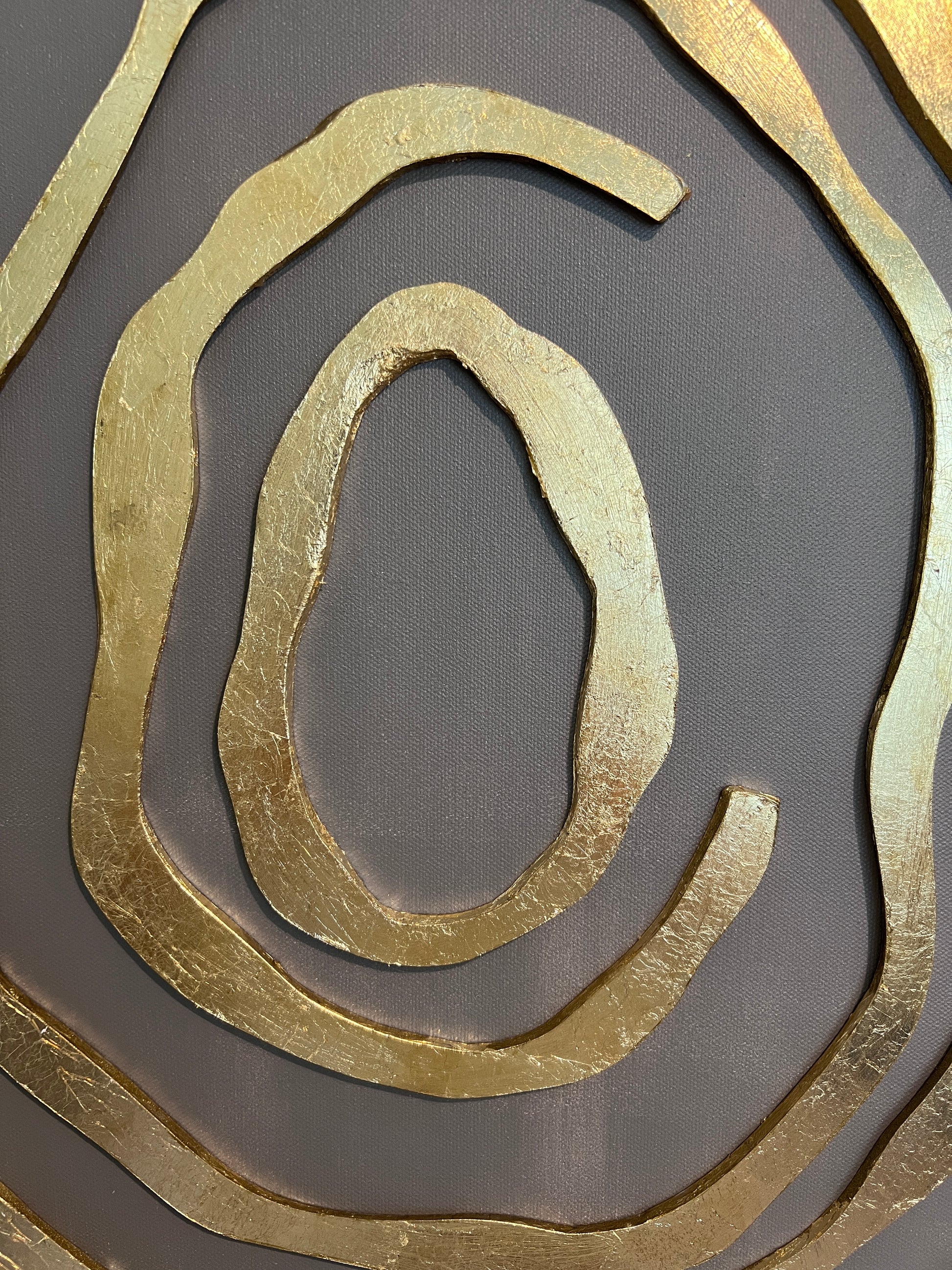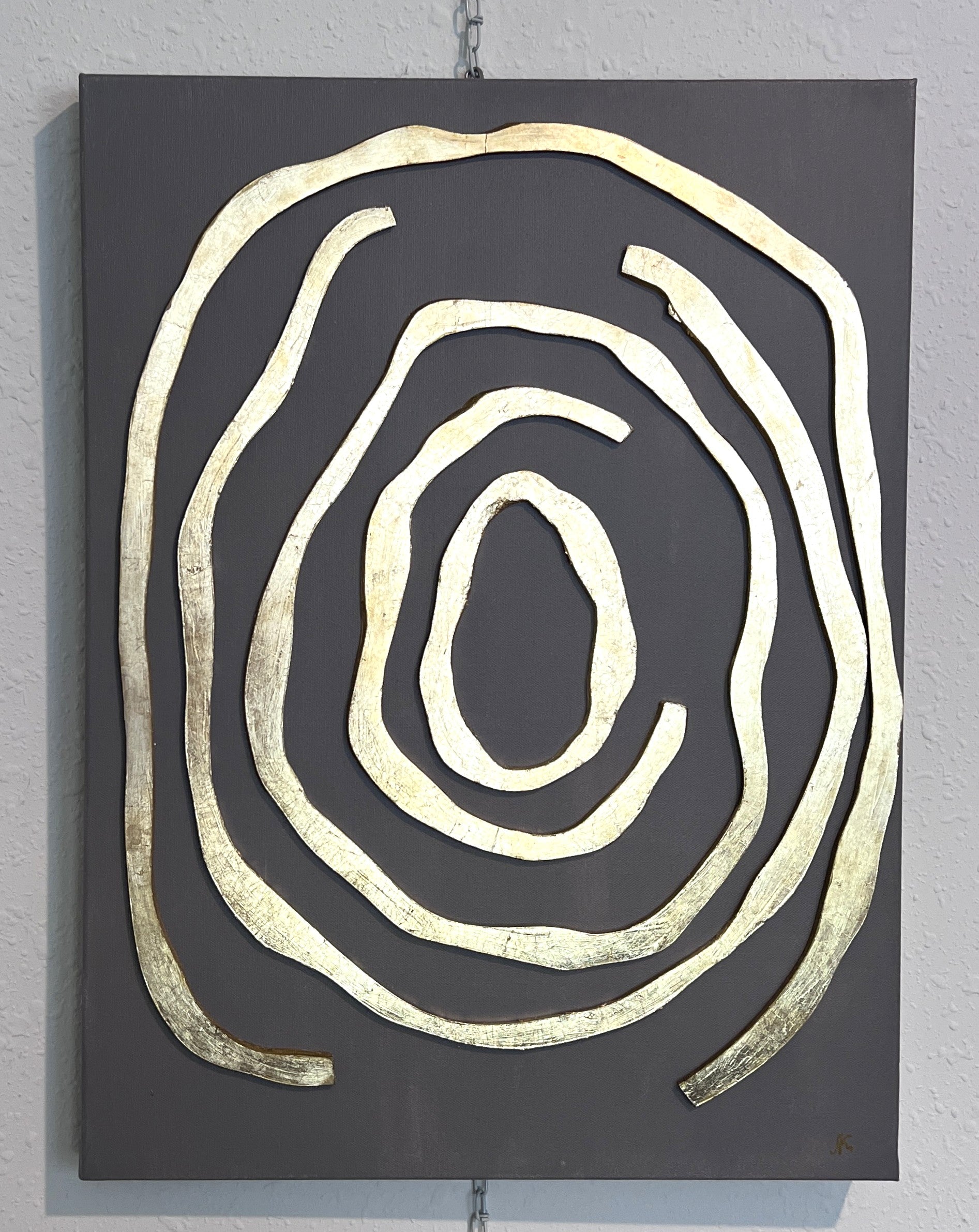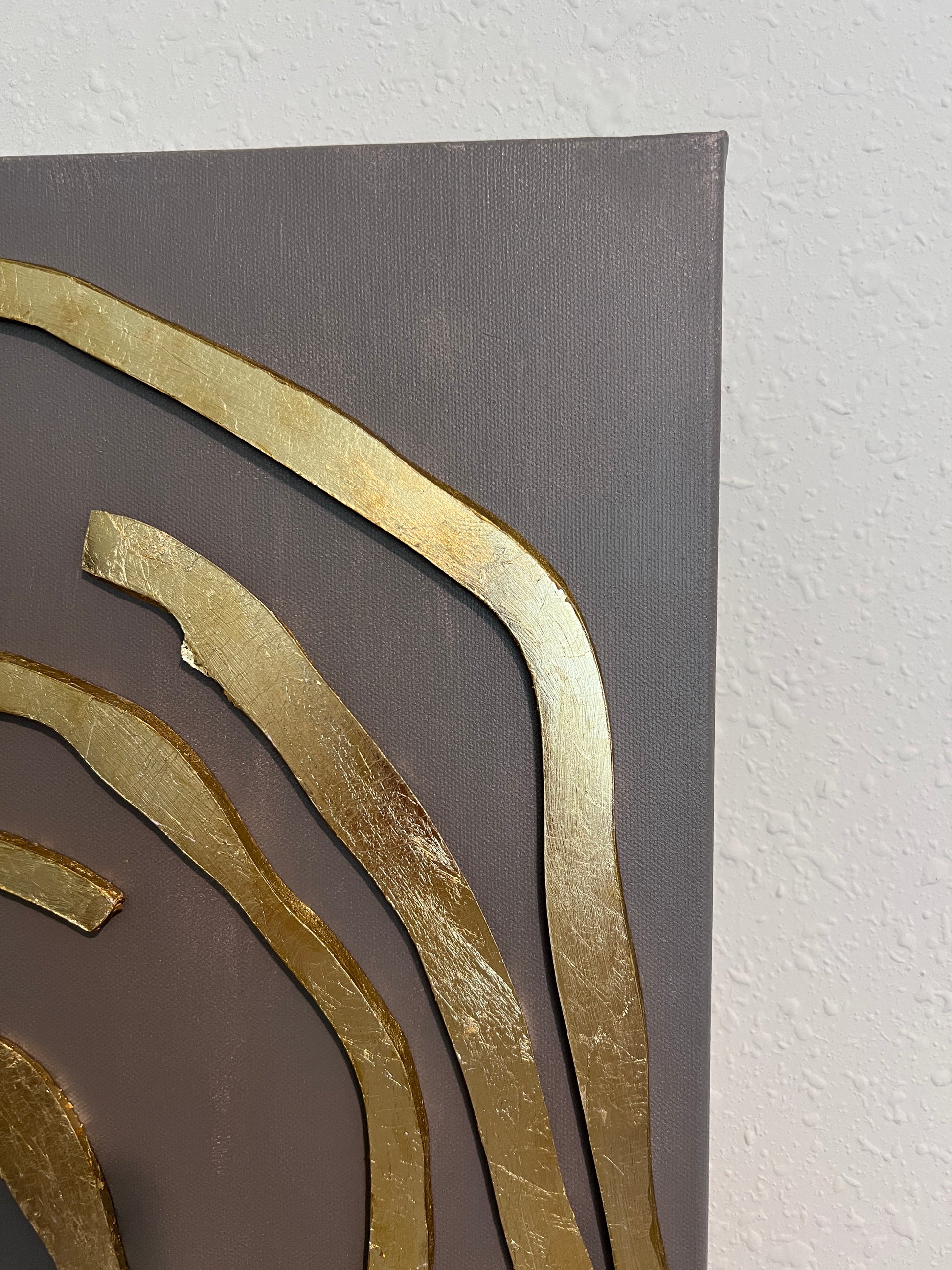 Kalen’s signature use of texture and metallics imbues the canvas with both elegance and mystery. Each ringed contour is carefully raised and gilded, offering a rich tactile dimension that changes with light and shadow. Bold yet minimalistic, the piece blends timeless symbolism with modern design—perfect for collectors of geometric, spiritual, or intuitive art.