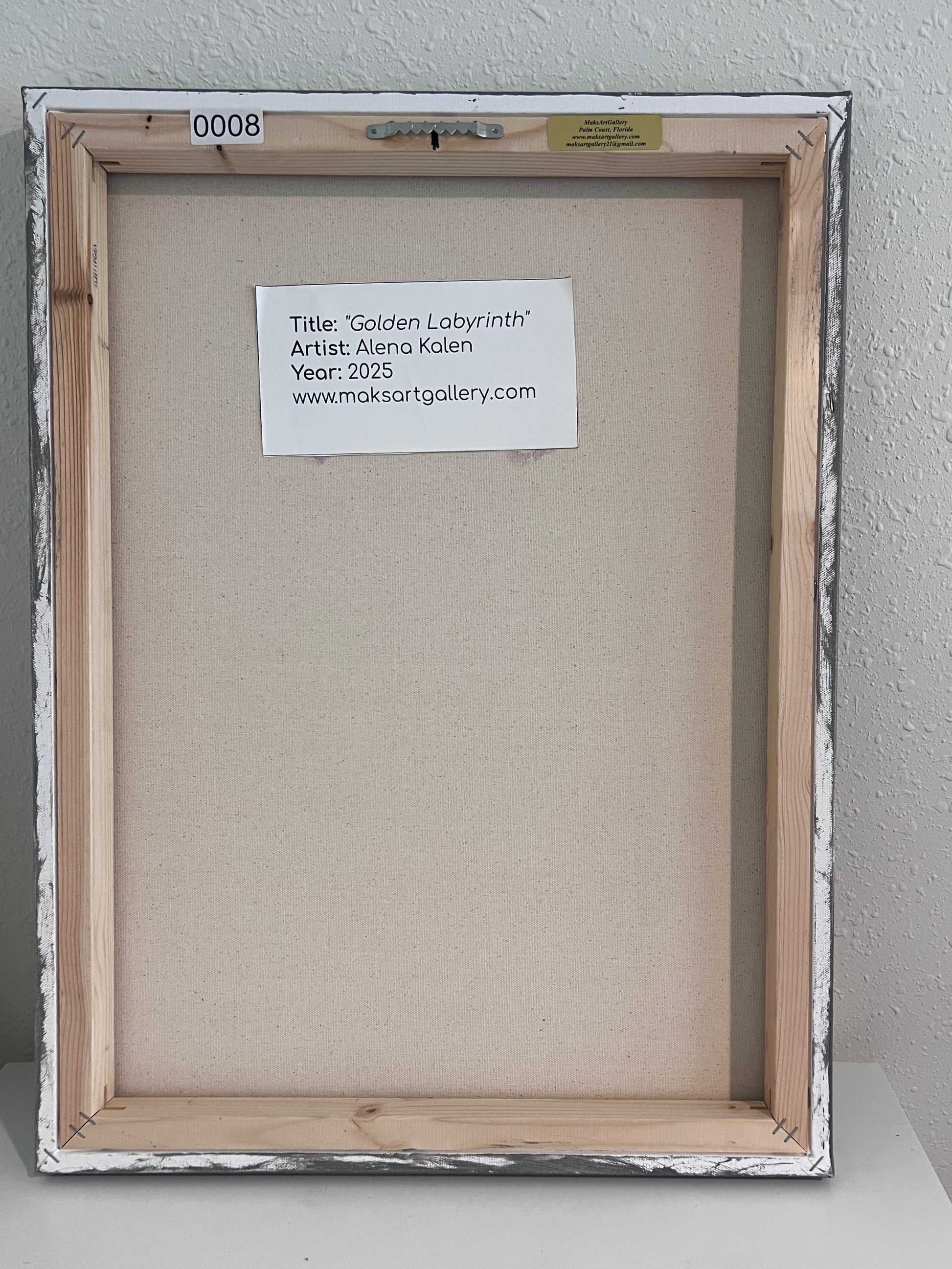 Unframed and ready to hang, “Golden Labyrinth” makes a commanding visual statement in any interior.