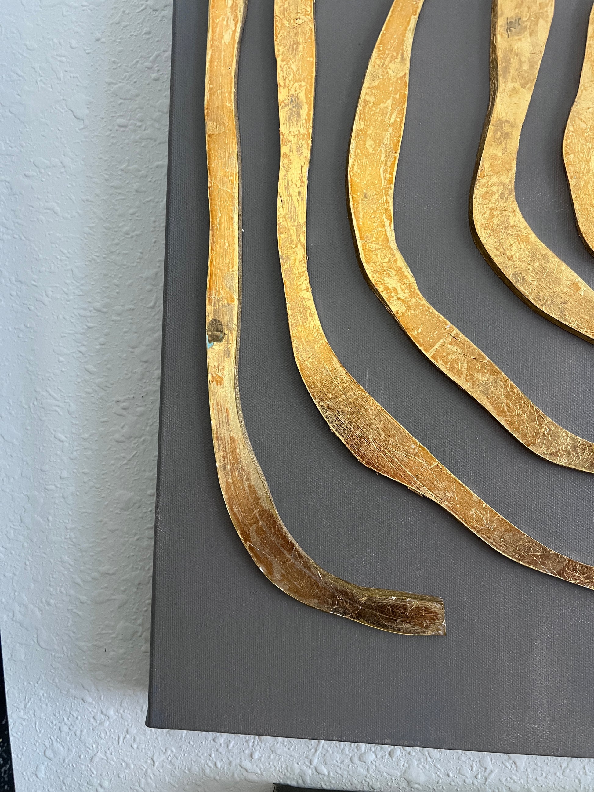 "Golden Labyrinth" is a striking original textured artwork by contemporary artist Alena Kalen, created in 2025. This modern abstract piece is a meditation on motion, flow, and the quiet complexity of inner landscapes. Featuring hand-applied, irregular golden lines over a deep gray matte background, the painting invites contemplation—like following the paths of a sacred fingerprint or traversing an ancient maze carved in gold.