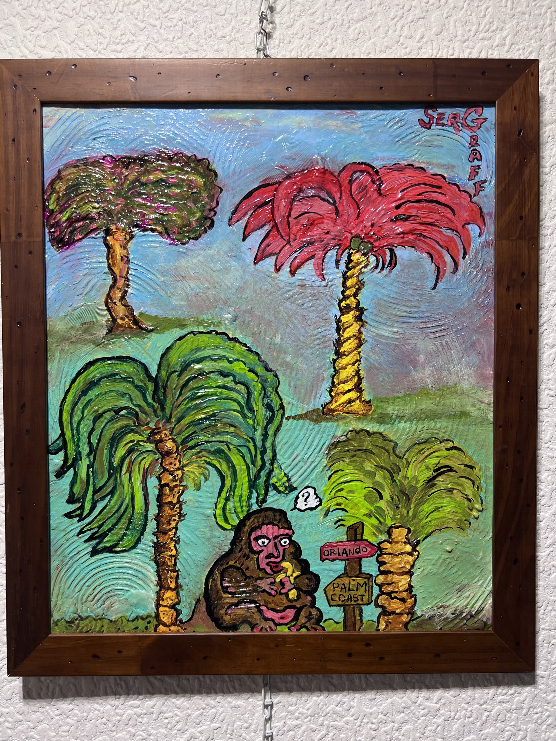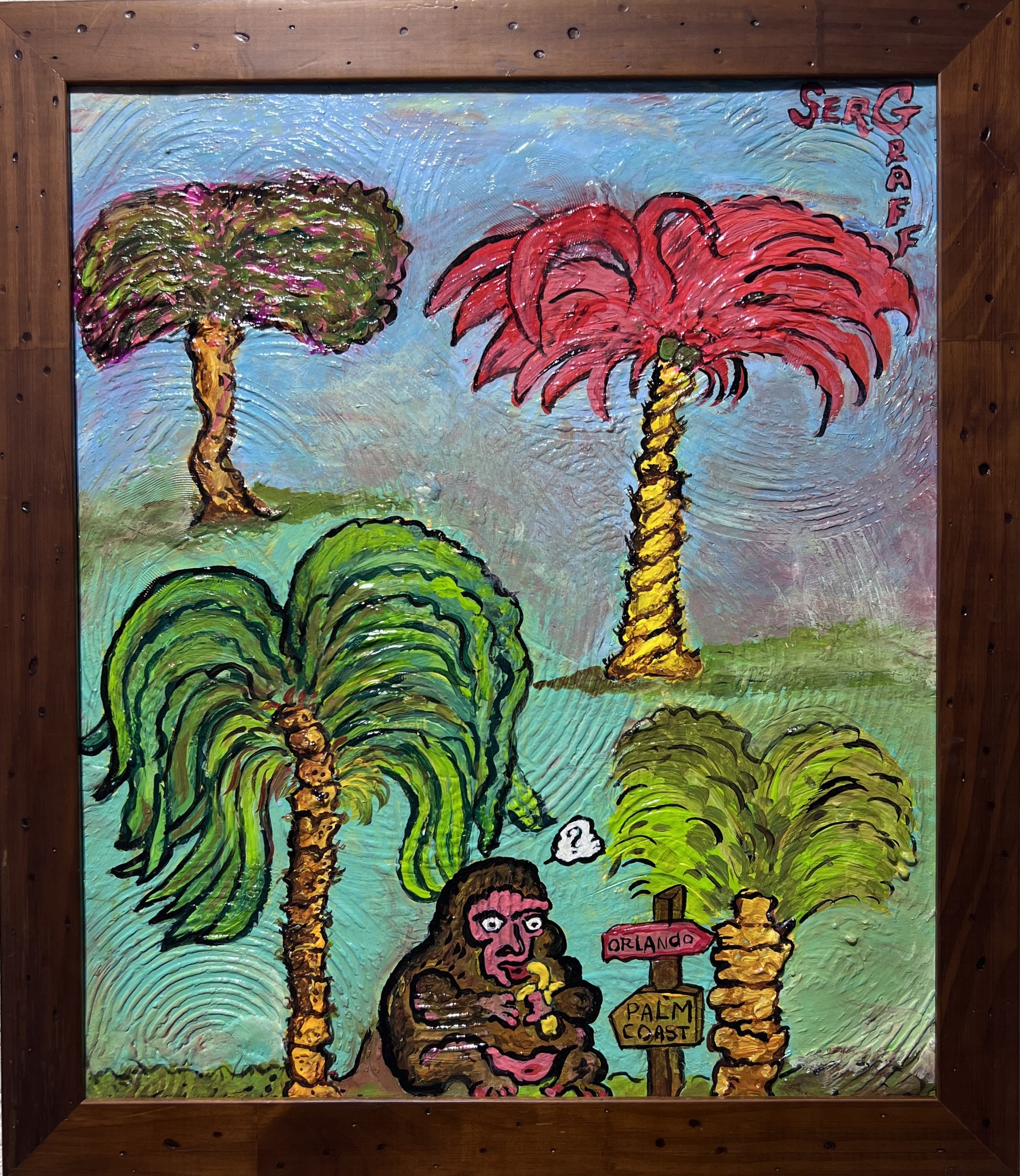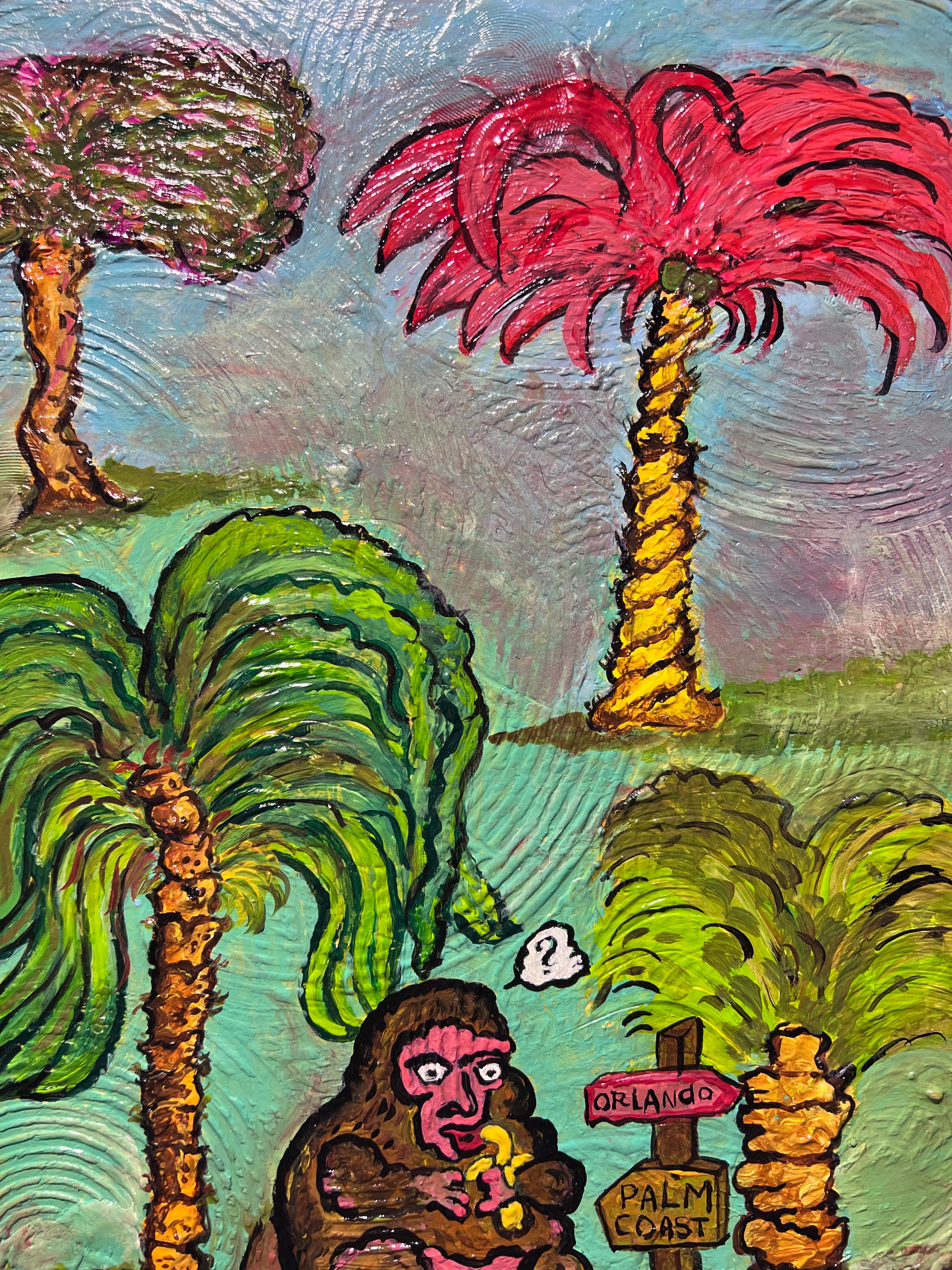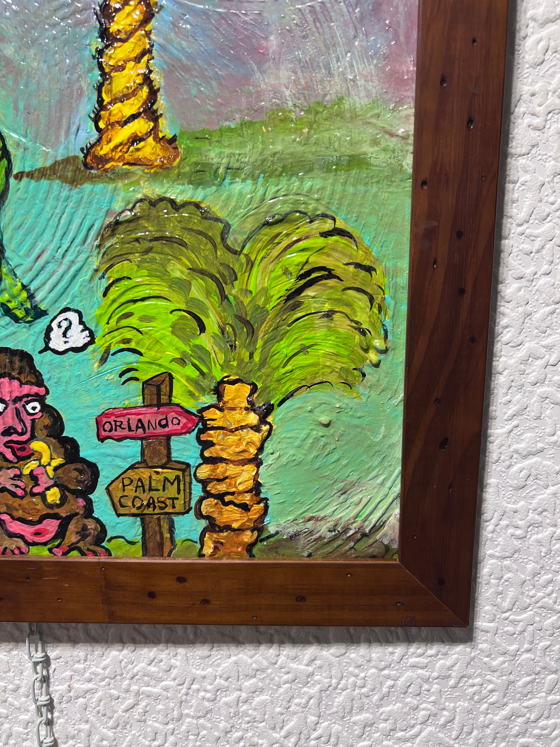 Amidst this surreal grove sits a comical monkey figure, rendered with Graff’s signature exaggerated features and expressive brushwork. The monkey is seen munching on a banana, while a hand‑painted signpost points in two directions: “Orlando” and “Palm Coast,” adding a layer of humor and narrative to the scene. The painting blends bright, tropical whimsy with a textured, abstract surface that invites close inspection and sparks curiosity.