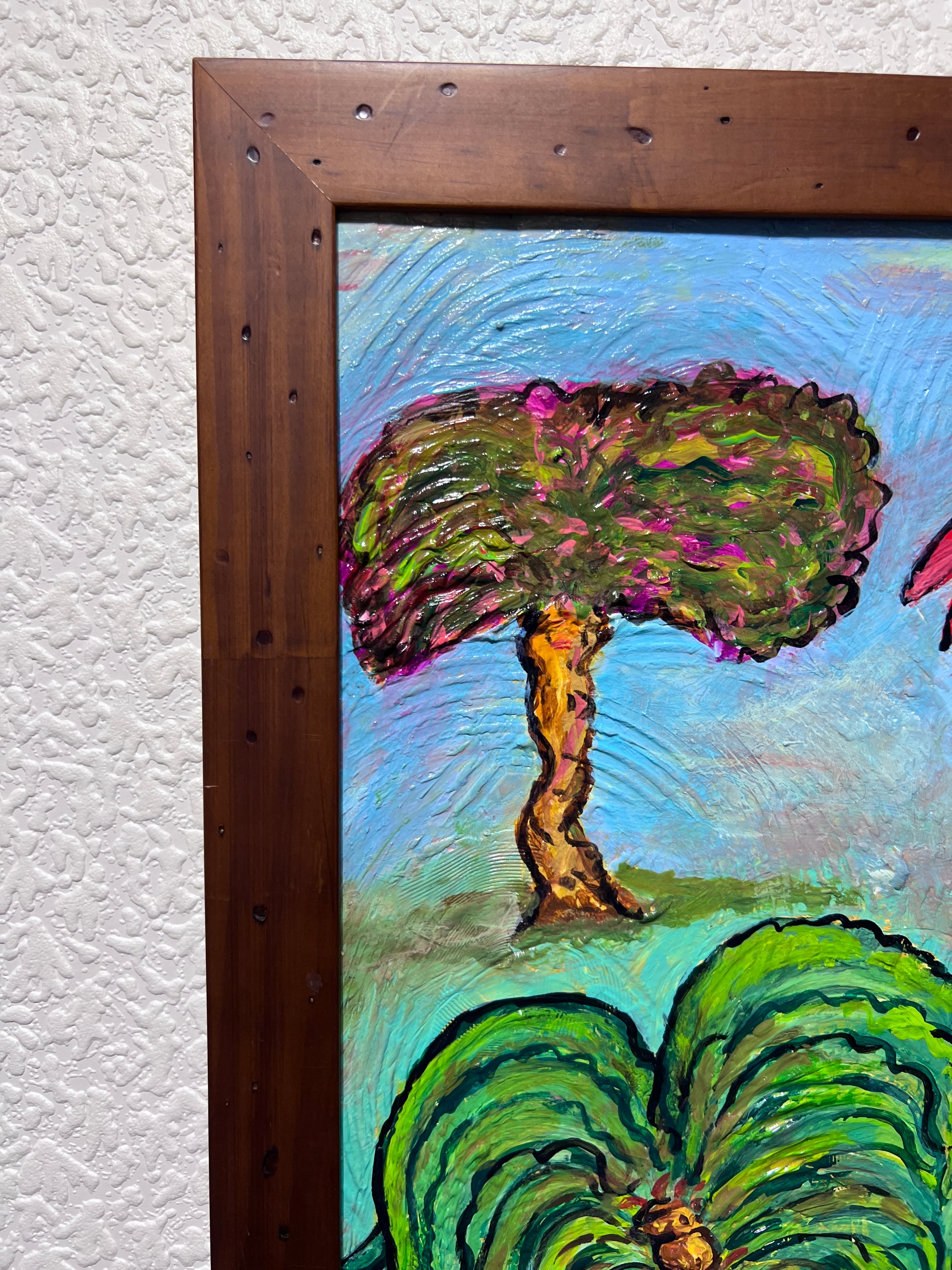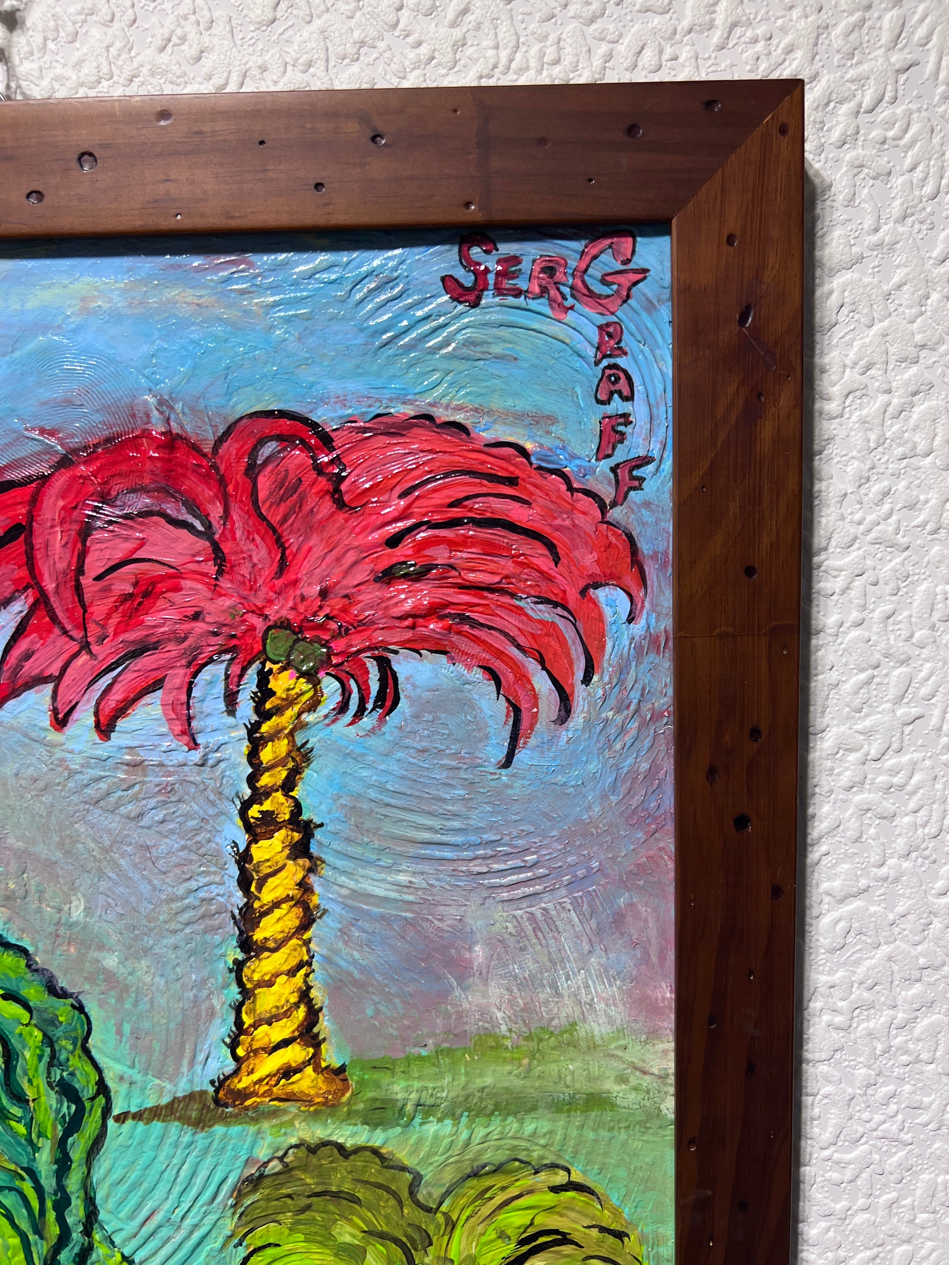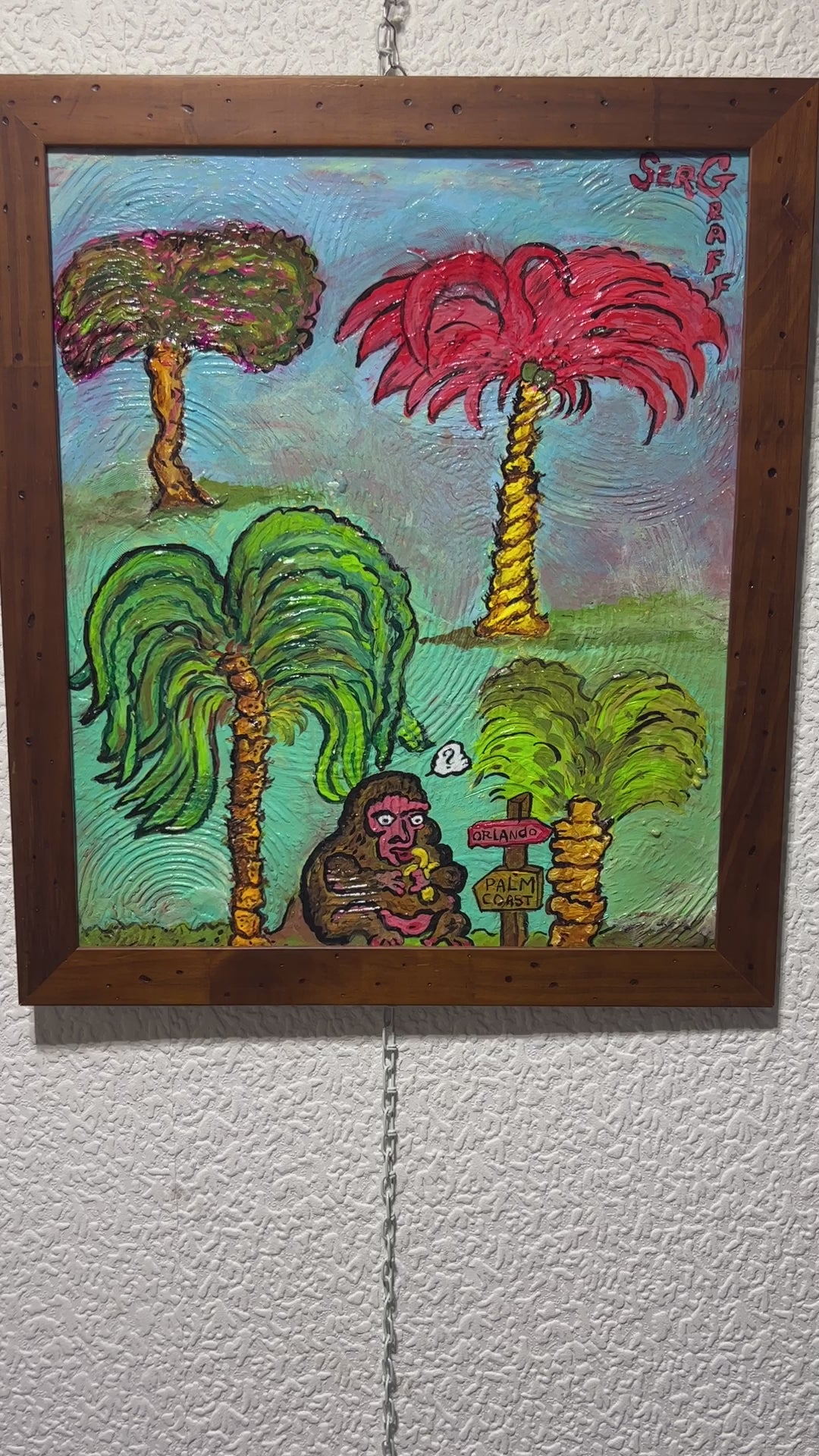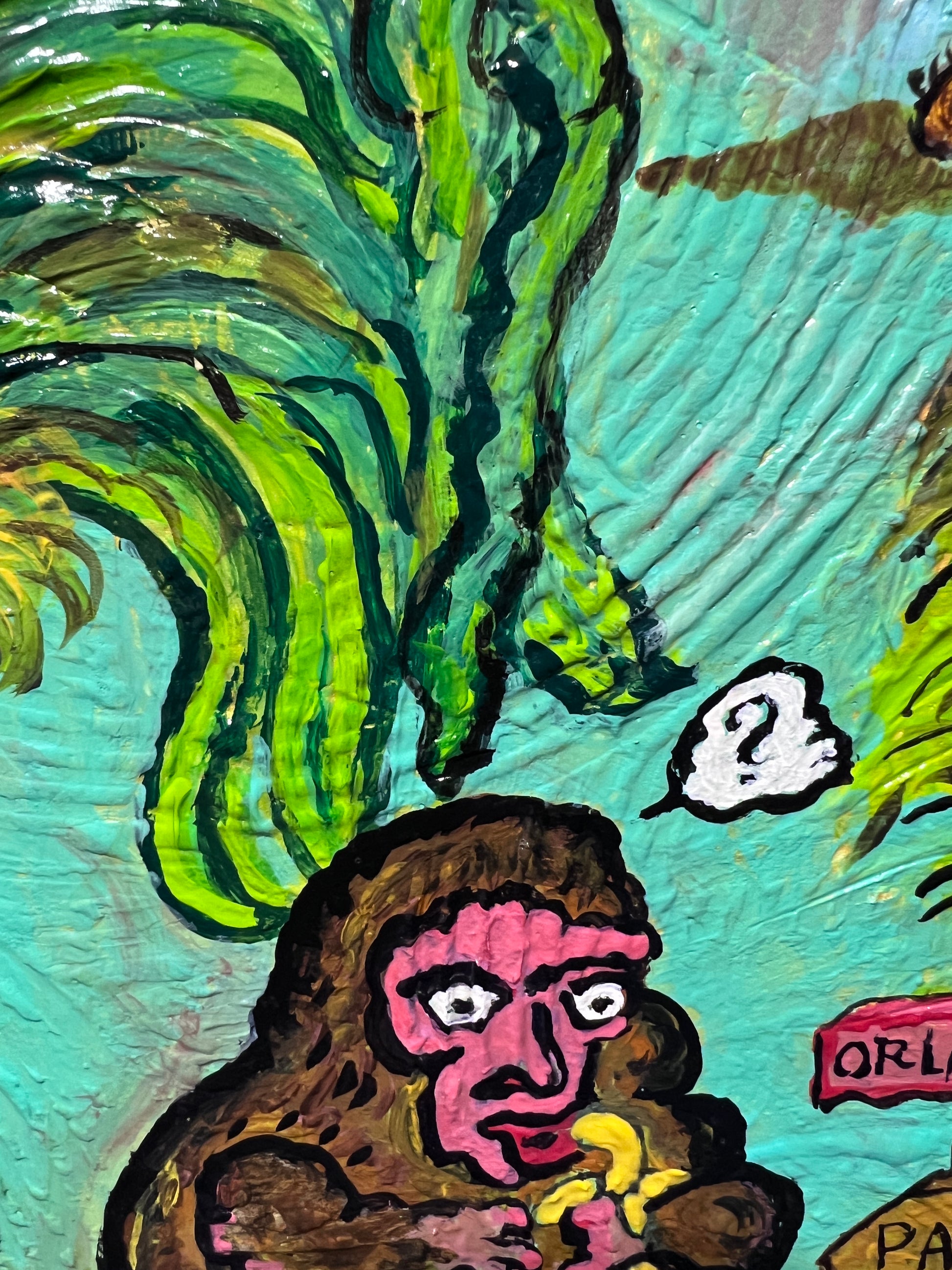 Amidst this surreal grove sits a comical monkey figure, rendered with Graff’s signature exaggerated features and expressive brushwork. The monkey is seen munching on a banana, while a hand‑painted signpost points in two directions: “Orlando” and “Palm Coast,” adding a layer of humor and narrative to the scene. The painting blends bright, tropical whimsy with a textured, abstract surface that invites close inspection and sparks curiosity.