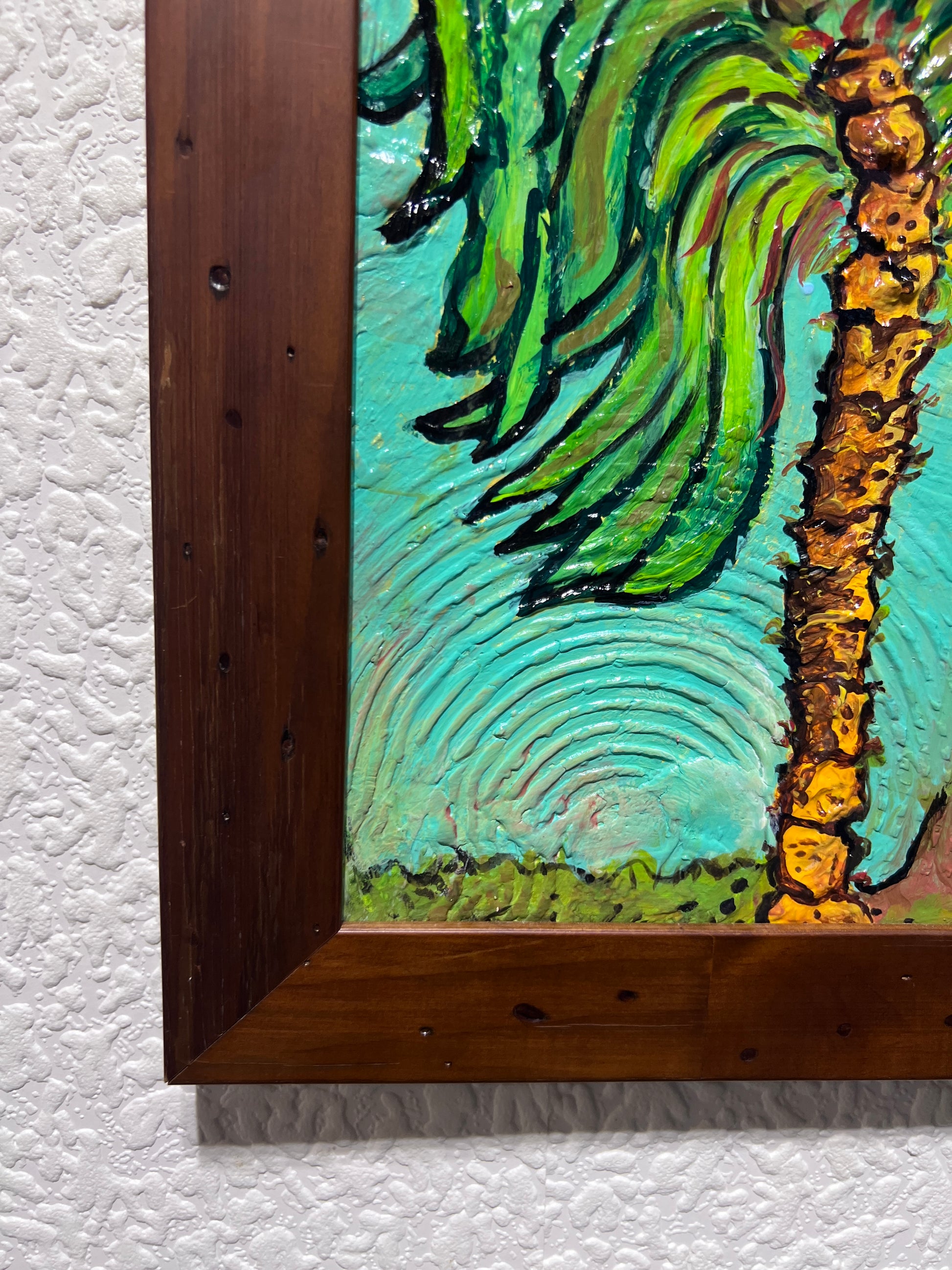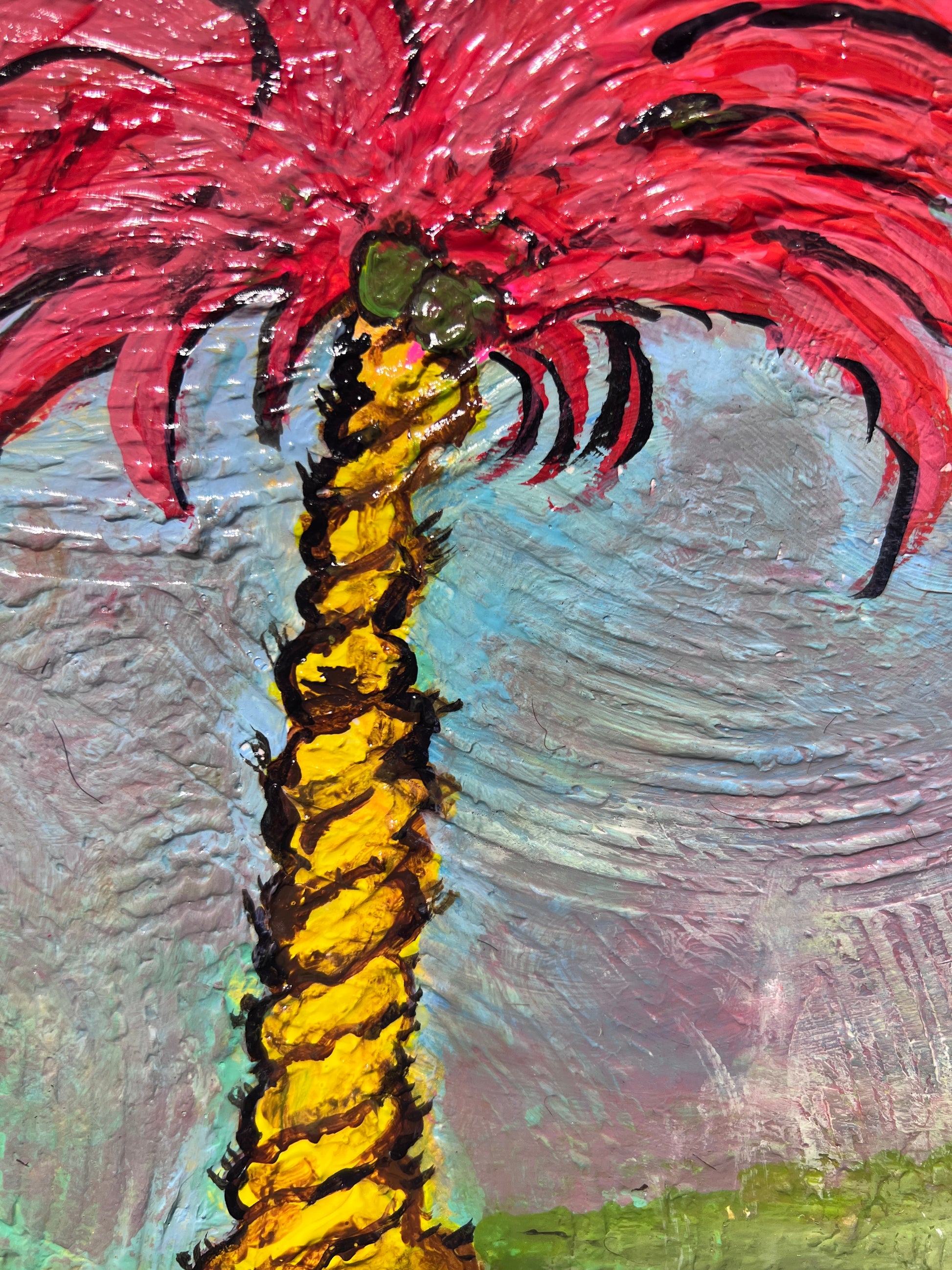 In this playful and imaginative composition, a series of vividly colored palm trees sway across a textured, swirling background of turquoise and soft lavender. Each palm tree is painted with bold impasto strokes—lush greens, fiery reds, and earthy browns—giving them a lively, almost animated character.