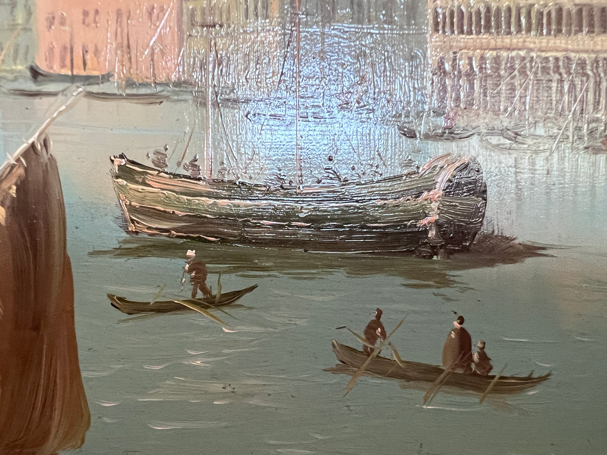 The composition includes gondolas, merchant vessels, and figures strolling along the promenade, creating a dynamic yet harmonious view of daily life by the lagoon. The richly textured brushwork, delicate detailing, and warm palette make this a standout piece for collectors of Italian art or classical maritime landscapes.