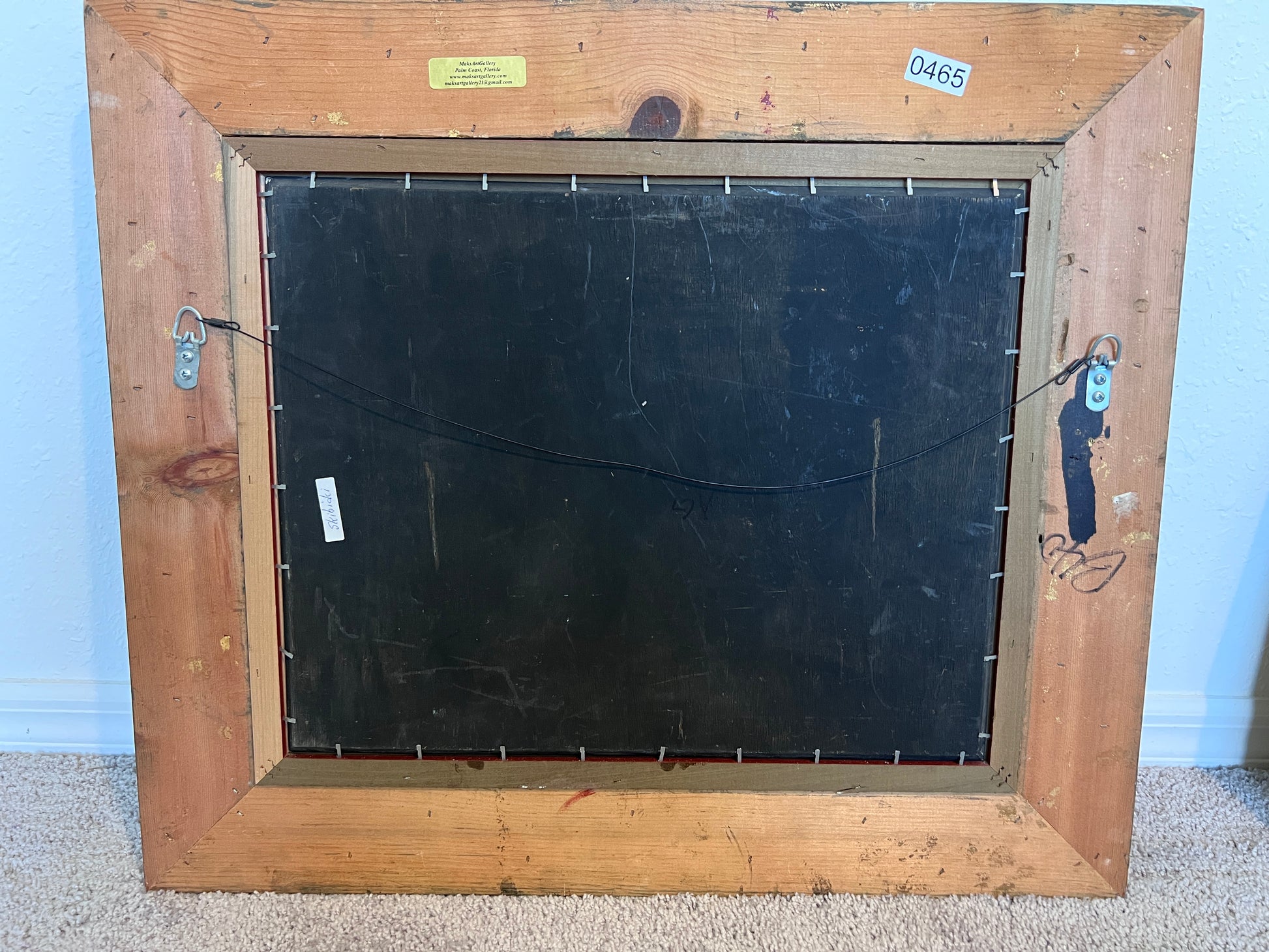 Good antique condition with light, age-consistent wear on the frame and minor surface marks typical for a vintage artwork. The colors remain rich, and the board is stable.