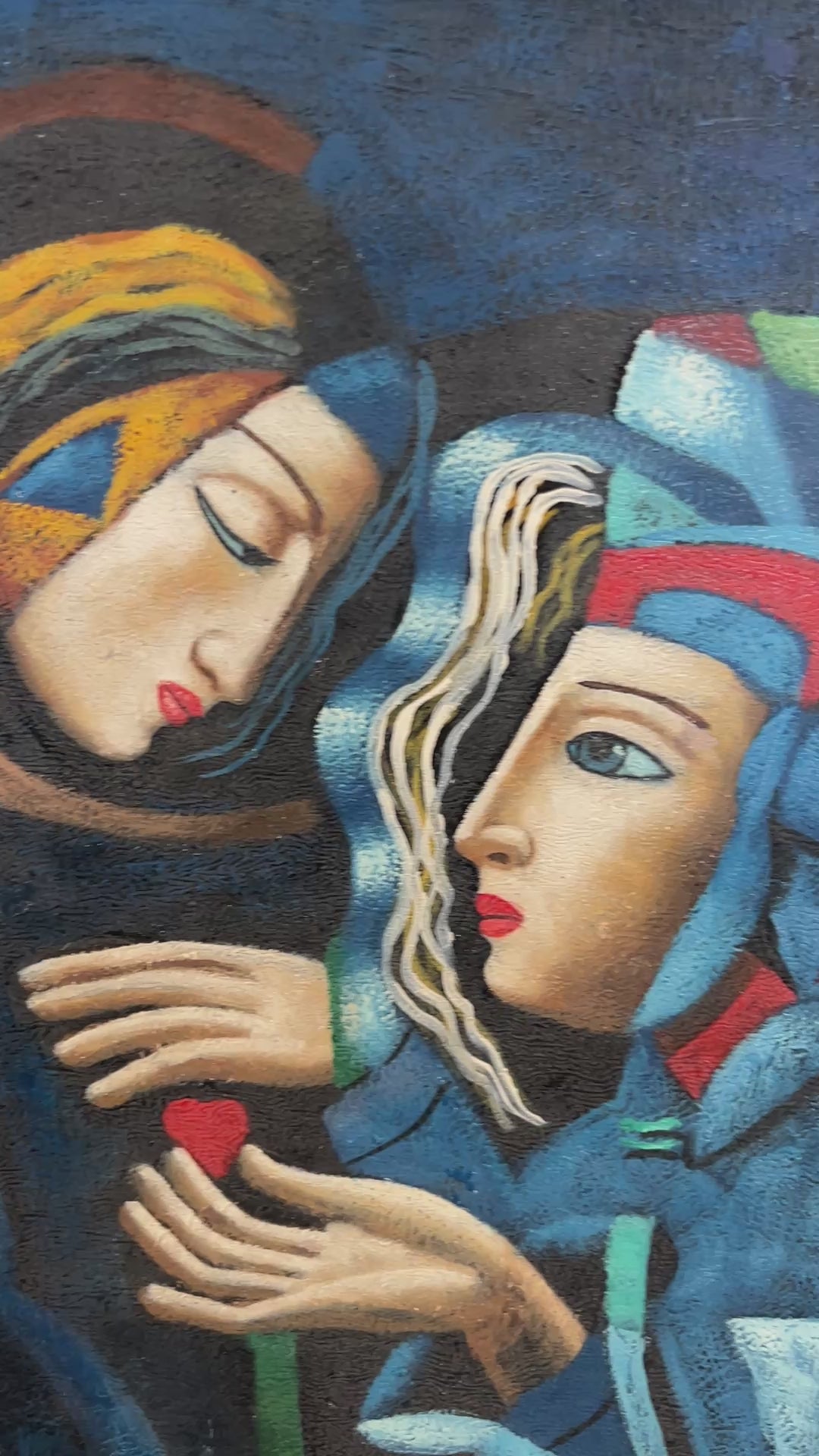 Executed in a bold palette dominated by deep blues, emerald greens, and touches of warm reds and ochres, the painting achieves a dramatic sense of depth and atmosphere. The faces, rendered in profile and three-quarter view, reflect both tenderness and intensity, while the fractured cubist style imbues the work with a modernist energy reminiscent of early 20th-century European avant-garde.