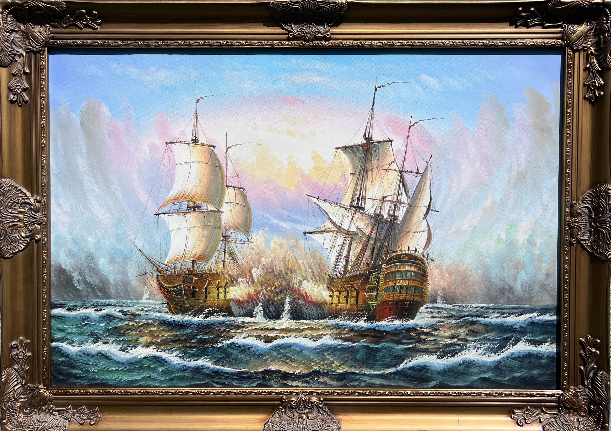 This powerful maritime oil painting depicts an intense naval battle between two grand 18th-century ships locked in combat. Billowing smoke and flashes of cannon fire illuminate the sails, while turbulent seas crash beneath their wooden hulls. The artist captures the chaos and glory of seafaring warfare with remarkable precision — from the taut rigging to the fiery explosions that light the horizon.
