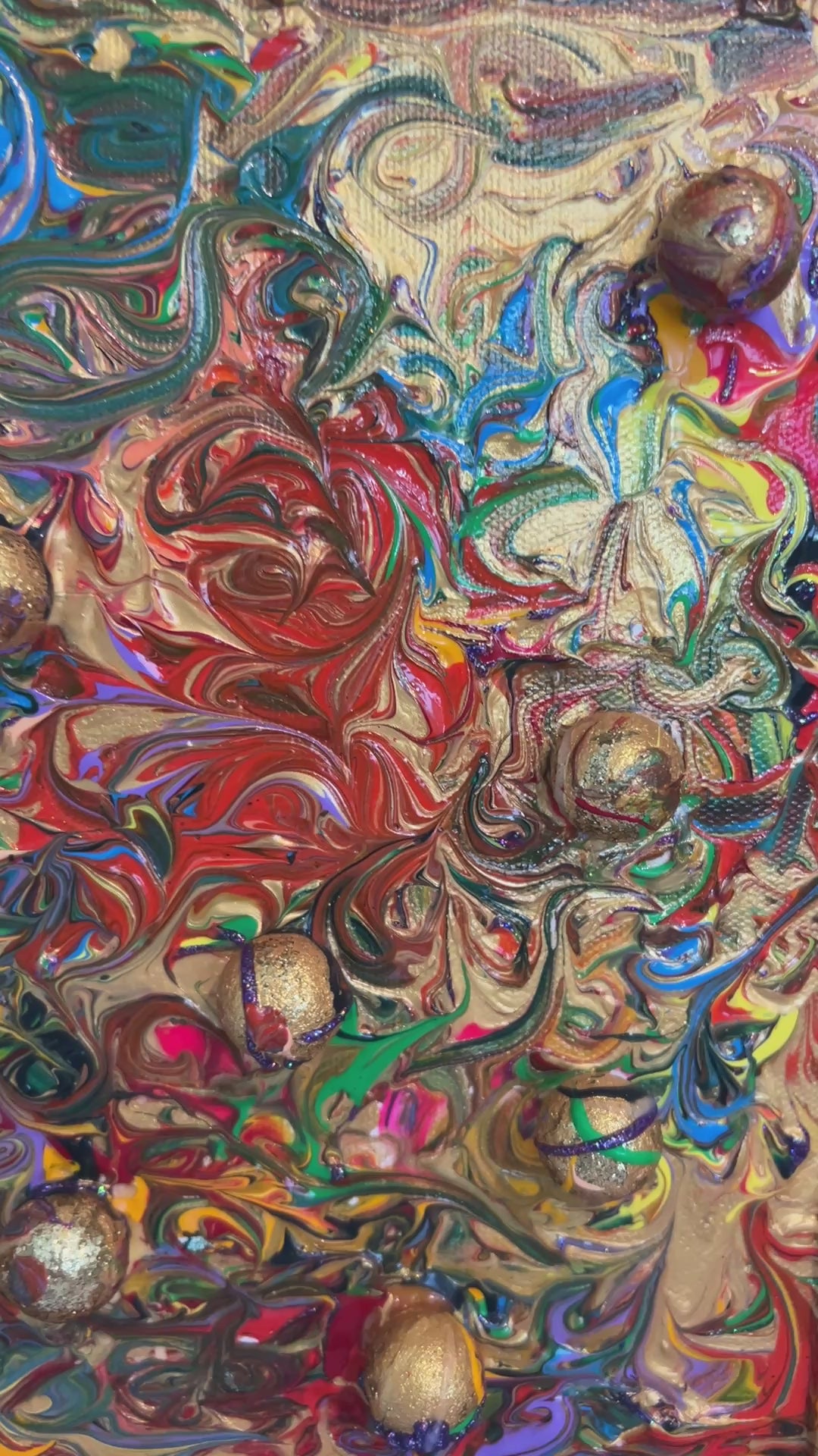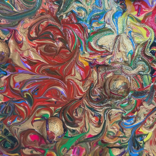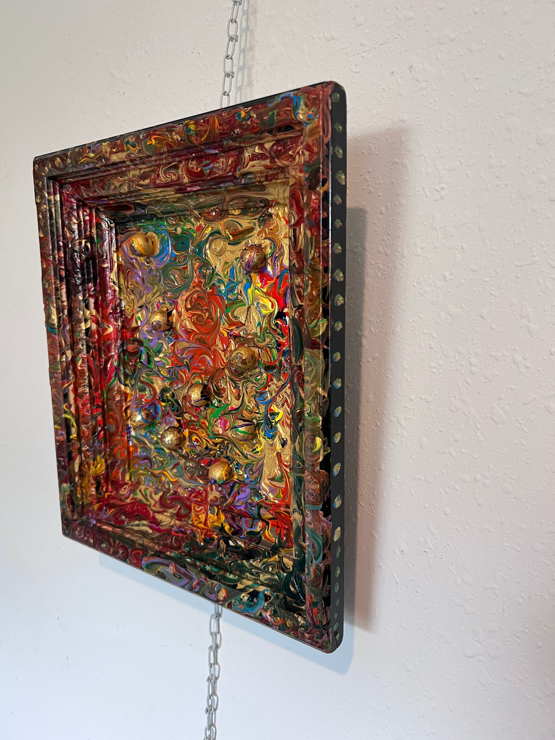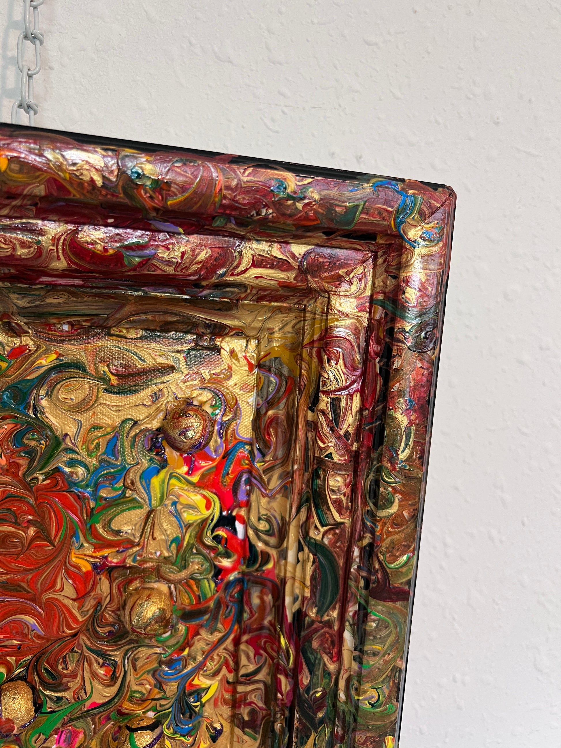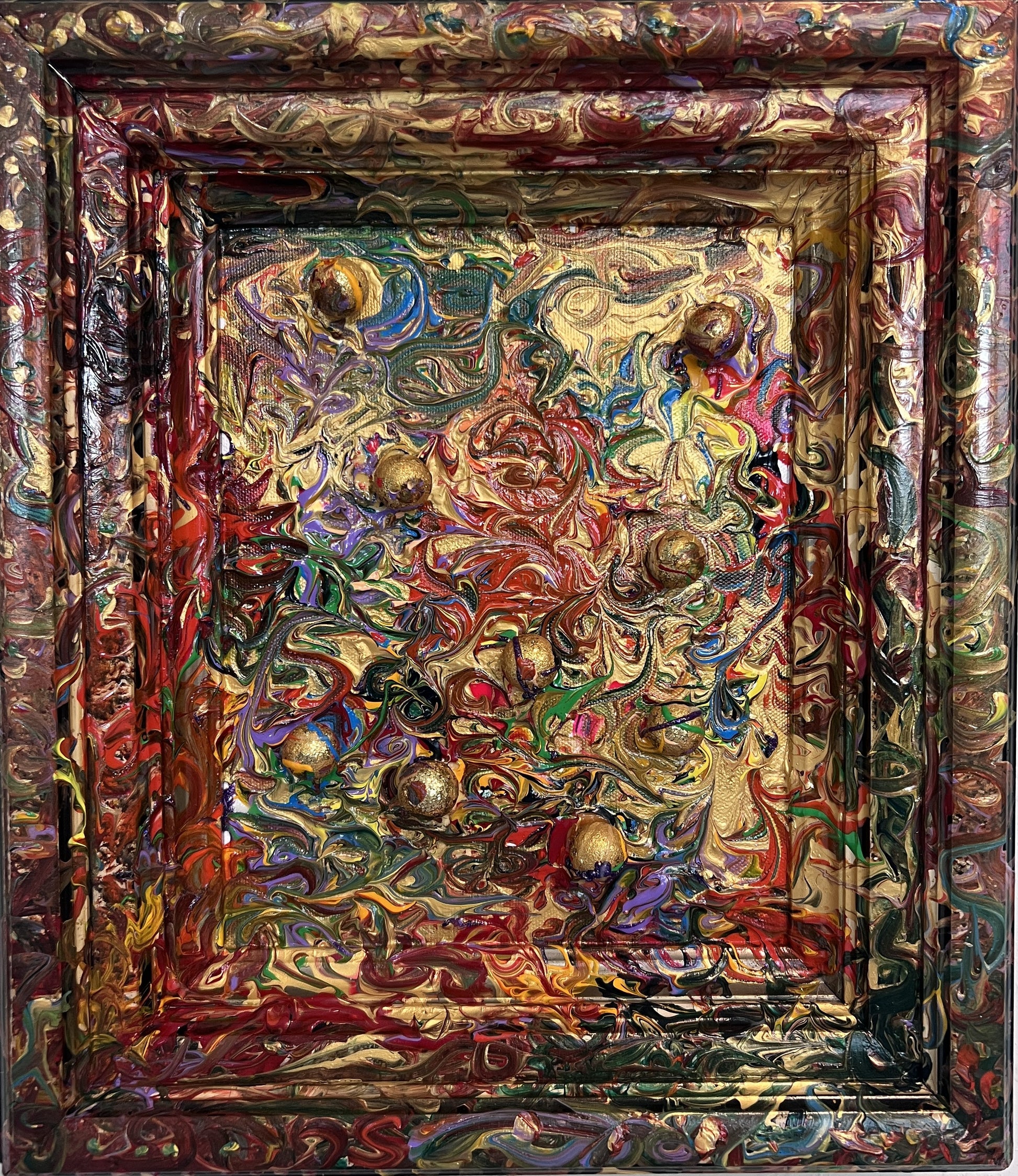 Embellished with embedded gold spheres, the artwork’s sculptural qualities extend into the frame itself — painted as a seamless continuation of the canvas, making the entire piece feel like one unified storm of energy. The ornate texture and metallic palette create a kaleidoscopic experience that shifts with light, drawing the eye into new depths upon every viewing.