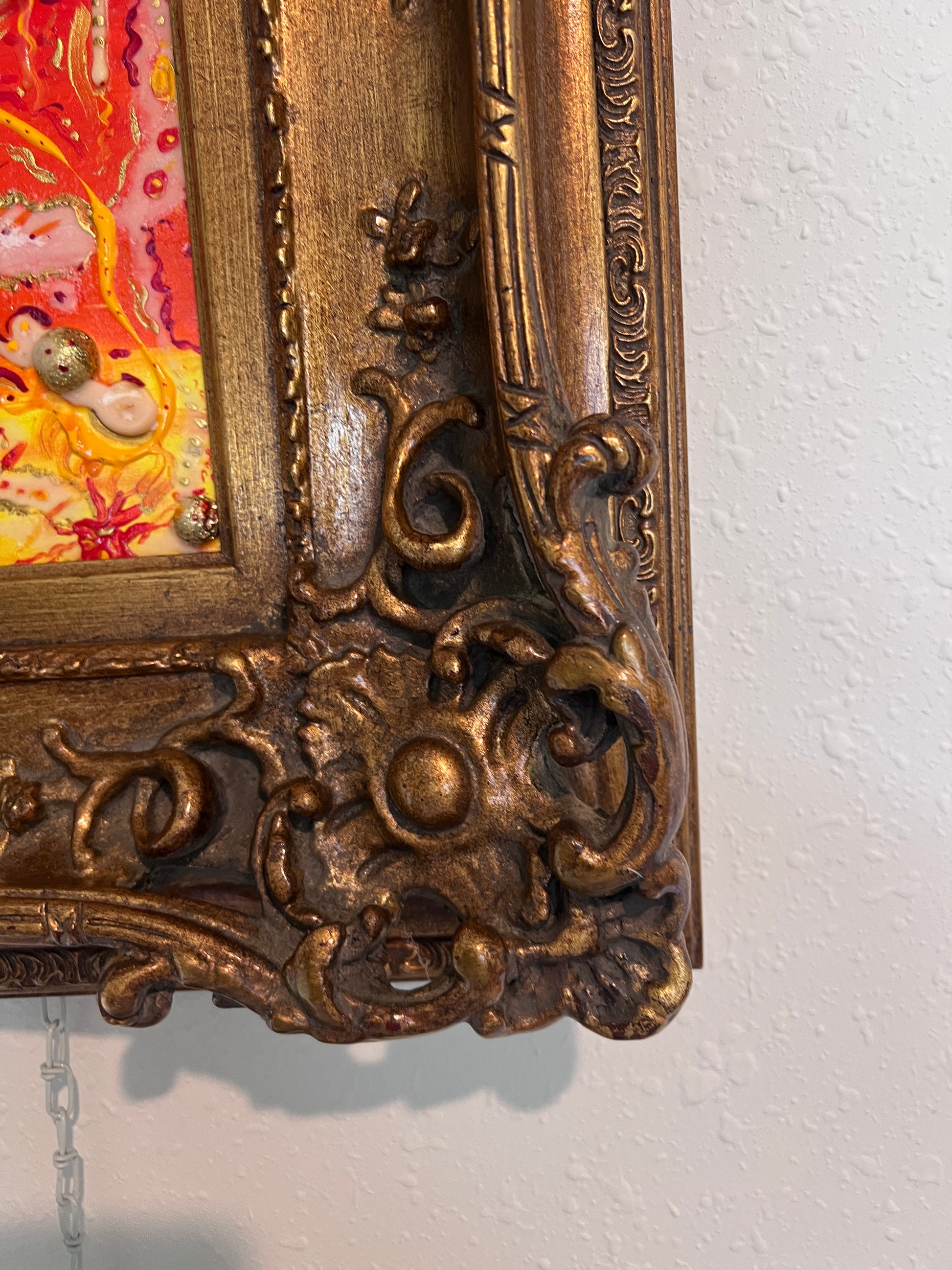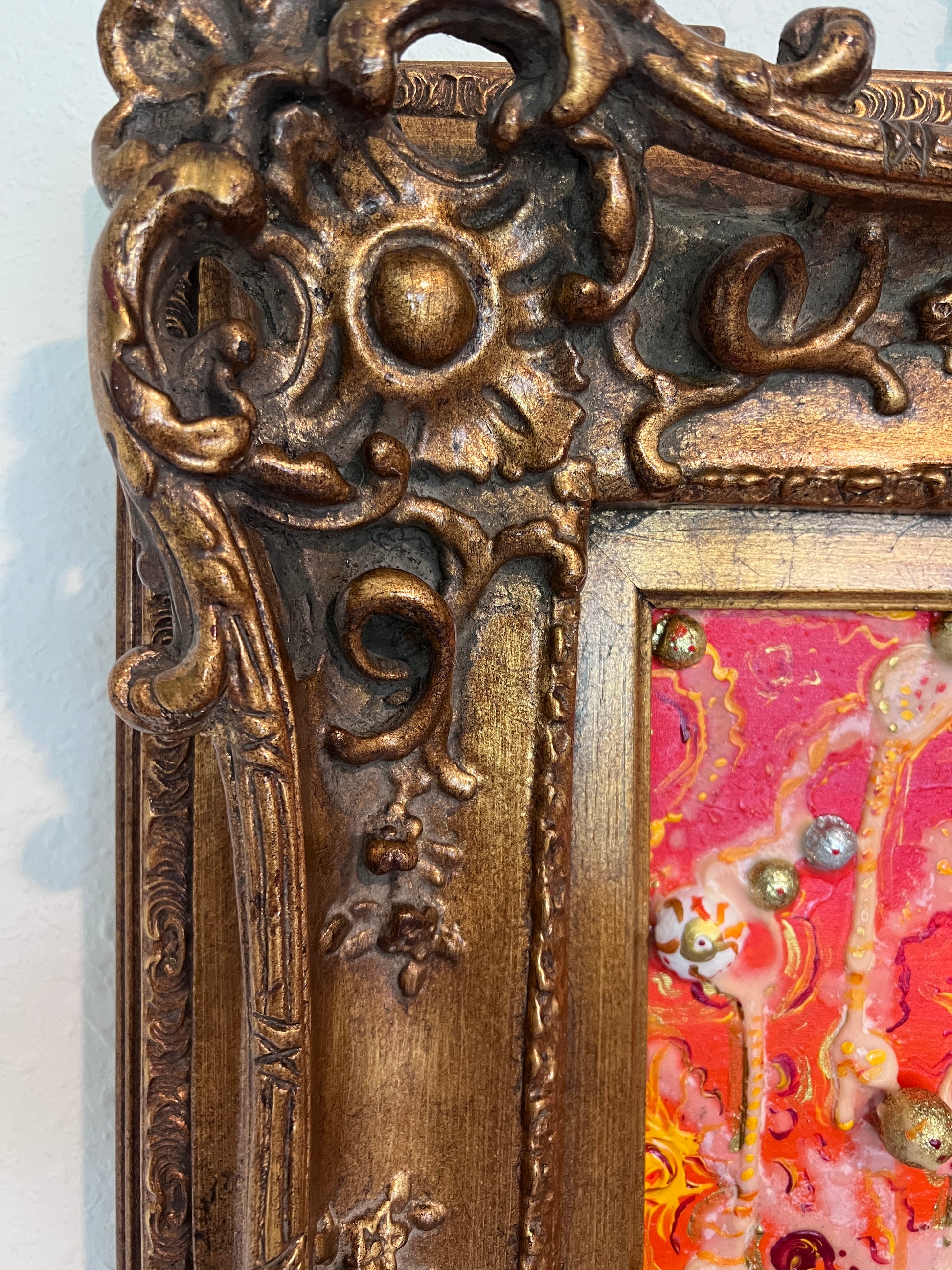 Graff’s intuitive layering of acrylic, resin, and raised elements forms a luminous, tactile surface that feels alive. Each orb glows with its own eccentric gravity, connected by molten trails of symbolic circuitry. The ornate antique-style frame, in deep bronze-gold with elaborate floral scrollwork, elevates the piece to a theatrical artifact — part gallery treasure, part sacred talisman.