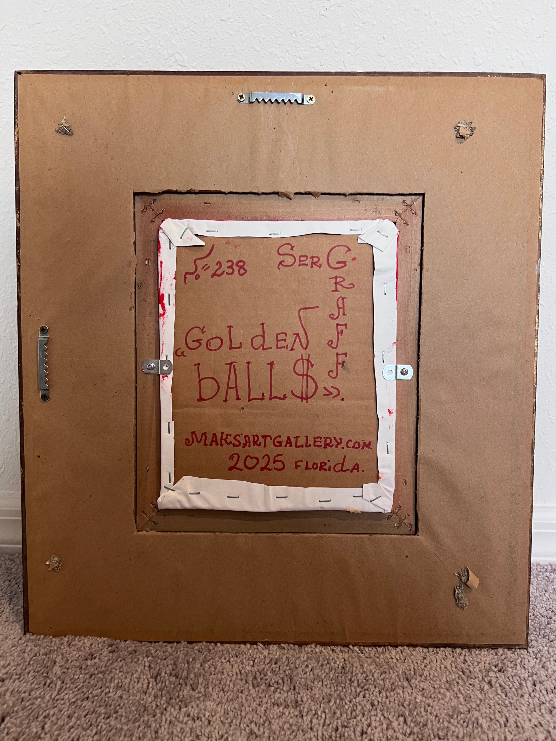 Step into a dazzling universe of temptation and cosmic absurdity with this original mixed media painting by Florida-based visionary Serg Graff. Titled “Golden Ball$”, this arresting composition evokes a surreal celebration of wealth, desire, and mysticism — all wrapped in an electrified pop-baroque aesthetic.