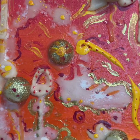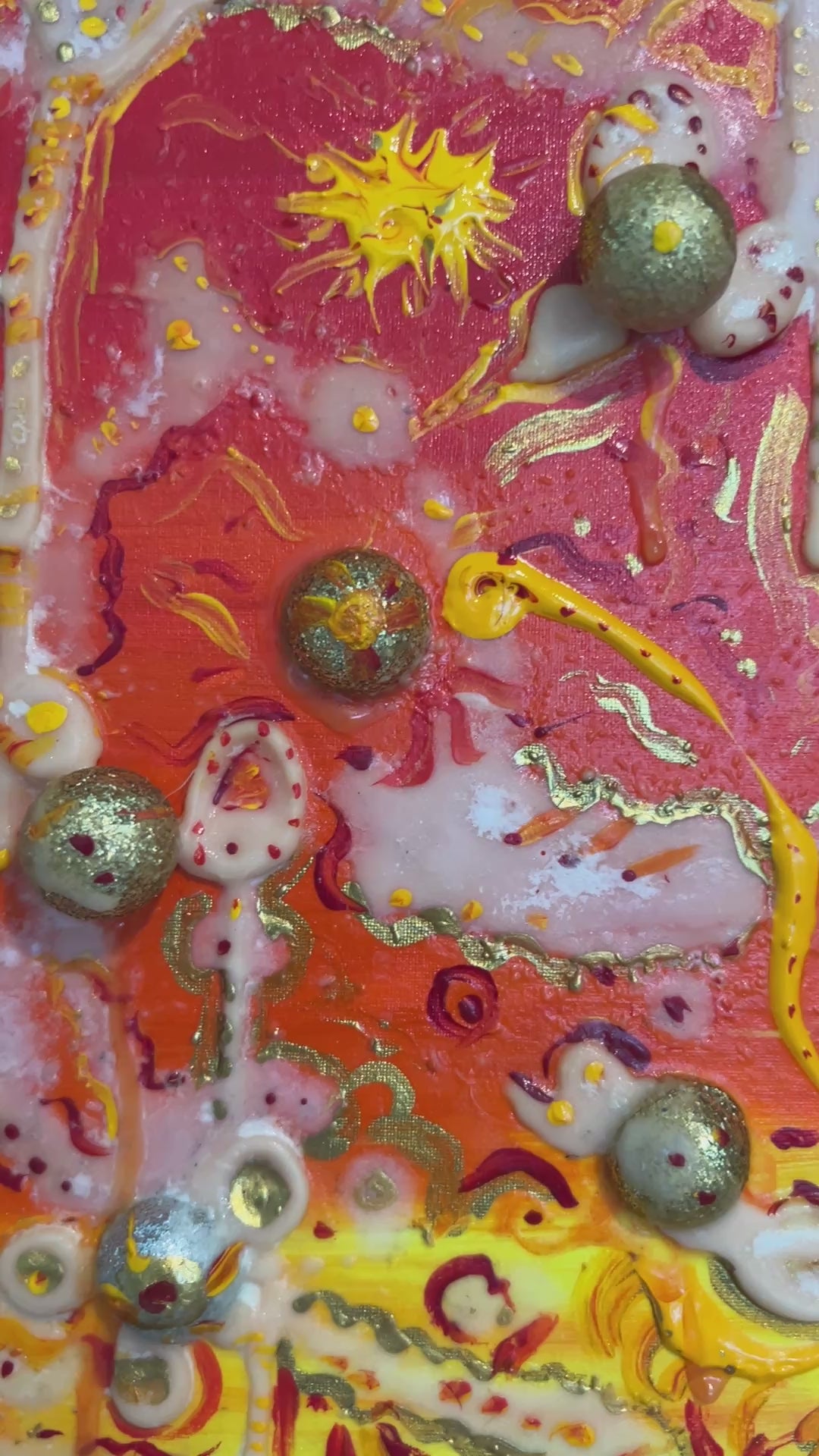 Set against a molten red and golden background, textured spheres rise like celestial orbs or enigmatic relics, glistening with pearlized sheen and resin highlights. Whether seen as a satirical metaphor for modern obsession or an abstract dance of energetic forces, the painting invites bold interpretation.