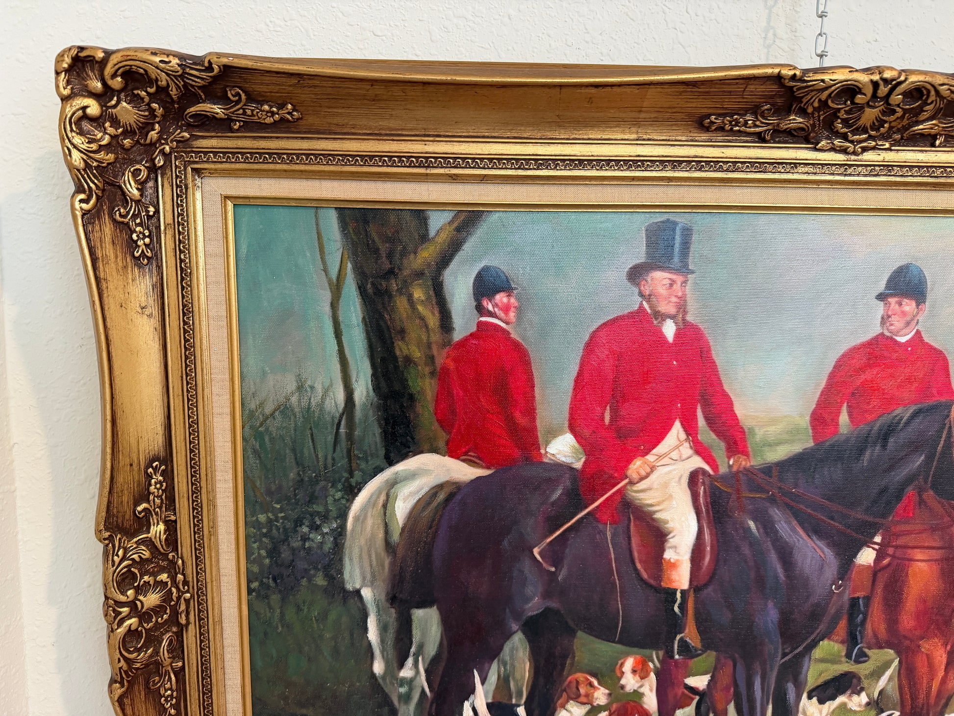Executed in oil on canvas, the painting is unsigned. It is presented in an ornate decorative gilt frame that complements the traditional sporting subject matter. The artwork displays light, natural surface wear consistent with age. Overall, it presents attractively and offers strong decorative appeal, particularly for equestrian or sporting interiors.