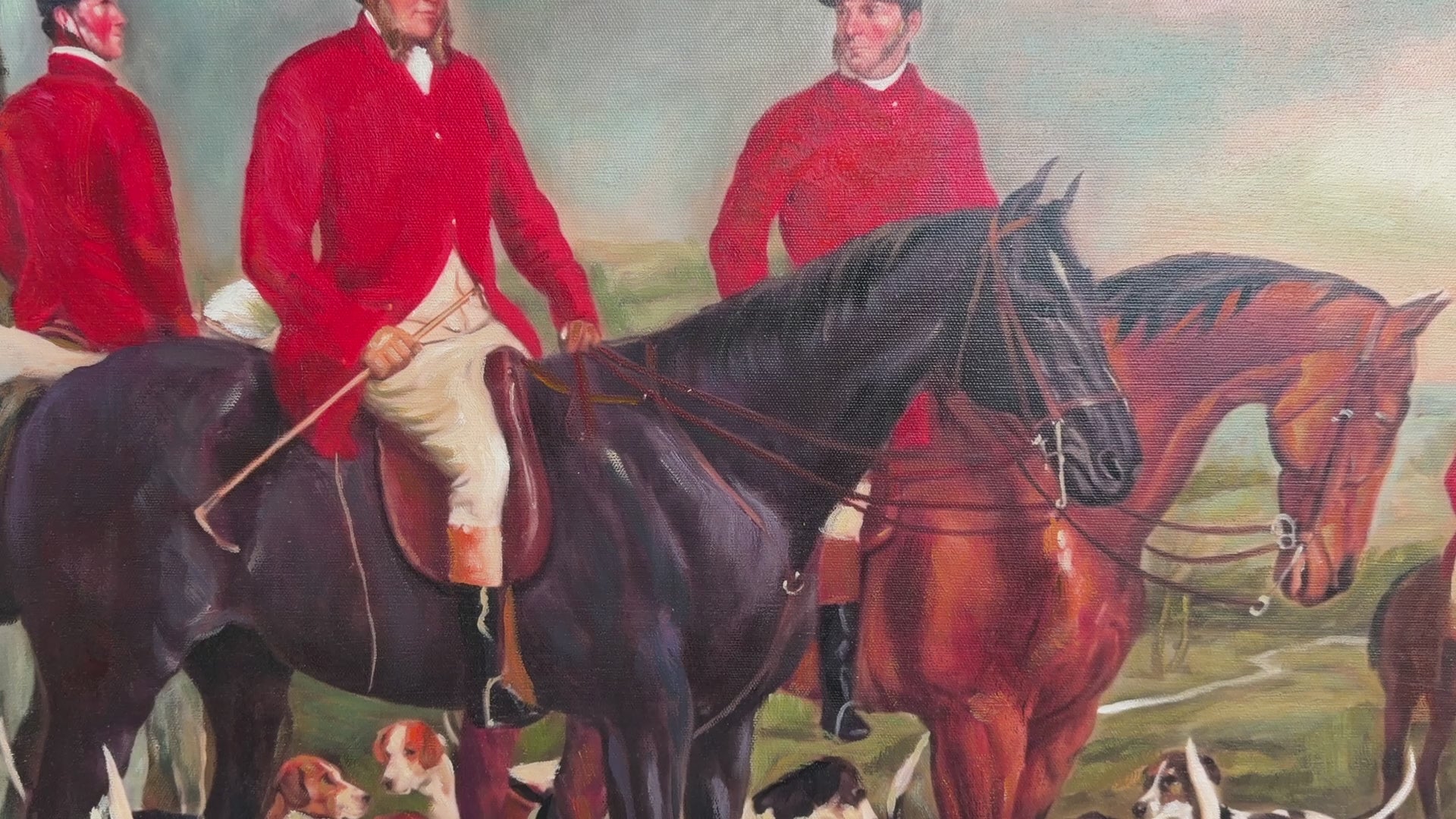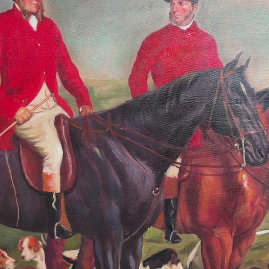 This original oil painting on canvas depicts a classic English fox hunting scene with mounted riders in traditional red hunting coats, gathered with their hounds in a pastoral countryside setting. The composition features three huntsmen on horseback in the foreground and another rider in the distance, surrounded by a lively pack of foxhounds. The artist captures the elegance of the horses and the alert energy of the dogs with confident, naturalistic brushwork. Soft atmospheric tones in the sky and rolling landscape contrast beautifully with the vibrant red jackets, creating a balanced and visually engaging composition.