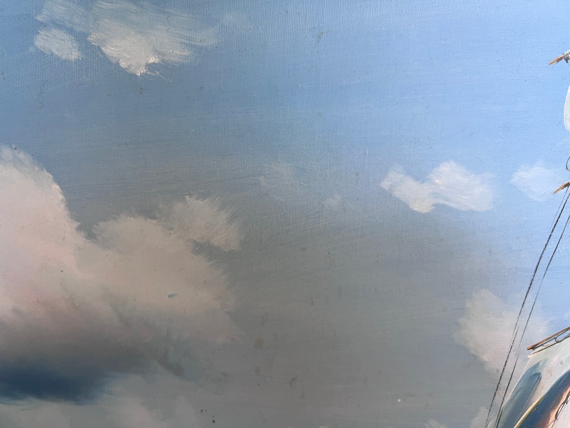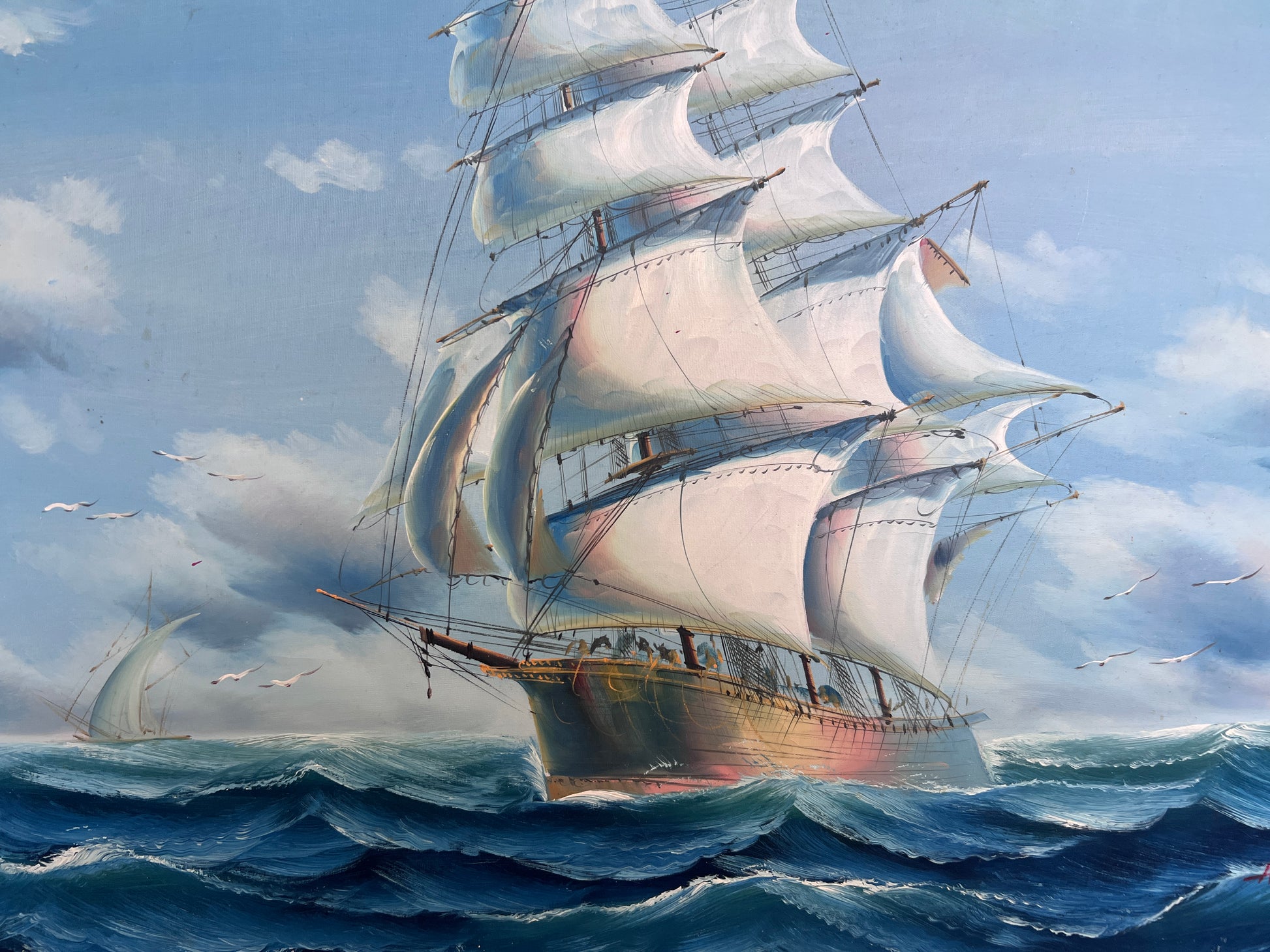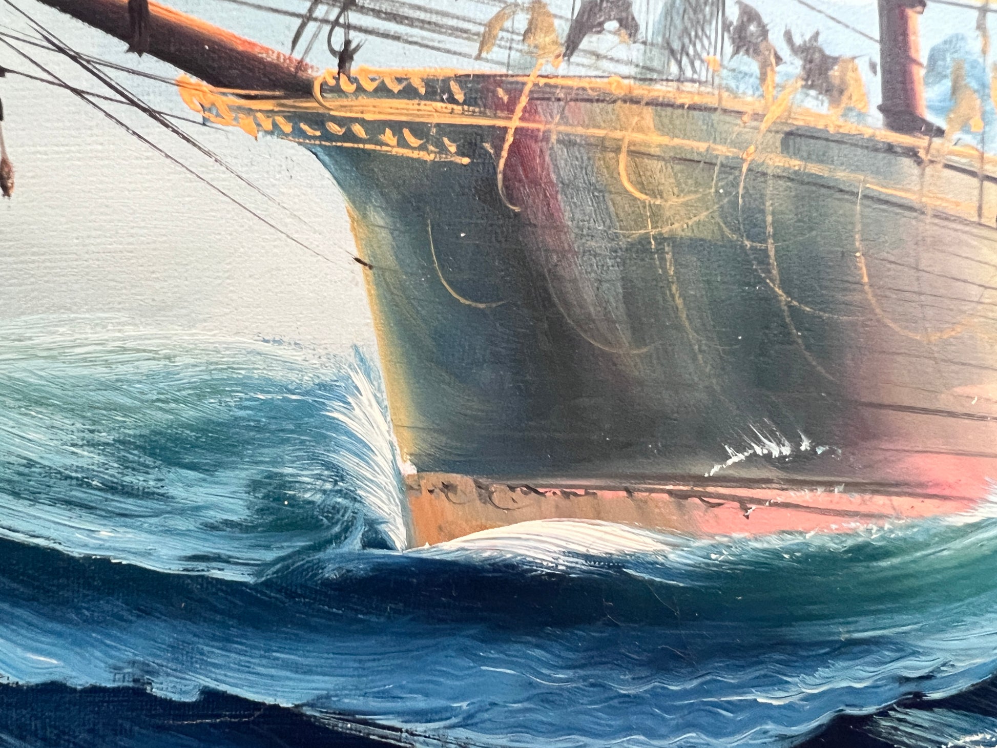This vintage oil on canvas, signed Also in the lower right, depicts a majestic tall ship under full sail cutting through rolling waves. The artist captures the drama of the open sea with crisp blues, sweeping brushstrokes, and billowing white sails set against a partly cloudy sky. A second vessel appears faintly on the horizon, adding depth and a sense of distance.