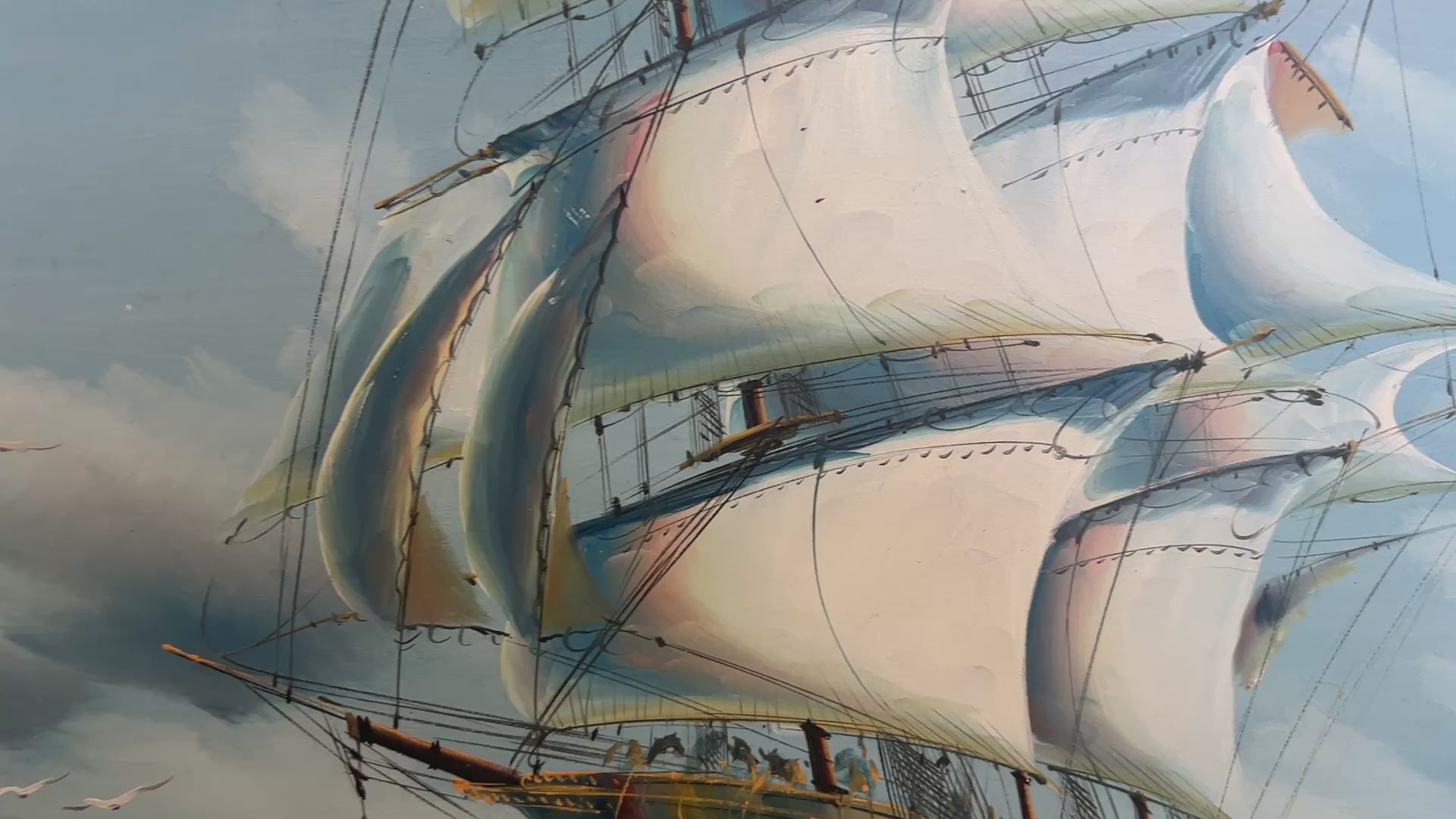 Original Oil painting on canvas seascape, Sailing Ship, signed Also, Gold Frame