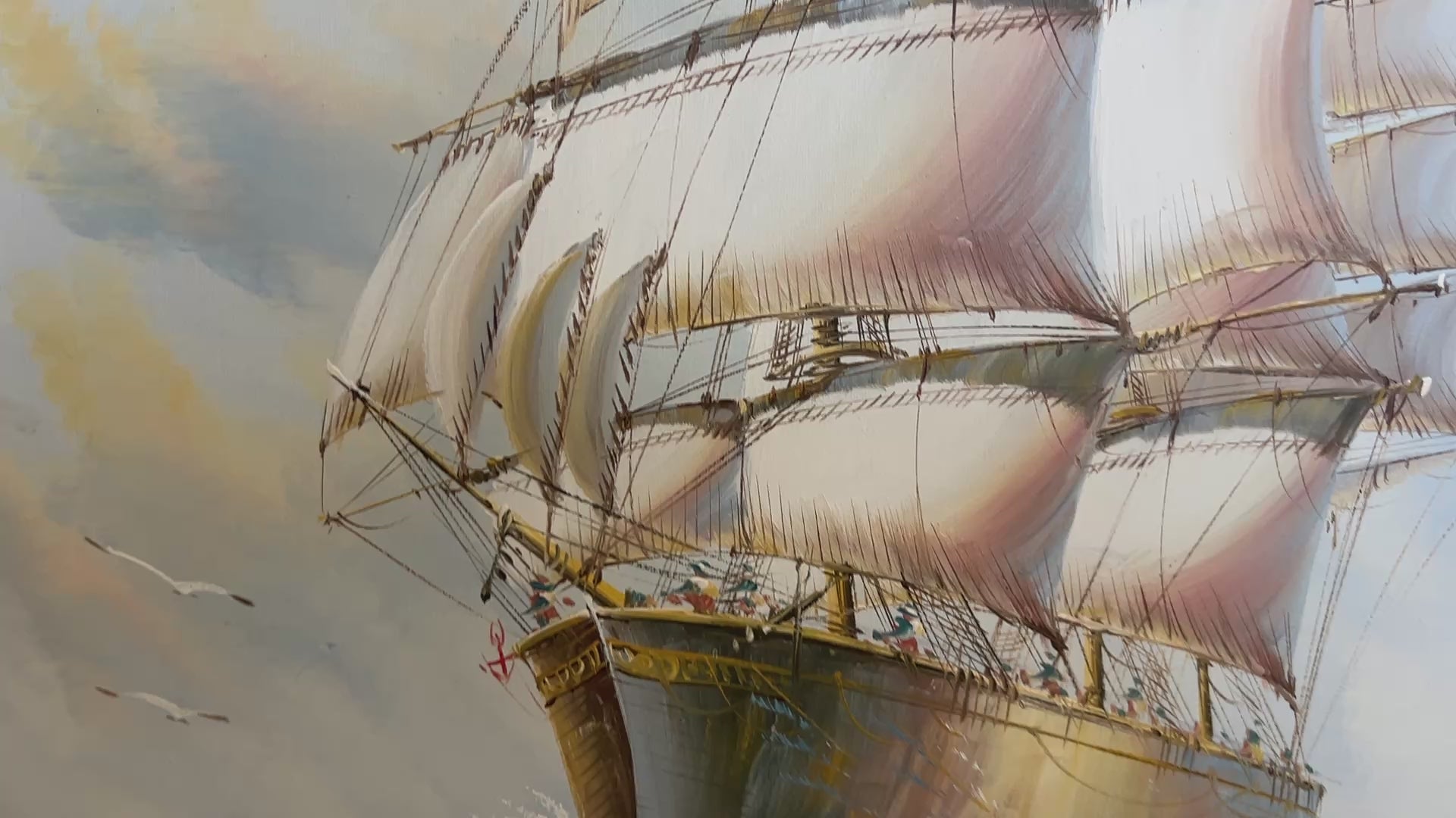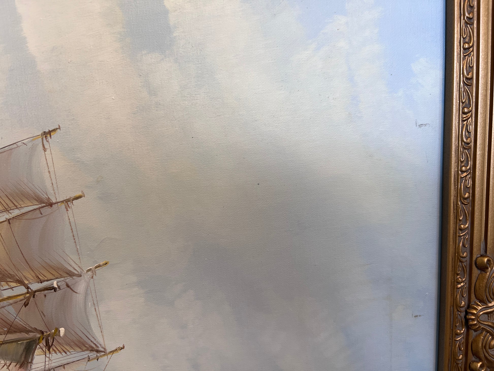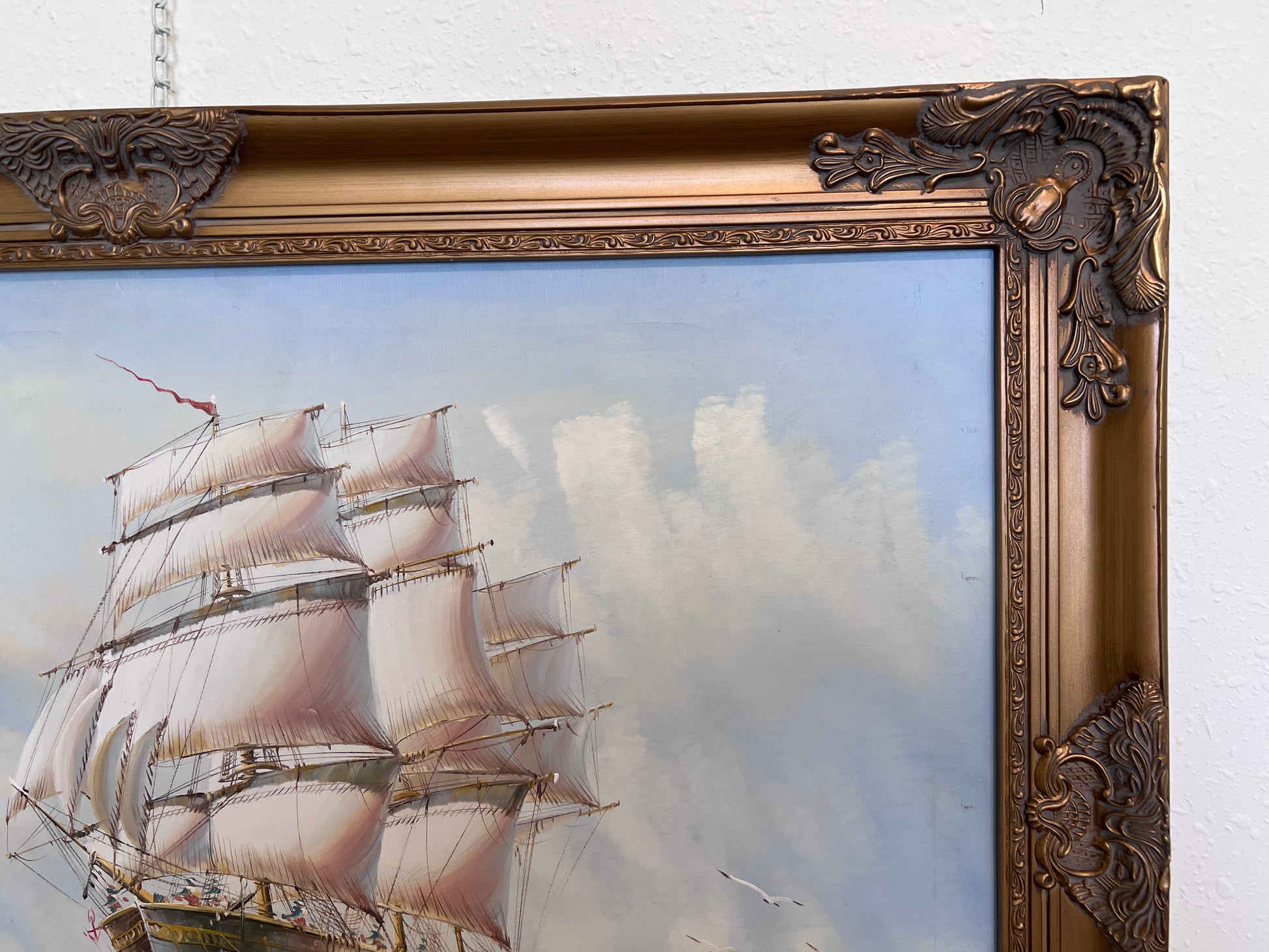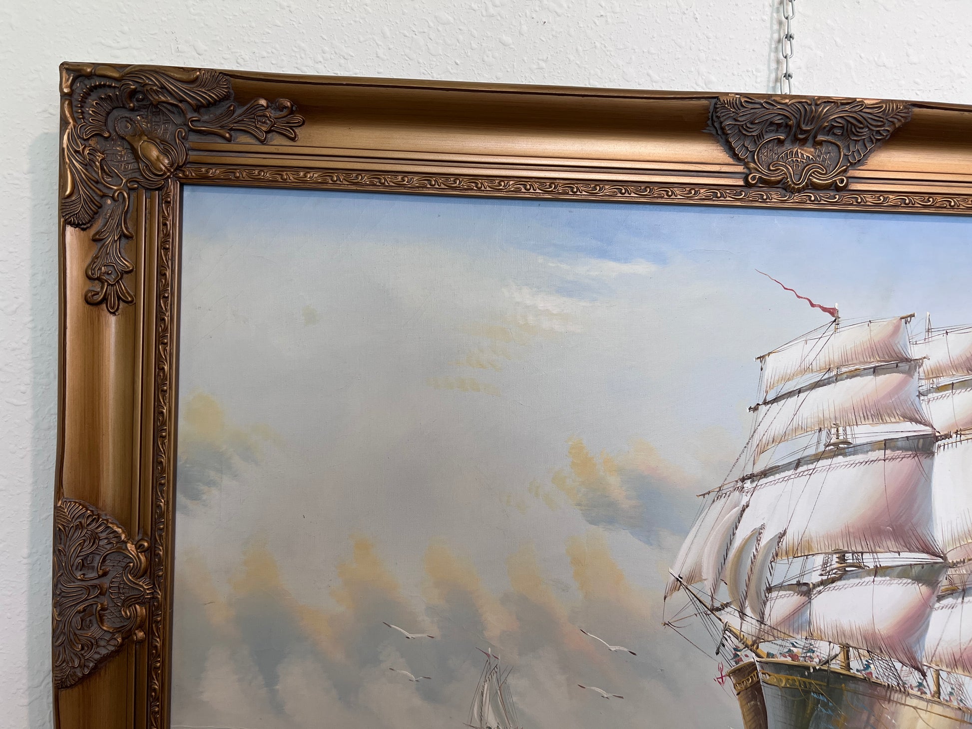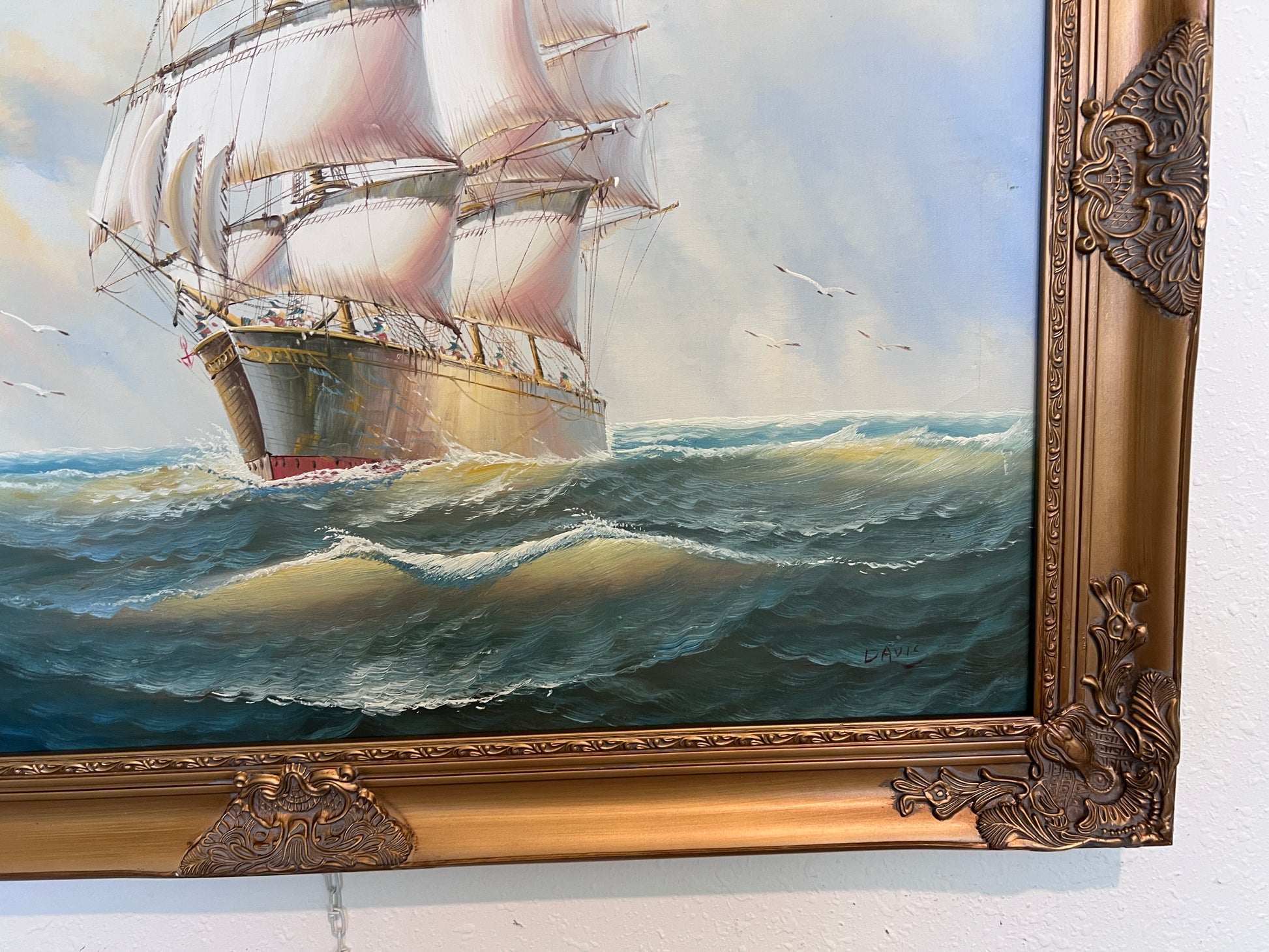 Original Oil painting on canvas seascape, Sailing Ship, signed Davis, Gold Frame
