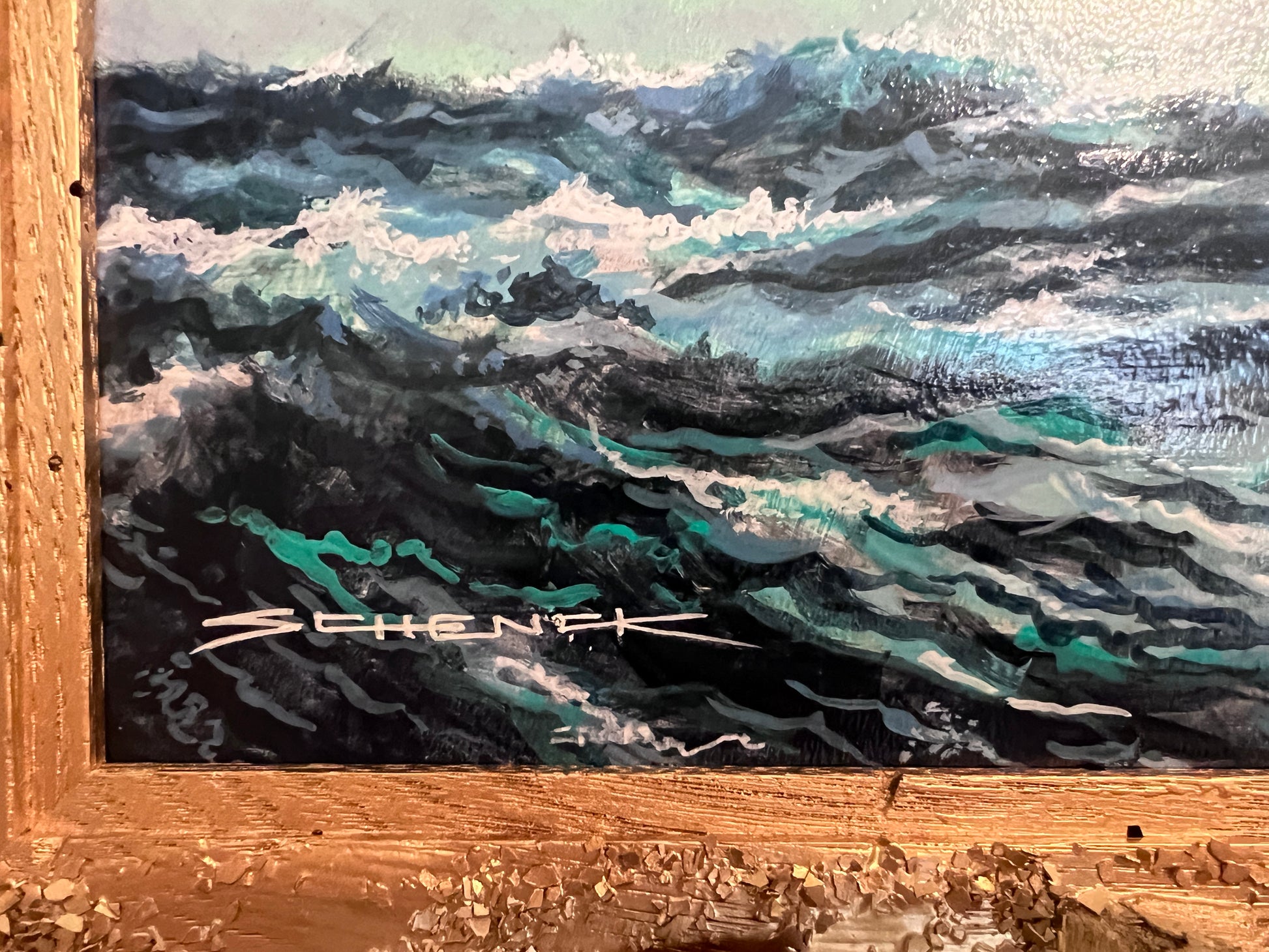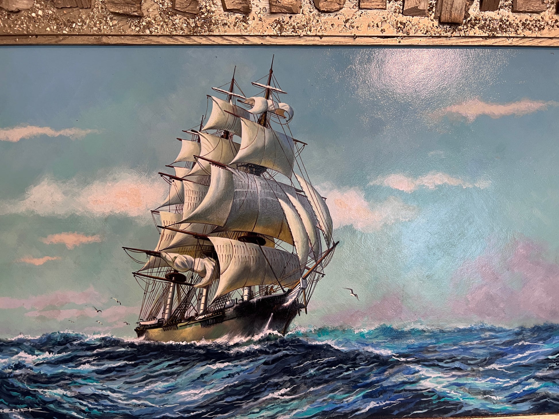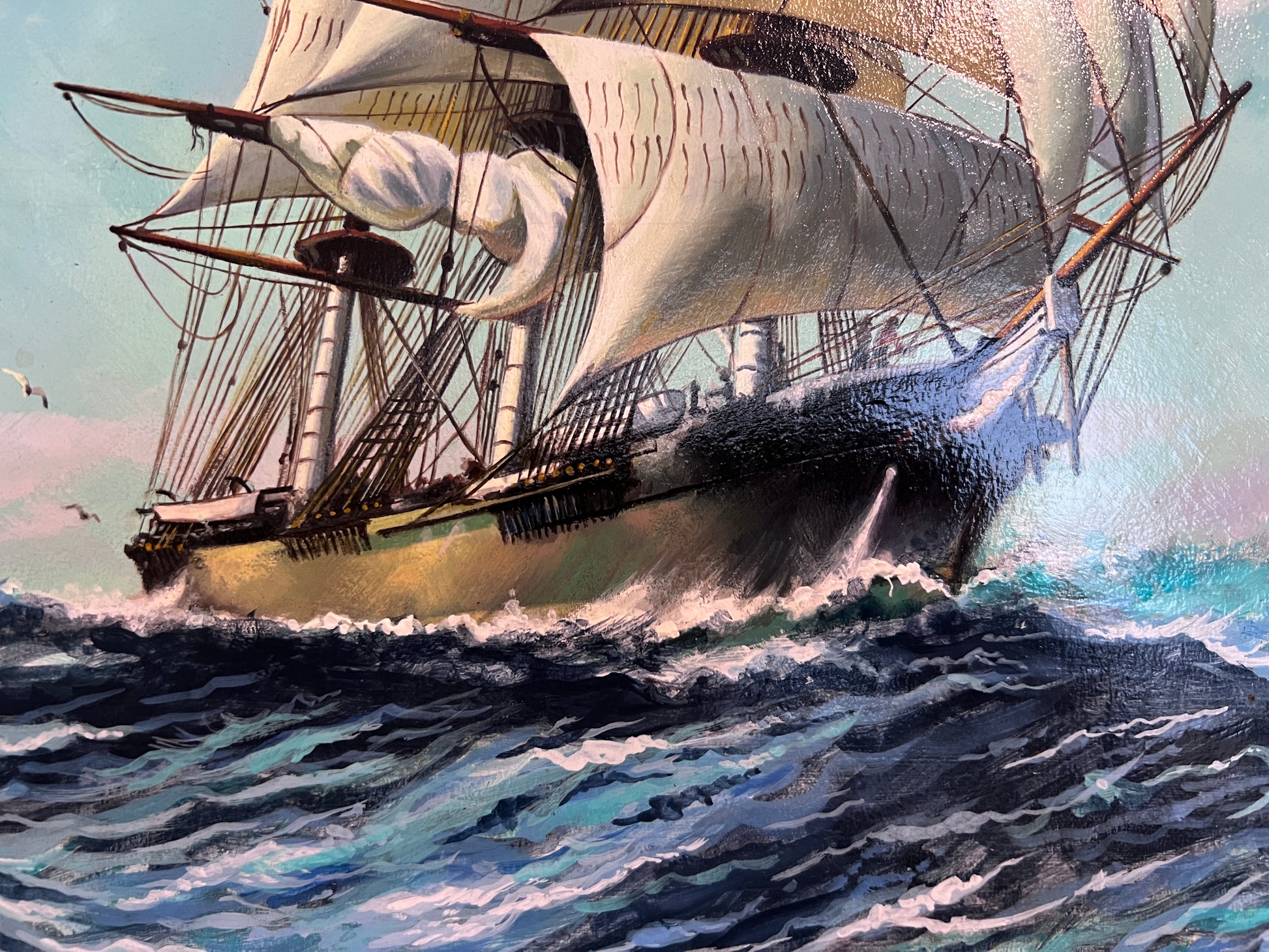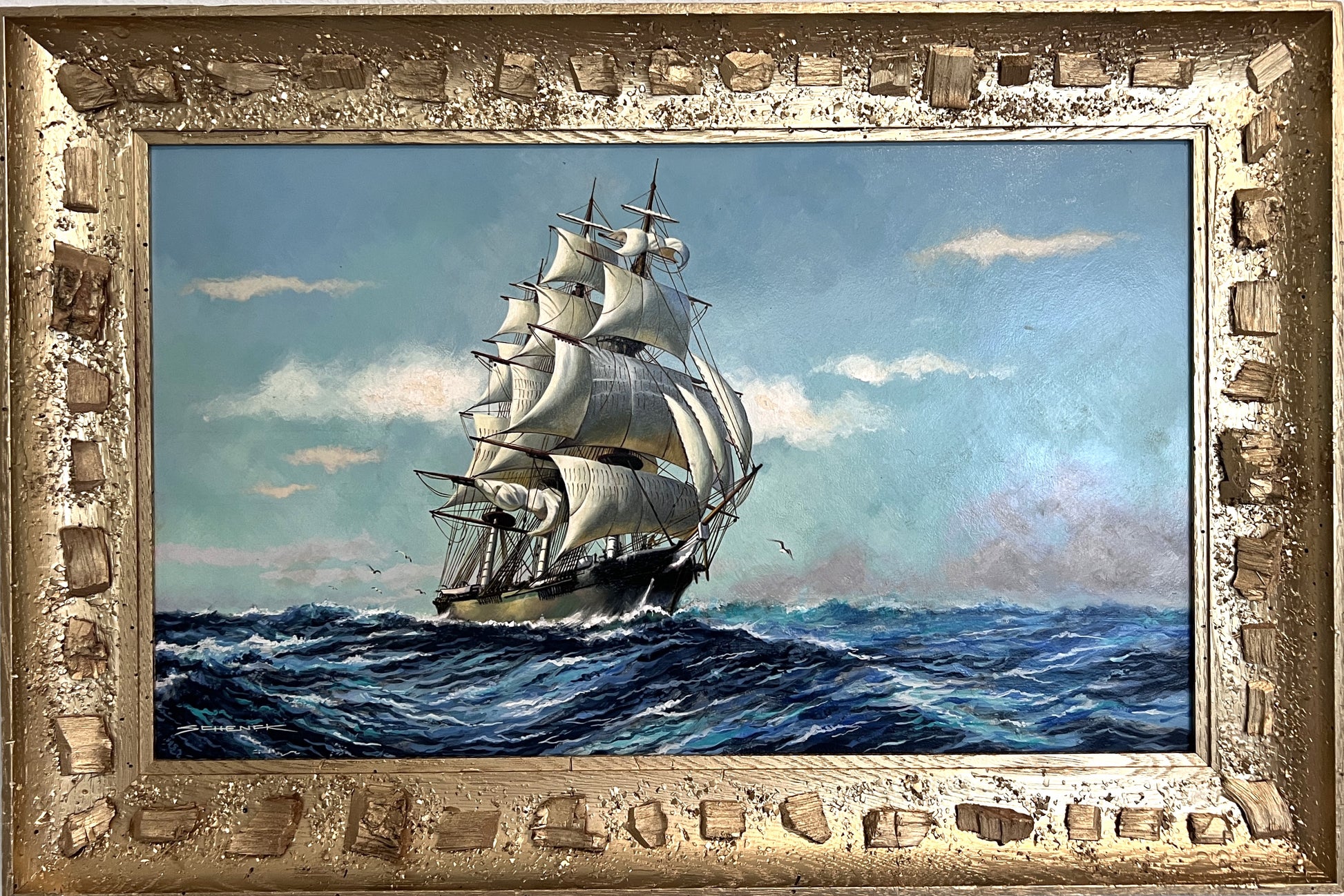 This beautiful original oil painting on board by Schenck depicts a majestic tall ship sailing across a vibrant, churning sea. The ship’s towering masts and fully unfurled white sails are captured in meticulous detail, with the vessel cutting gracefully through the rolling waves. The play of light on the sails and rigging enhances the sense of movement and realism, creating a striking maritime scene full of drama and elegance.
