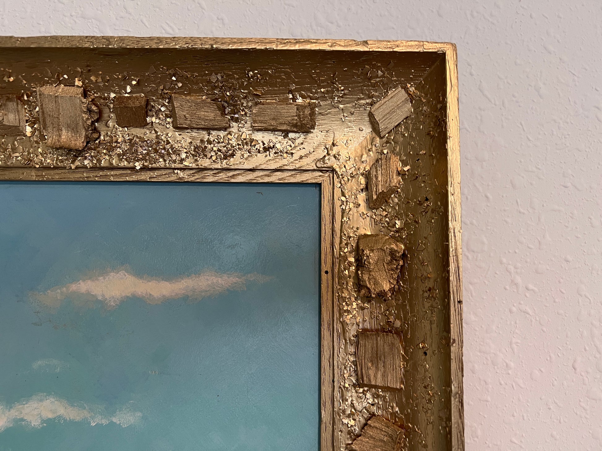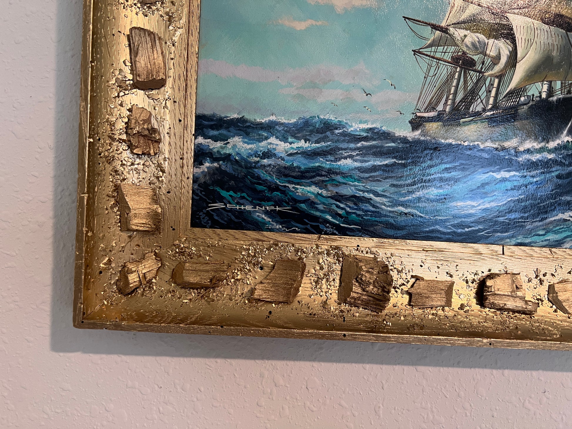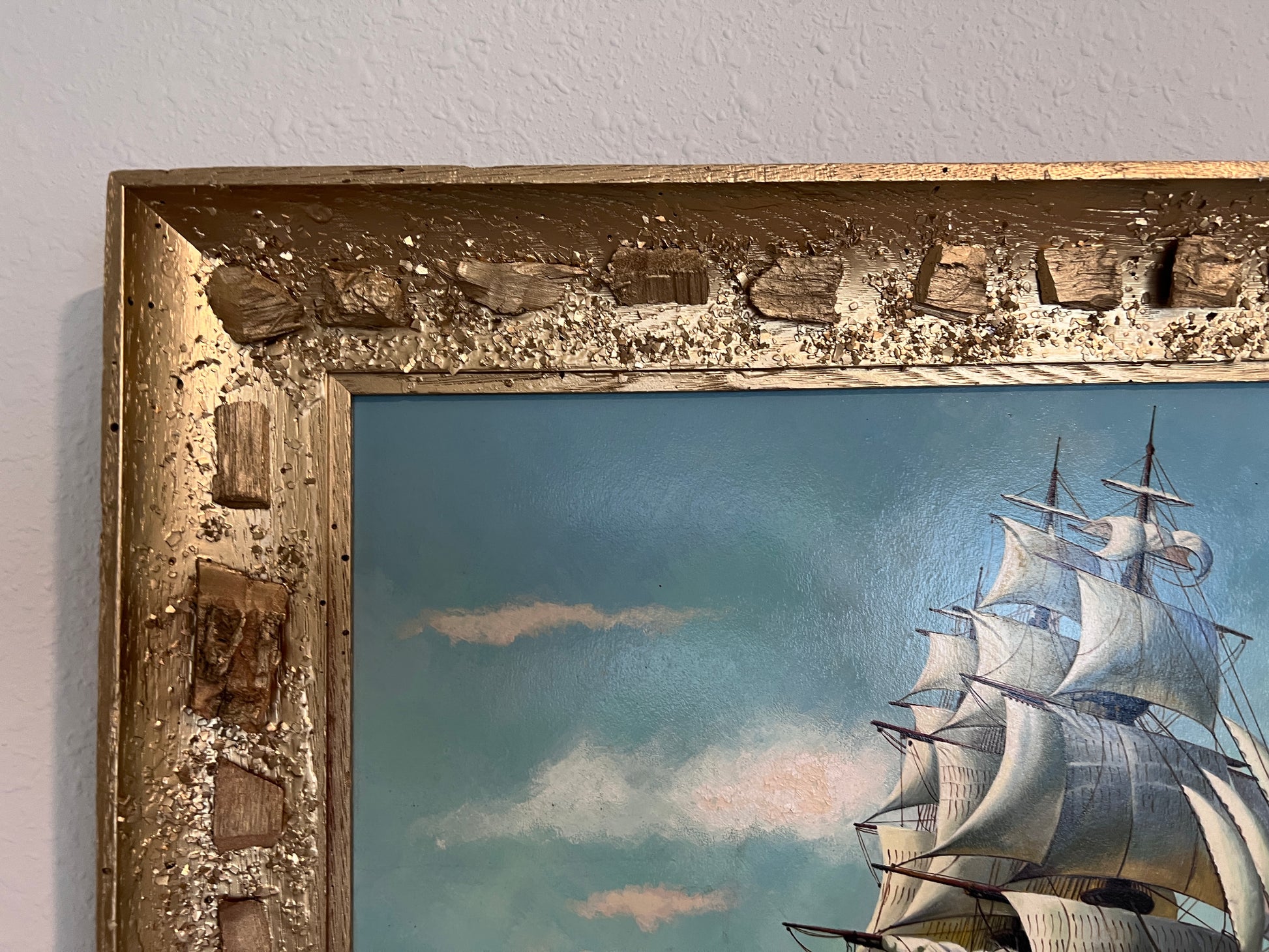 The artwork is presented in an ornate gold frame with a textured, fragmented design that complements the classic nautical subject.