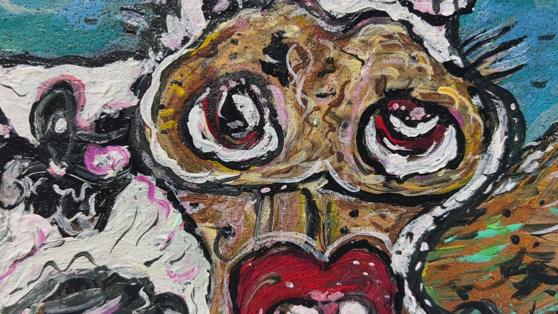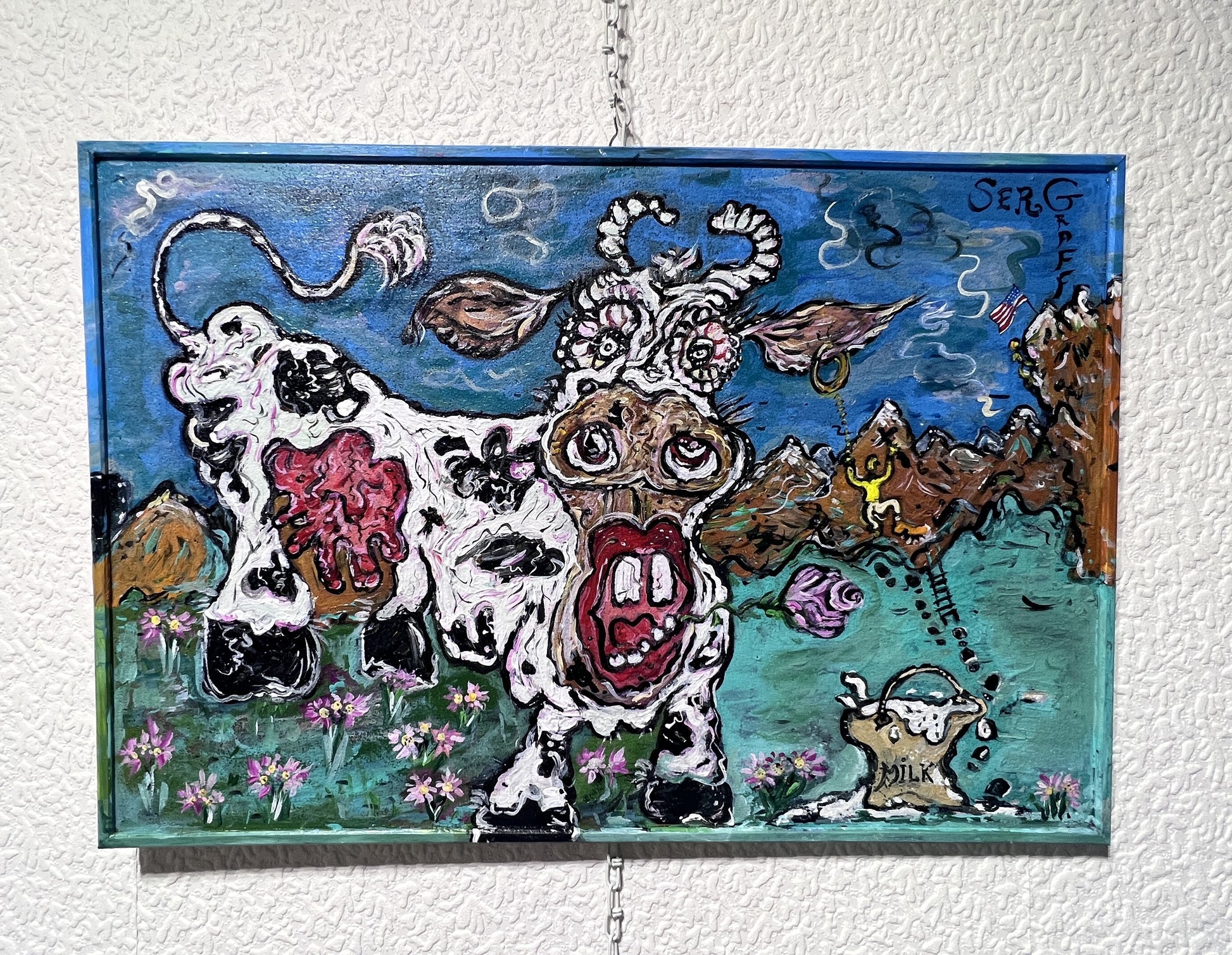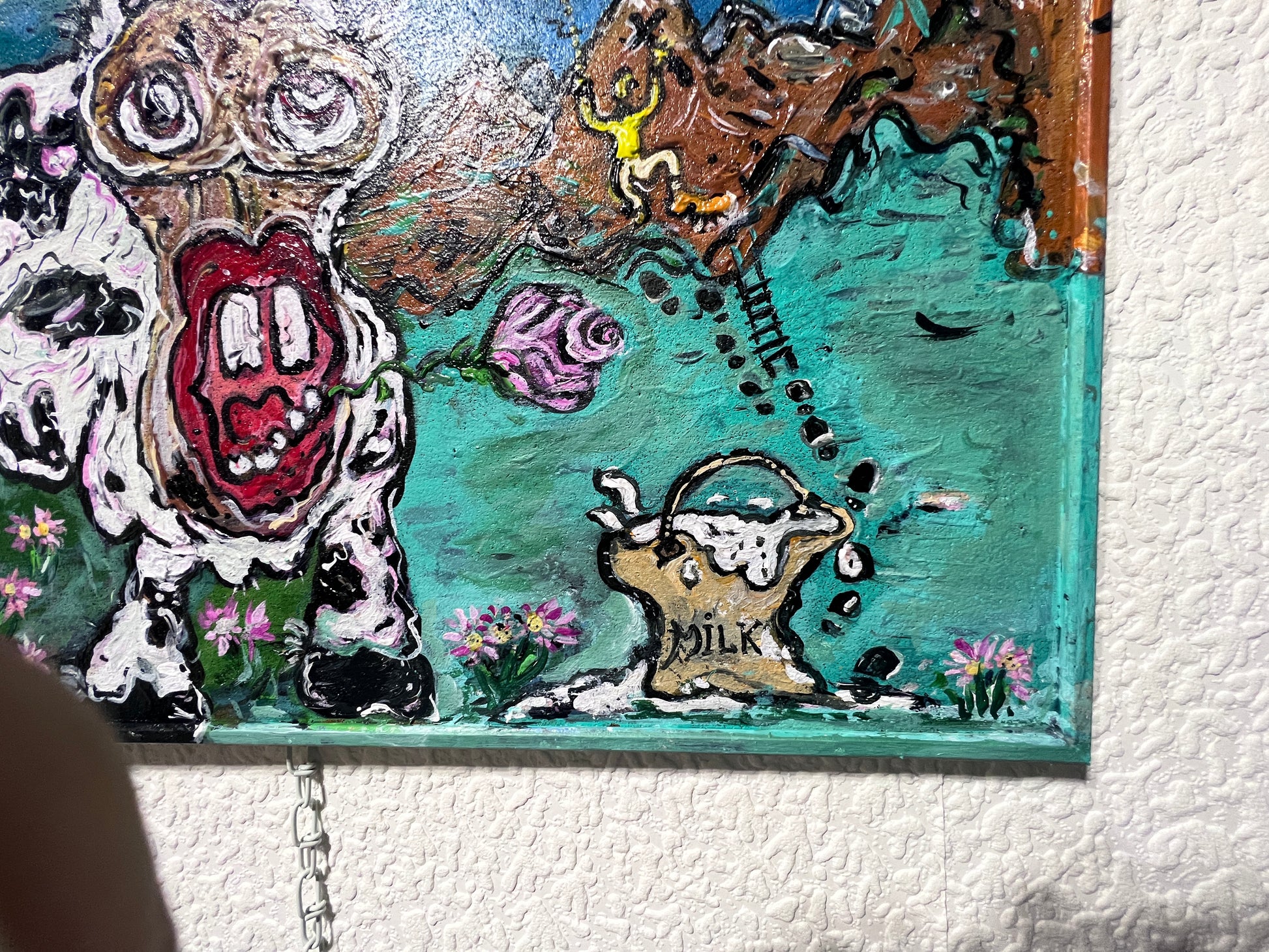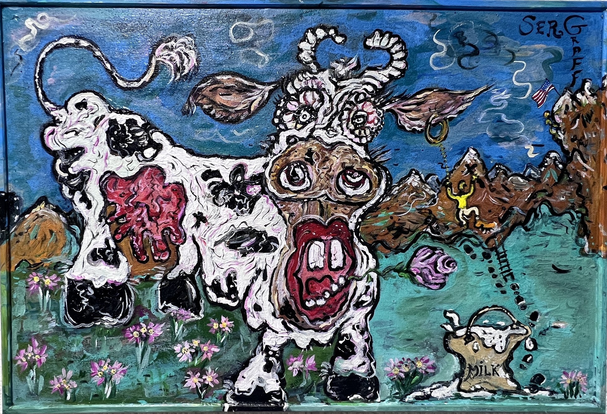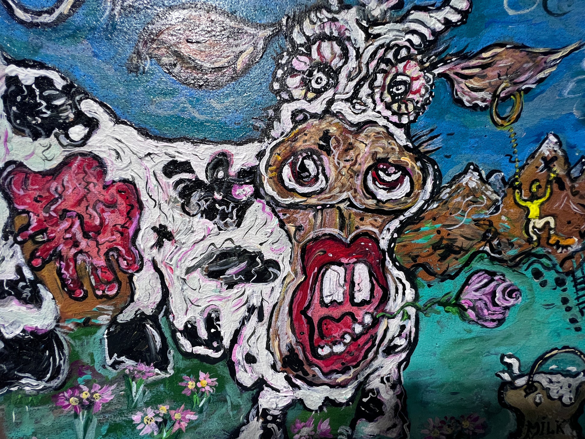 A playful narrative unfolds to the right: a tiny climber scales the mountainside on a ladder of footprints, seemingly on a mission to rescue the cow. Nearby, a rustic milk bucket labeled “MILK” adds to the painting’s satirical tone. The mix of vivid colors, swirling textures, and quirky details gives this piece a vibrant, surreal character—an inventive blend of folk‑like storytelling and contemporary cartoon abstraction.