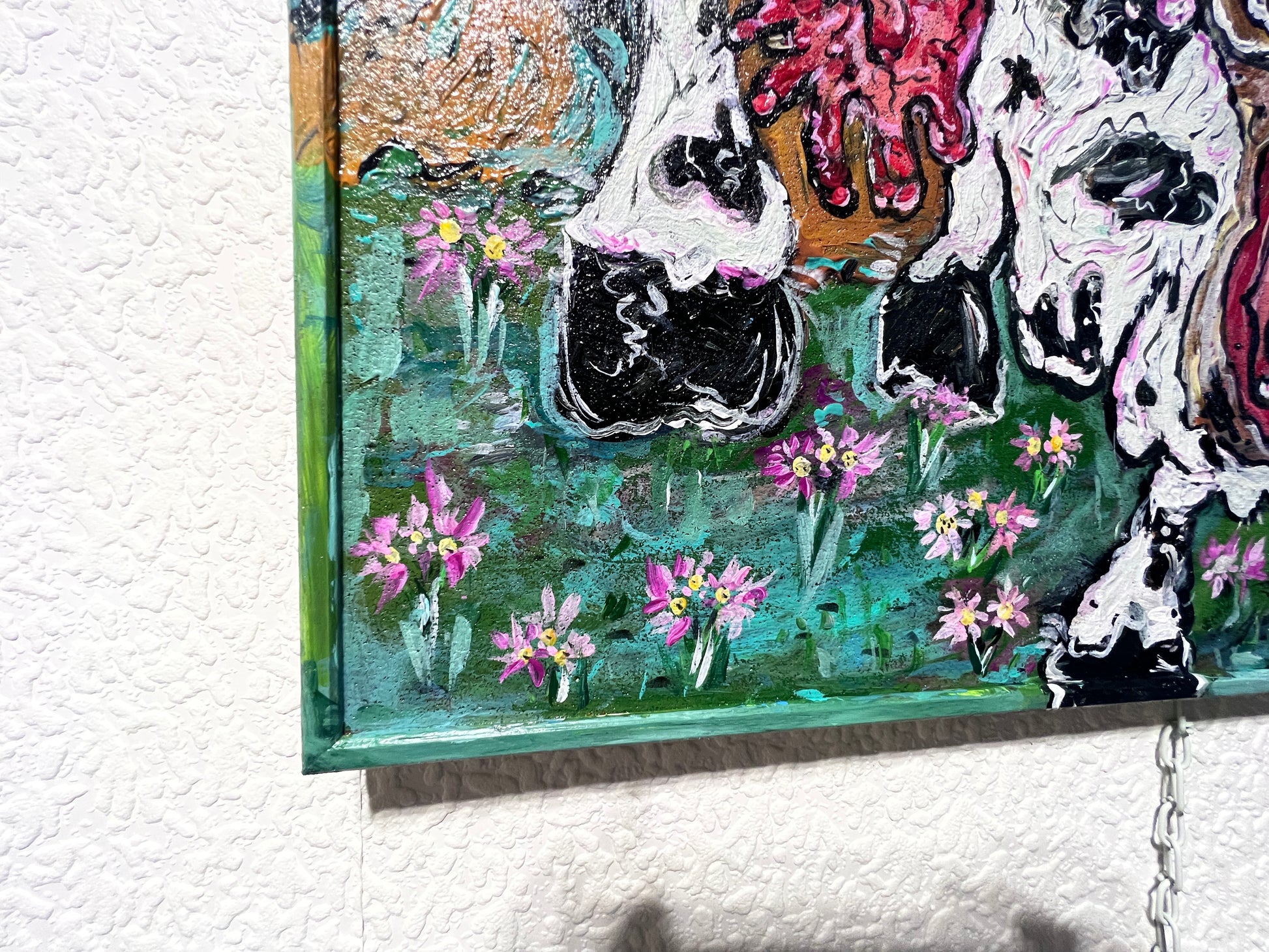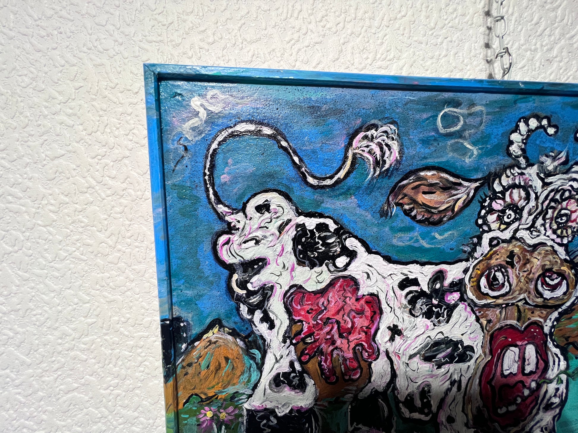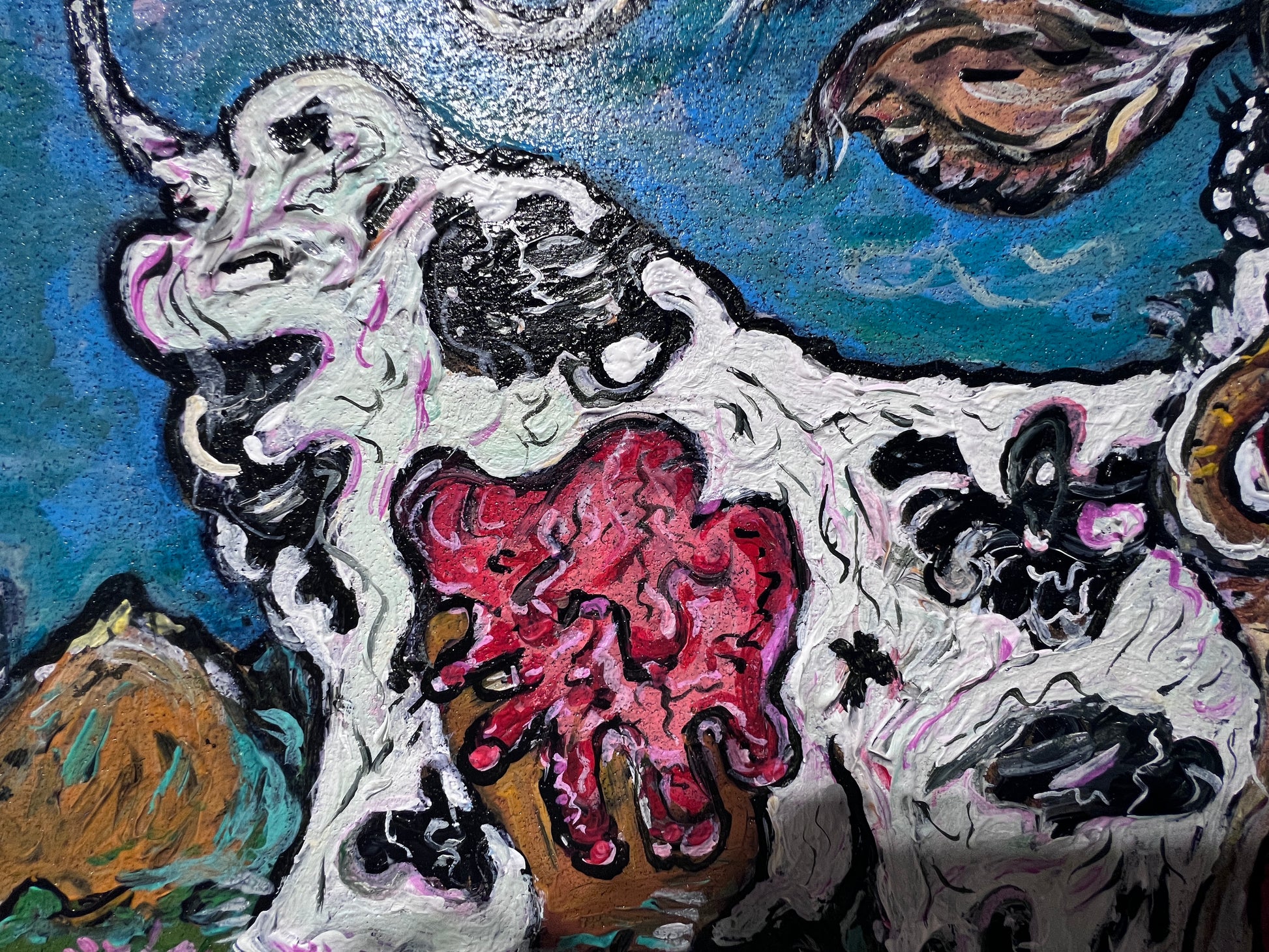 The painting bursts with expressive energy and humor, depicting a surreal mountain scene where a wide‑eyed, exaggerated cow stands front and center, its features rendered in thick, impasto brushstrokes. Bulging eyes, a large open mouth, and black‑and‑white patches create a bold, almost caricatured presence. The cow stands amidst a field of pink and purple alpine flowers, while in the background jagged mountains rise dramatically against a blue sky.