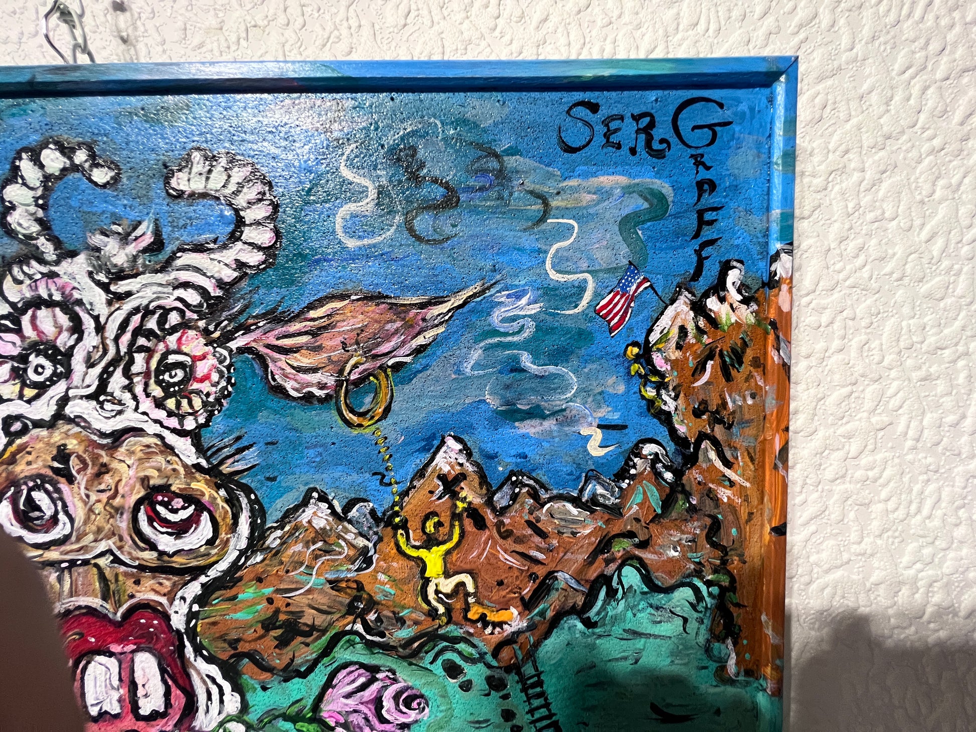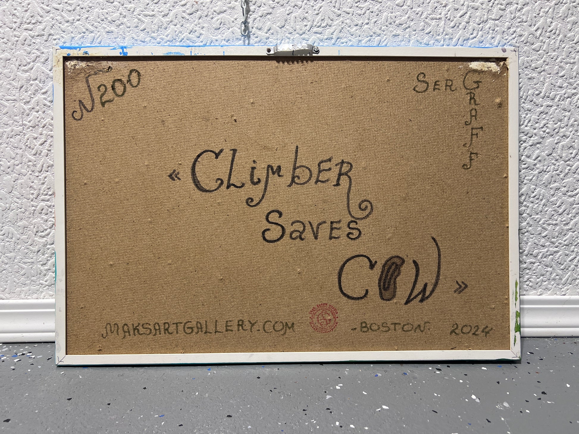 This is a unique original acrylic painting on board in a whimsical fantasy cartoon style by Serg Graff, titled “Climber Saves Cow.”