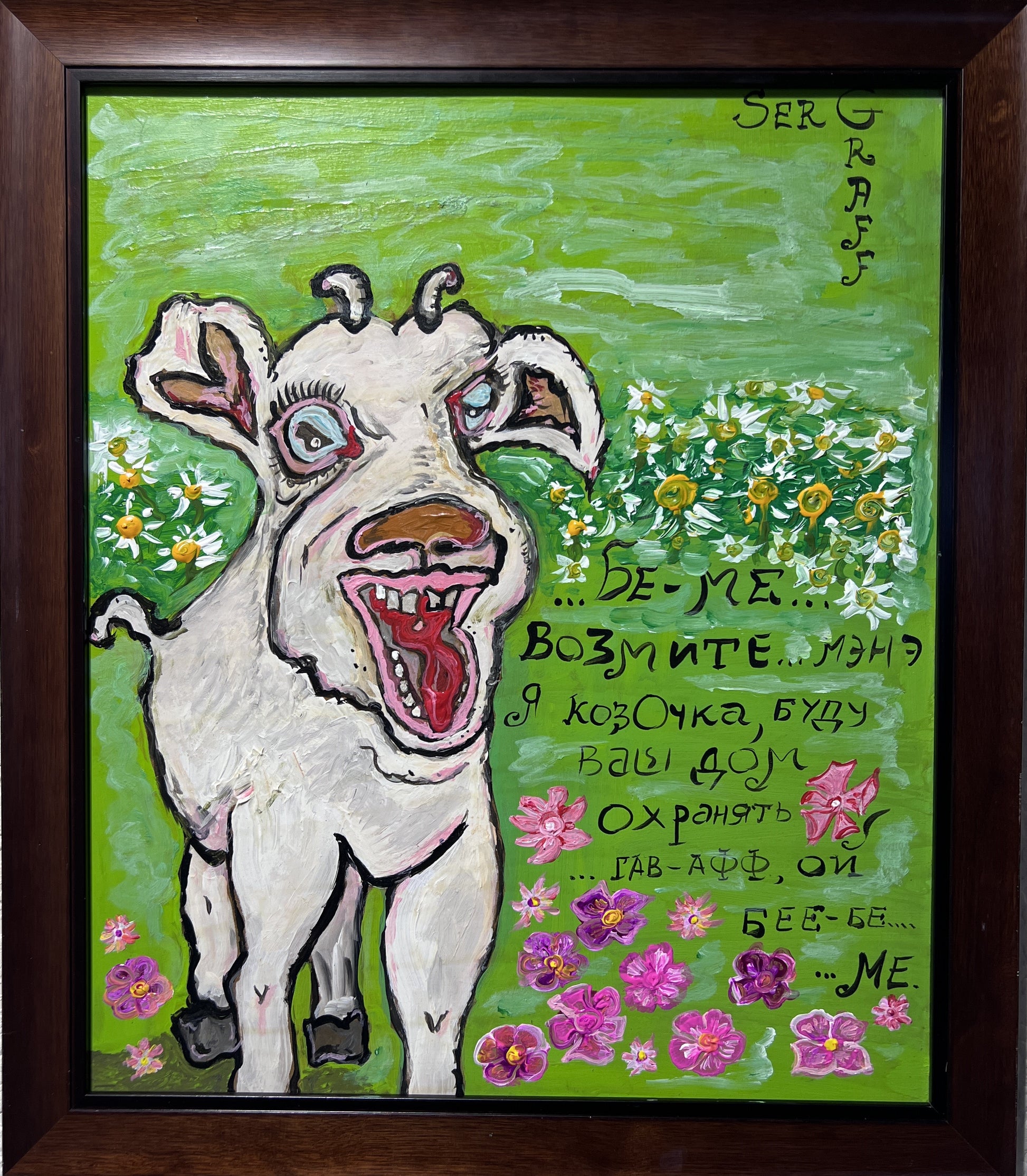 This handwritten text adds a storybook character to the piece, blending fantasy, satire, and folk‑art influences. The bright green field and vivid flowers frame the lamb in an energetic, joyful setting, while the figure’s surreal expression suggests a deeper, ironic humor typical of Graff’s fantasy‑cartoon style.