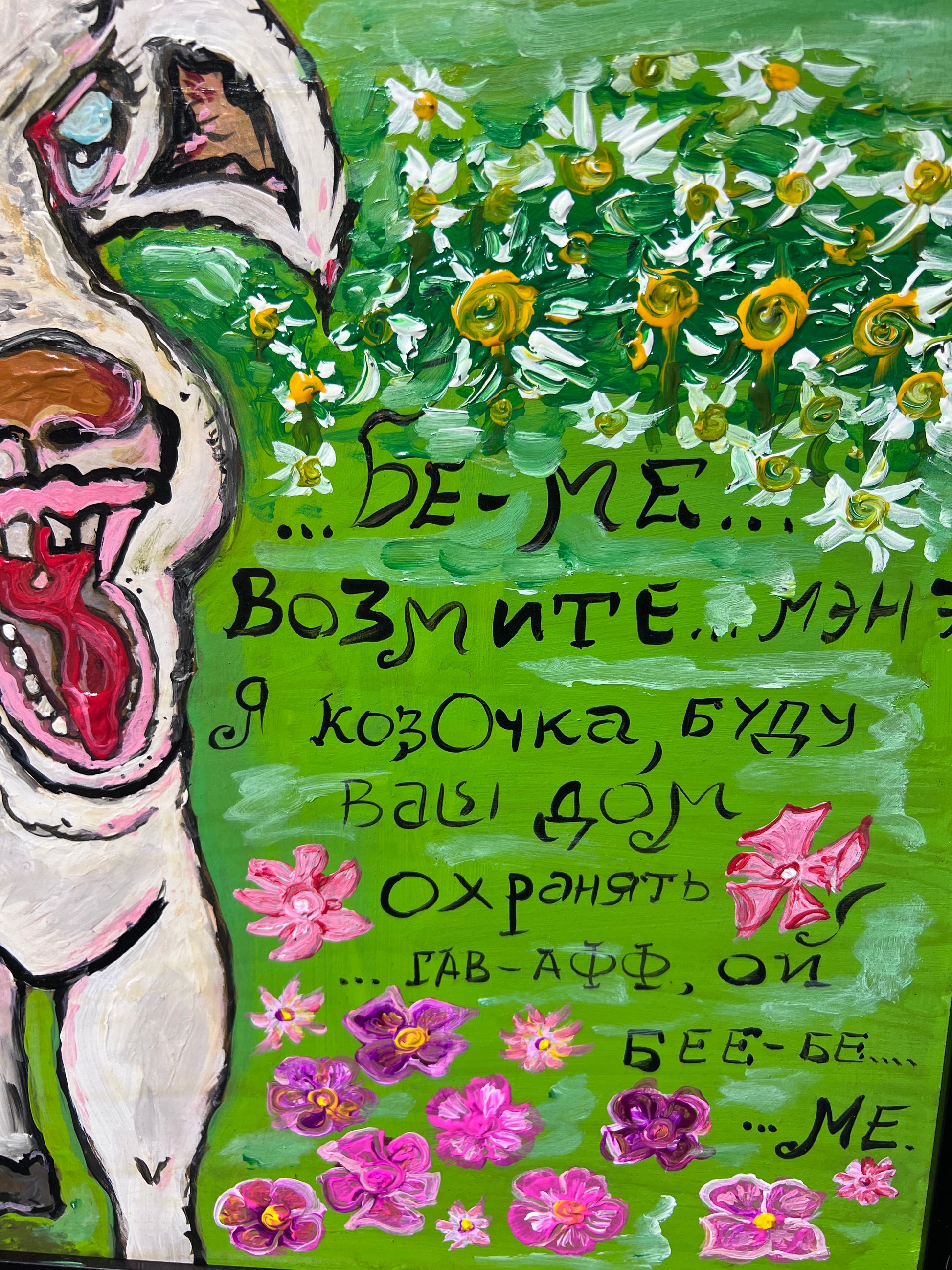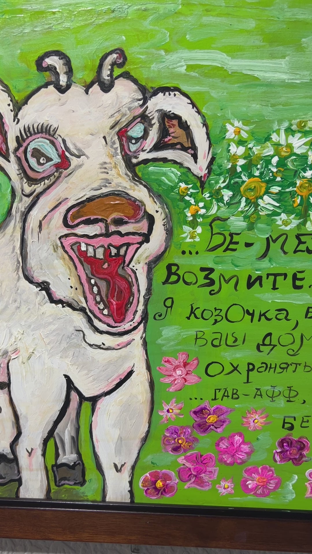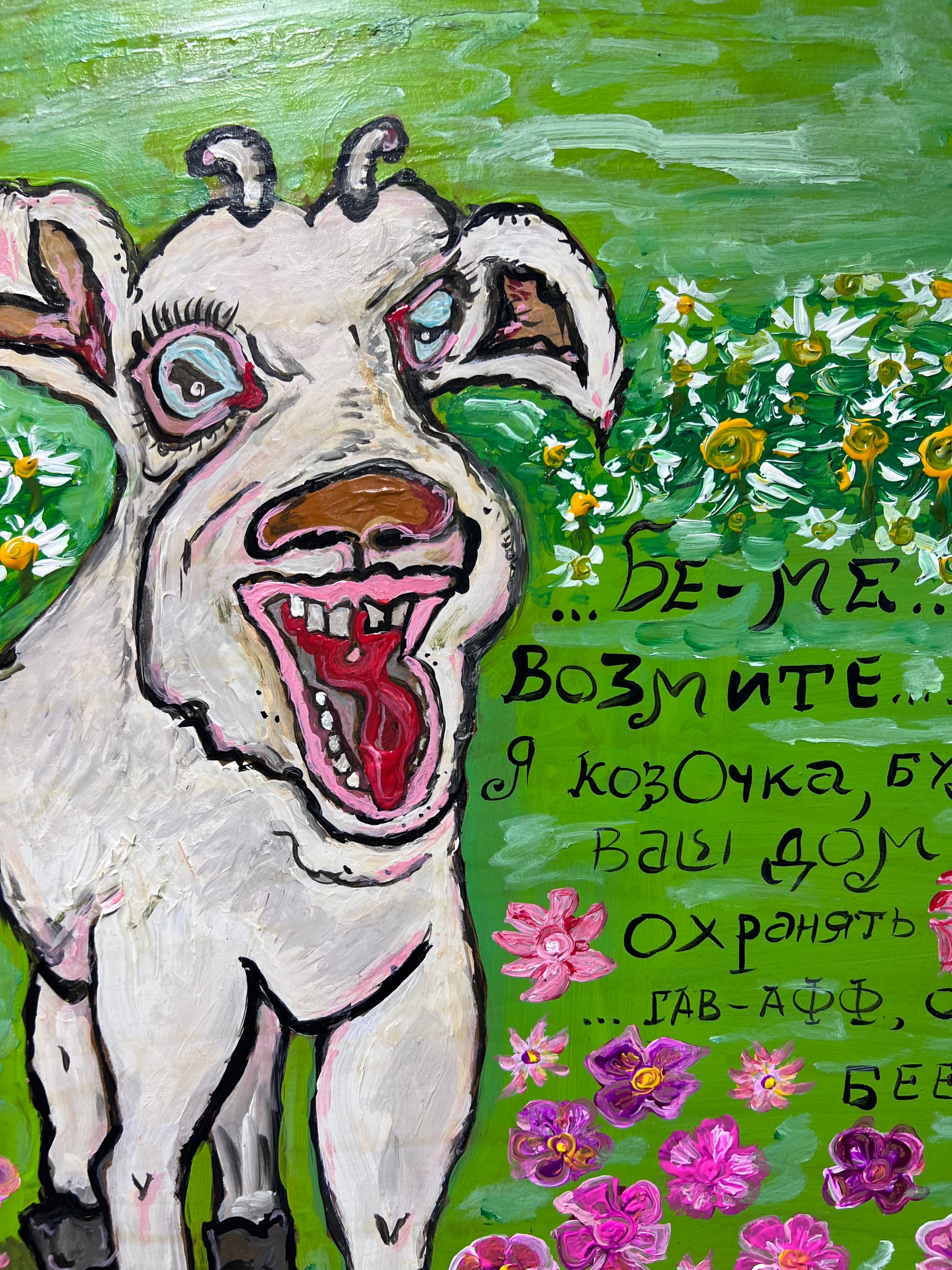 In this lively and whimsical work, a comical white lamb stands amidst a vibrant green meadow sprinkled with colorful blossoms and daisies. The lamb’s exaggerated features — large eyes, wide open mouth, and an almost mischievous grin — infuse the painting with humor and charm. Expressive brushstrokes and thick, textured paint give the figure and surrounding flora a bold, tactile quality that immediately catches the eye.