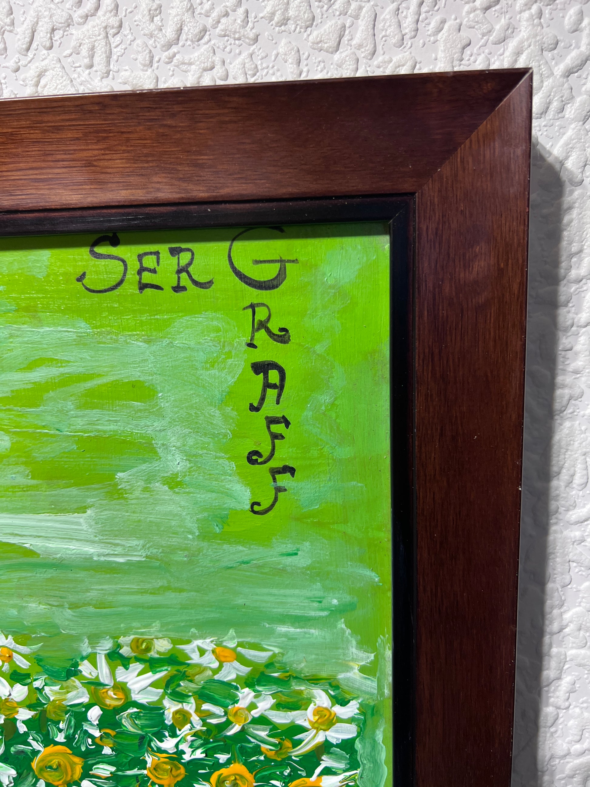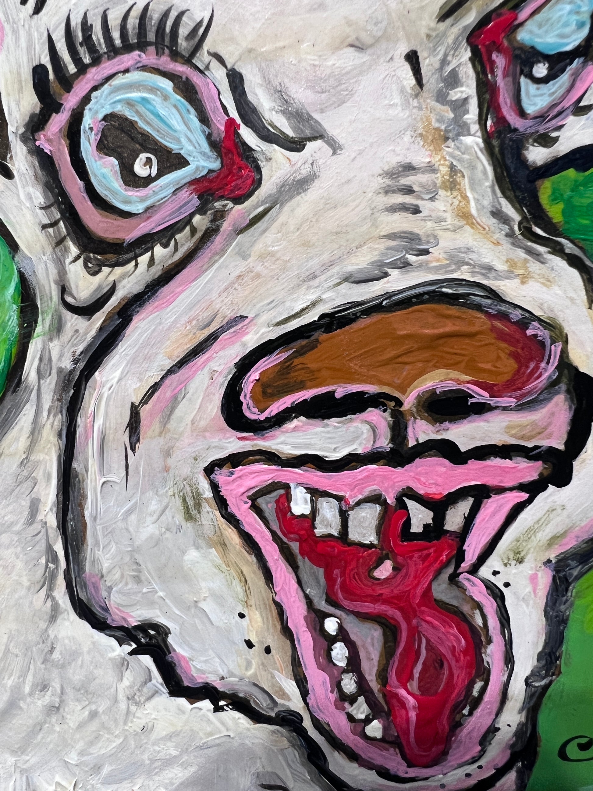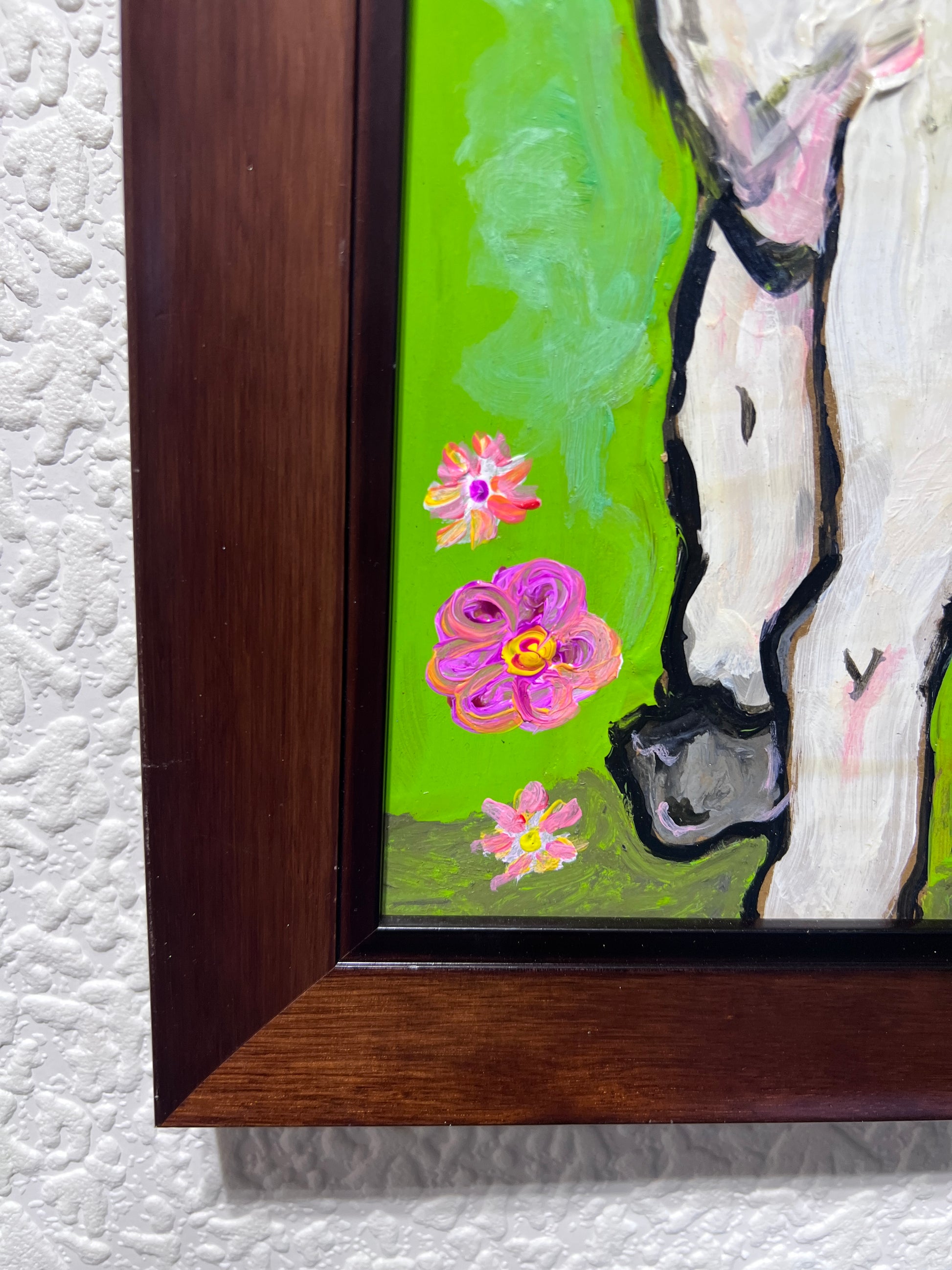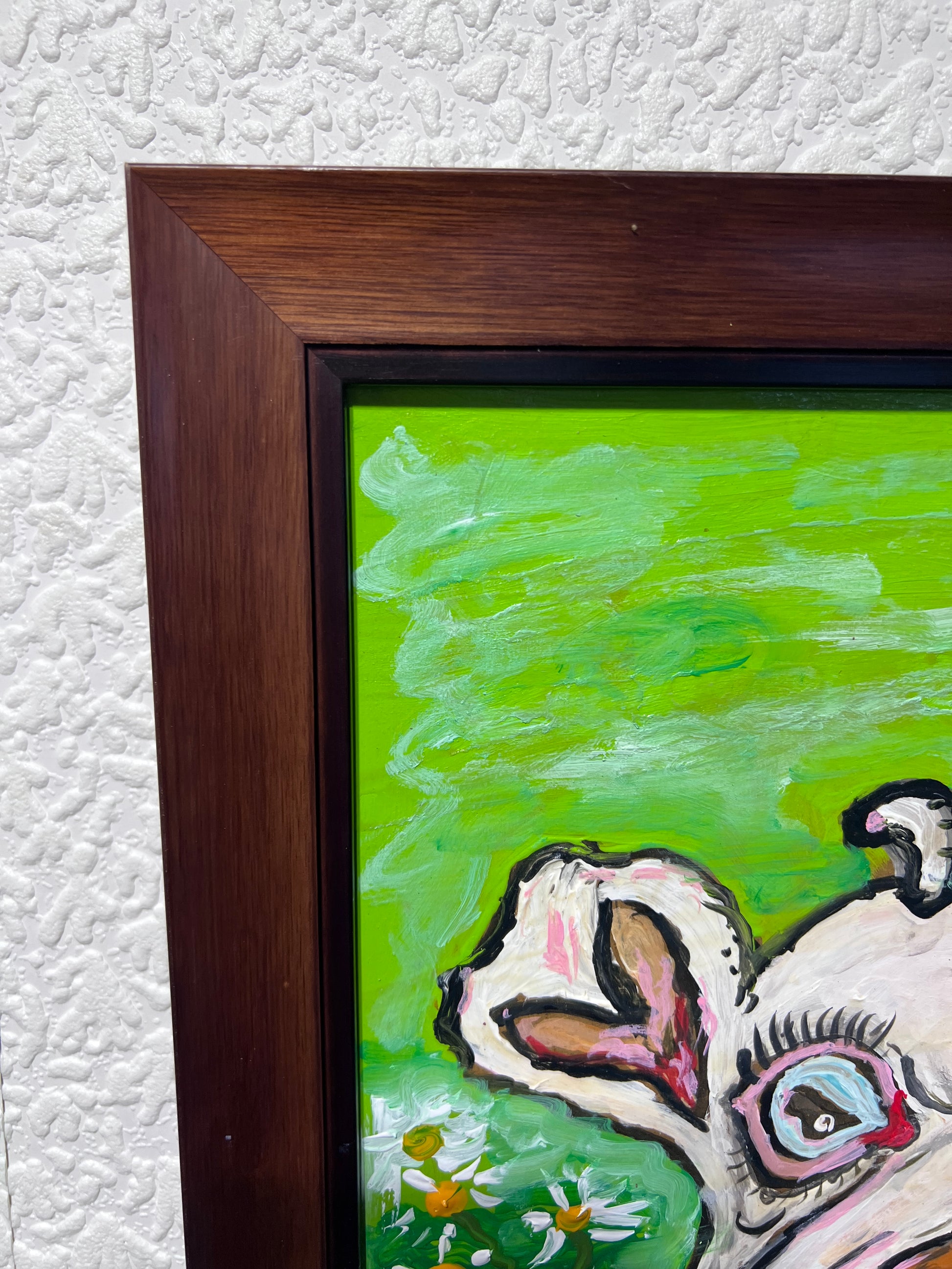 In this lively and whimsical work, a comical white lamb stands amidst a vibrant green meadow sprinkled with colorful blossoms and daisies. The lamb’s exaggerated features — large eyes, wide open mouth, and an almost mischievous grin — infuse the painting with humor and charm. Expressive brushstrokes and thick, textured paint give the figure and surrounding flora a bold, tactile quality that immediately catches the eye.