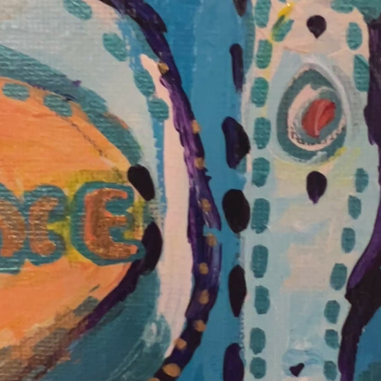 Vibrant and witty original acrylic on canvas by contemporary Florida artist Serg Graff, titled “Alien Inside the Suit” (No. 257, 2025). This one-of-a-kind piece merges humor, color, and surreal symbolism, depicting an extraterrestrial figure disguised in a human astronaut suit — a playful nod to identity, technology, and the absurdity of modern exploration.