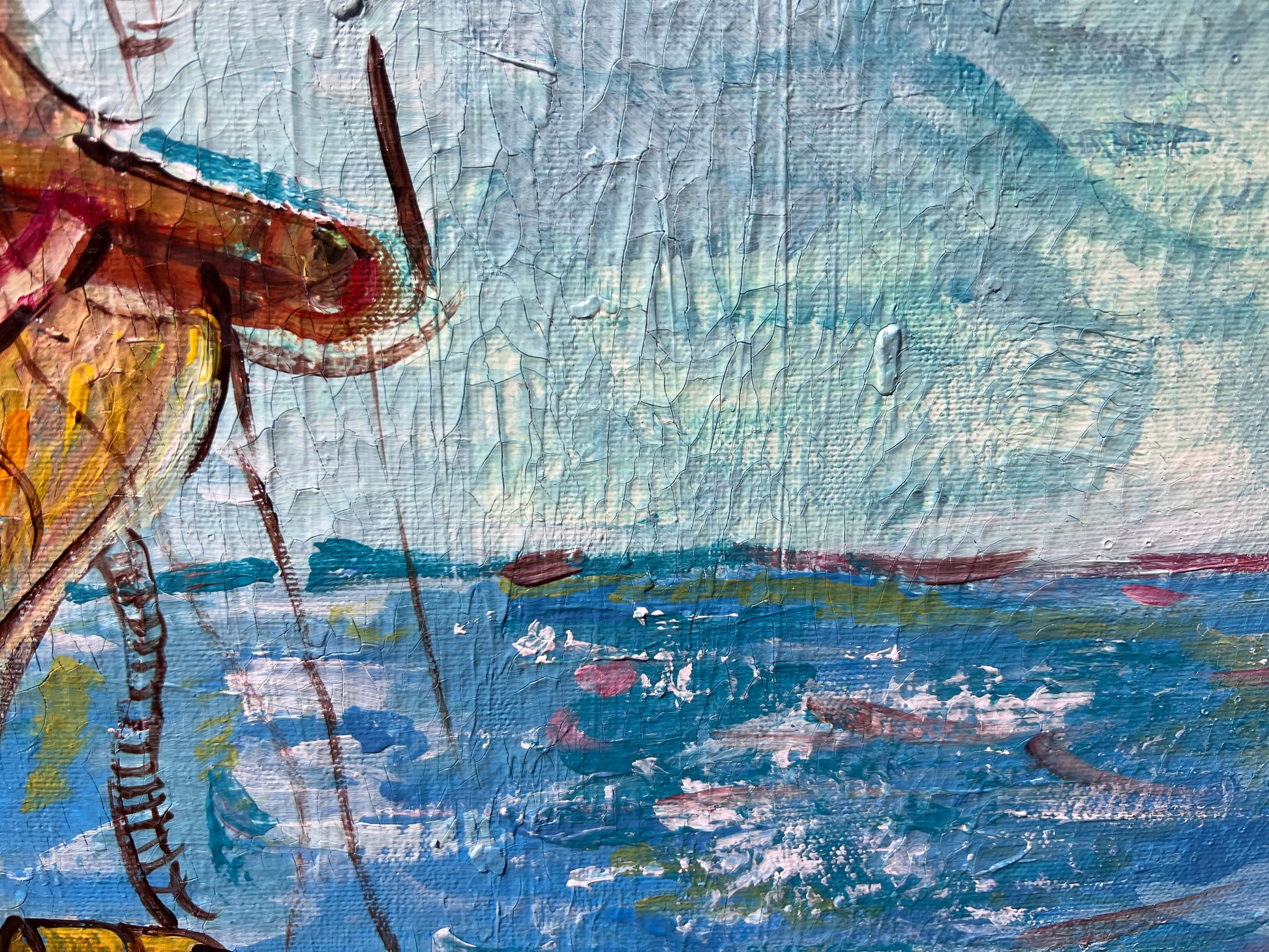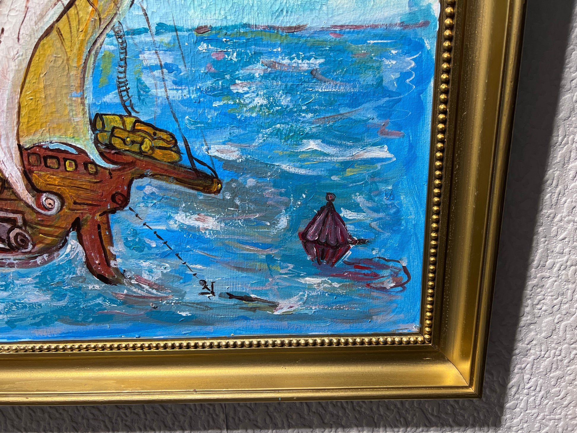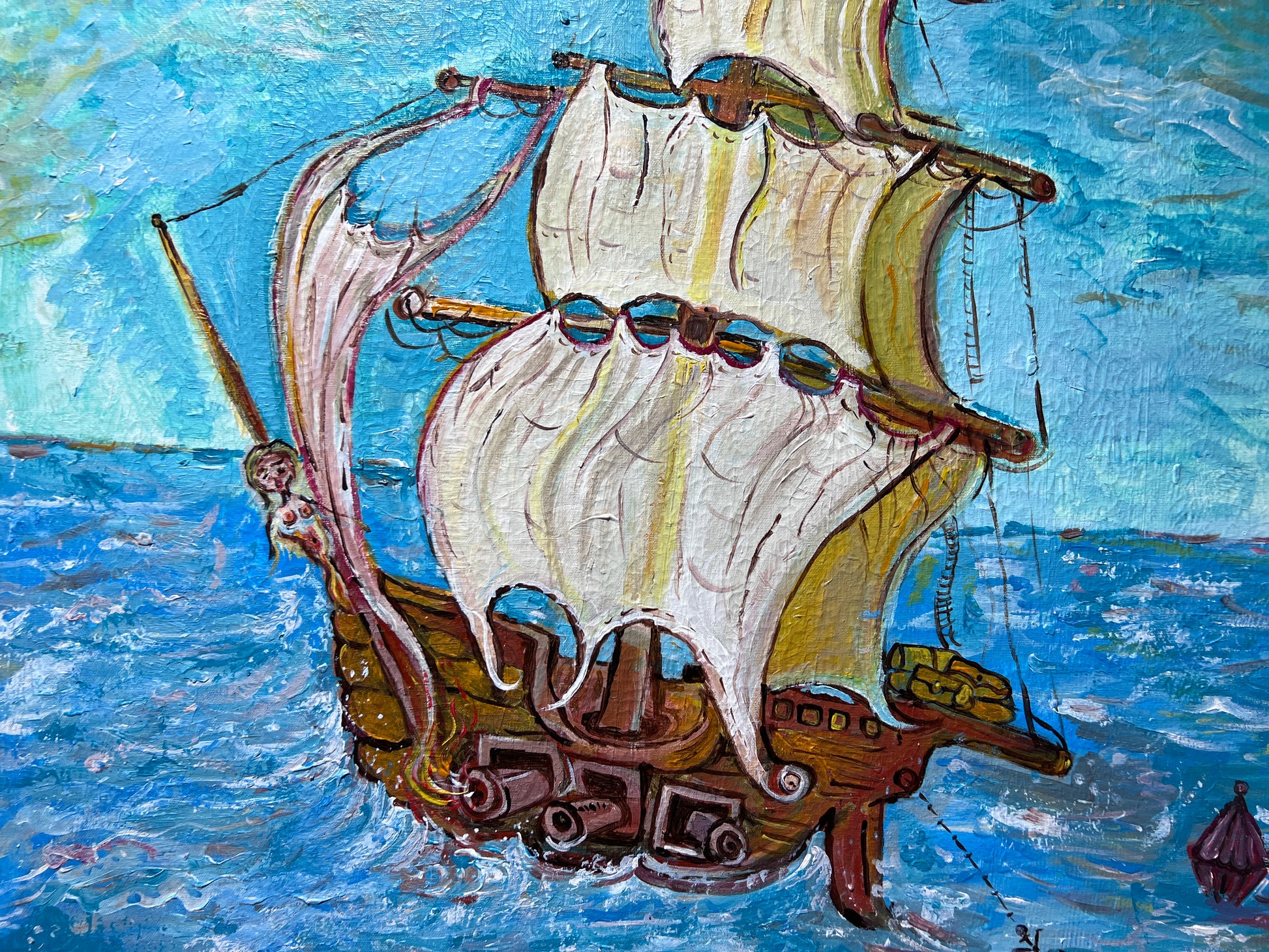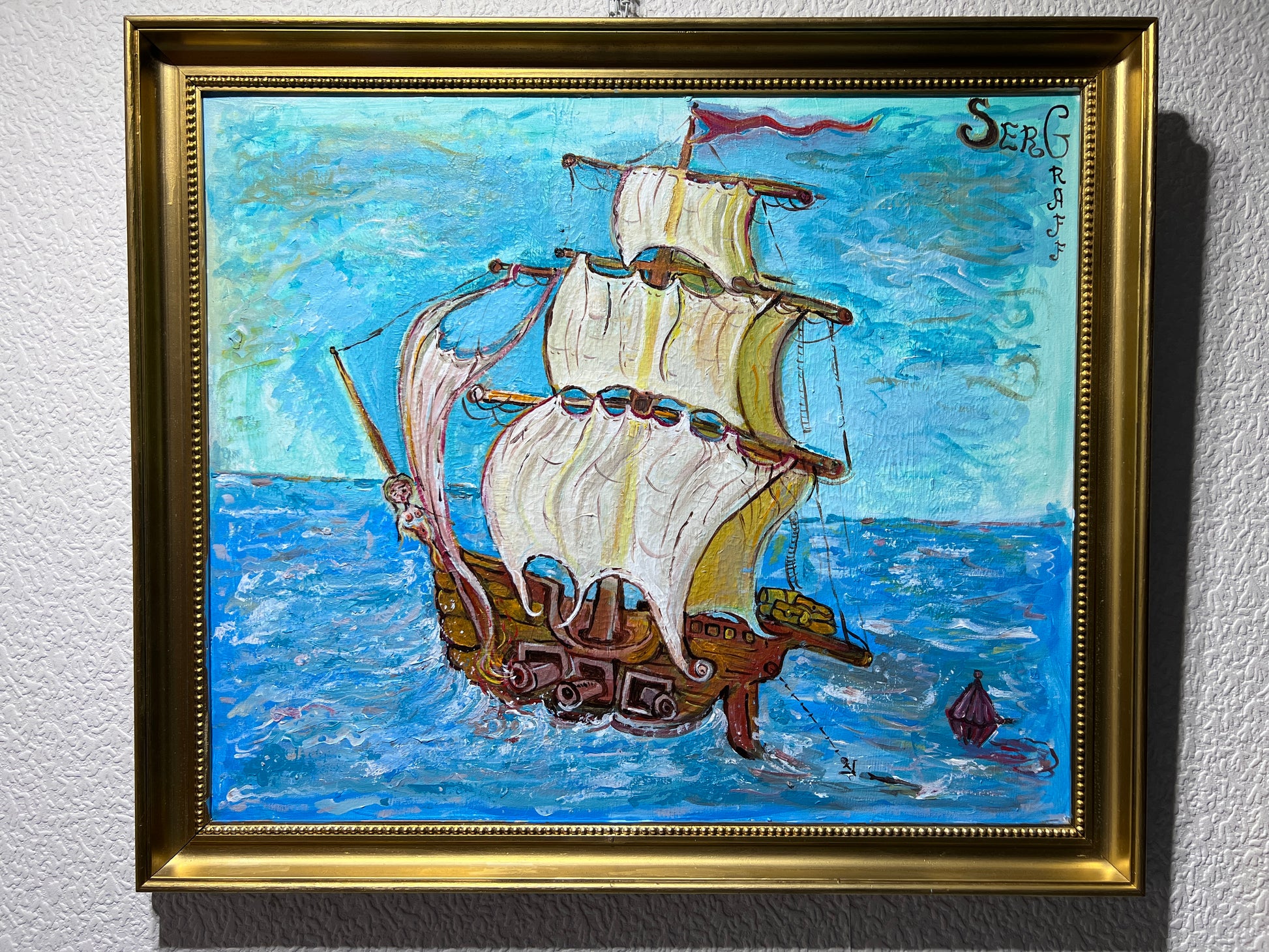 This is a unique original acrylic painting on canvas in a vivid maritime style by Serg Graff, titled “Skipper Sea Wolf.”