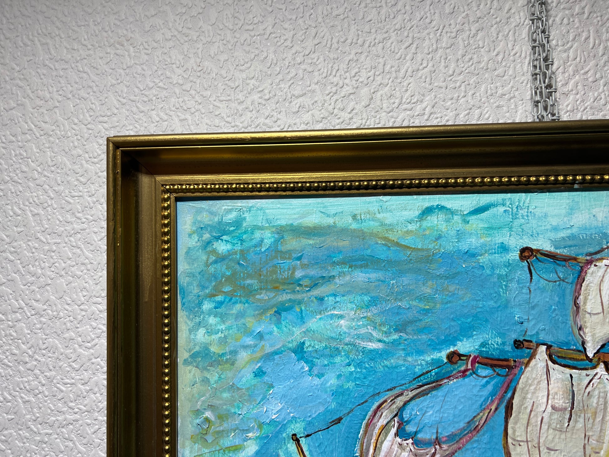 The painting presents a majestic sailing ship cutting through the waves, with intricate details on the masts, rigging, and hull. The sweeping sails, rendered in layered whites and soft beiges, billow dramatically in the wind. Bold red accents along the ship’s structure add contrast and energy, drawing the viewer’s eye to the vessel as it glides across a textured sea of brilliant blues and turquoise.