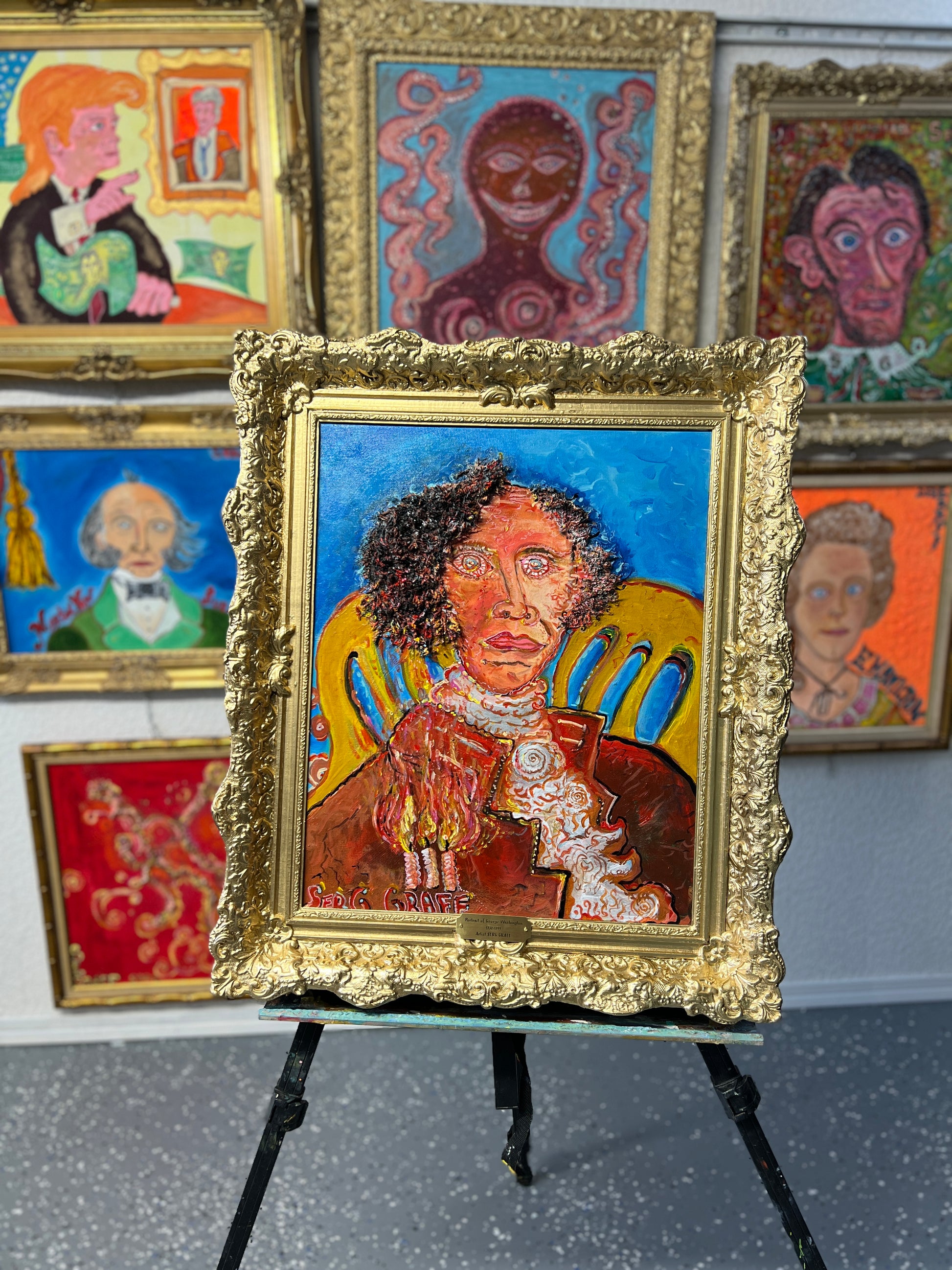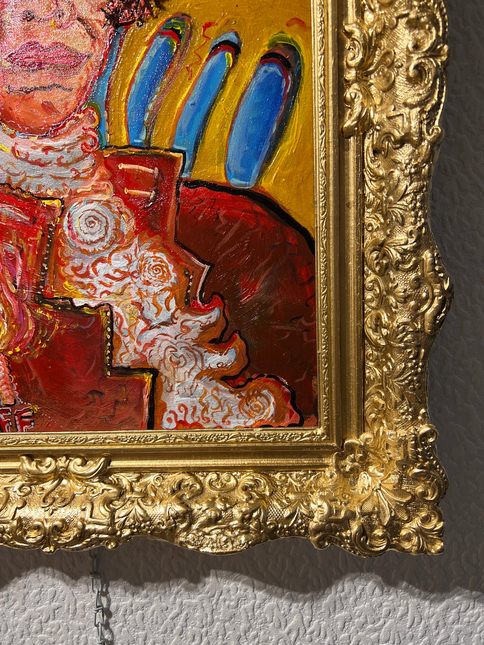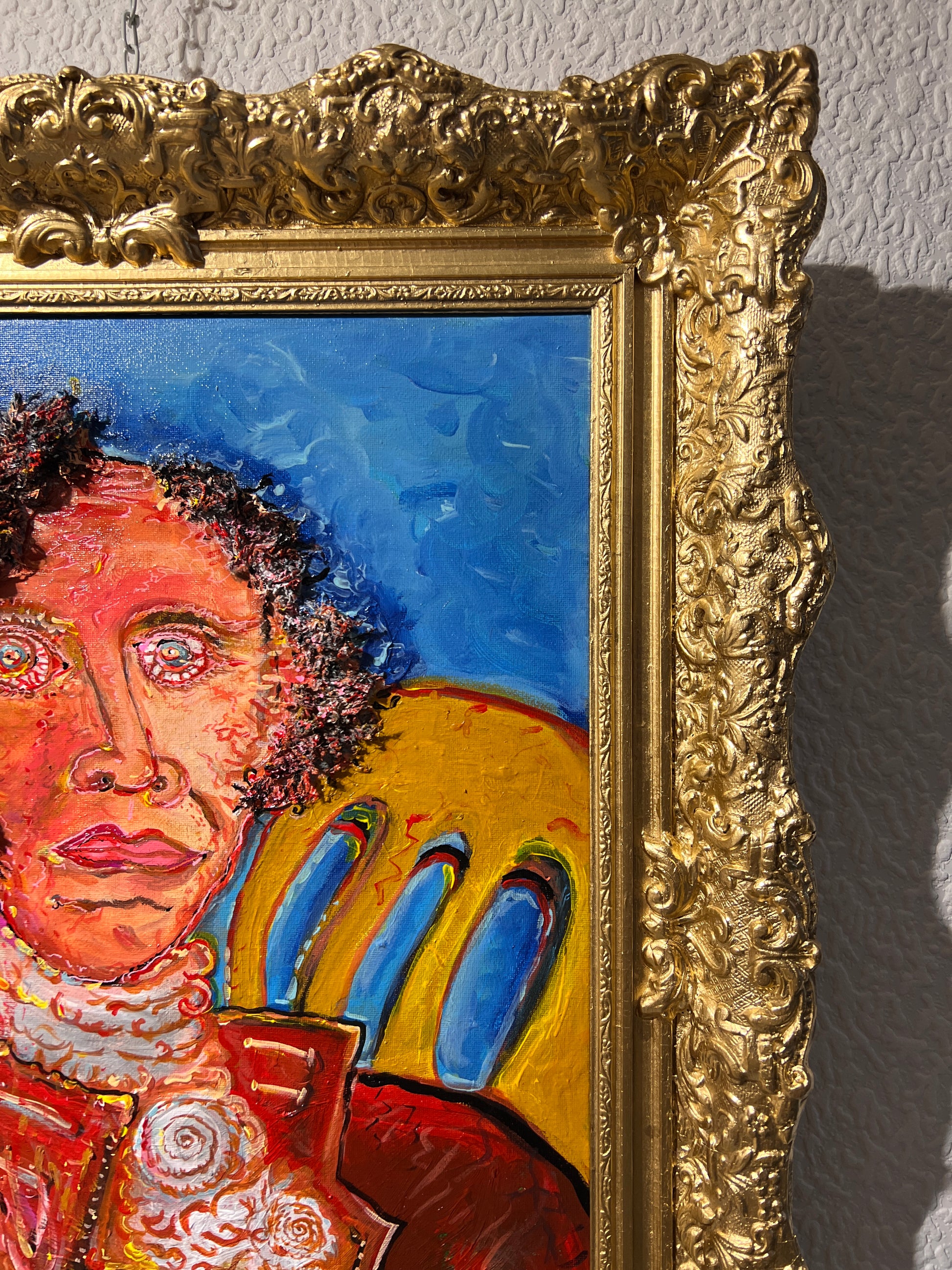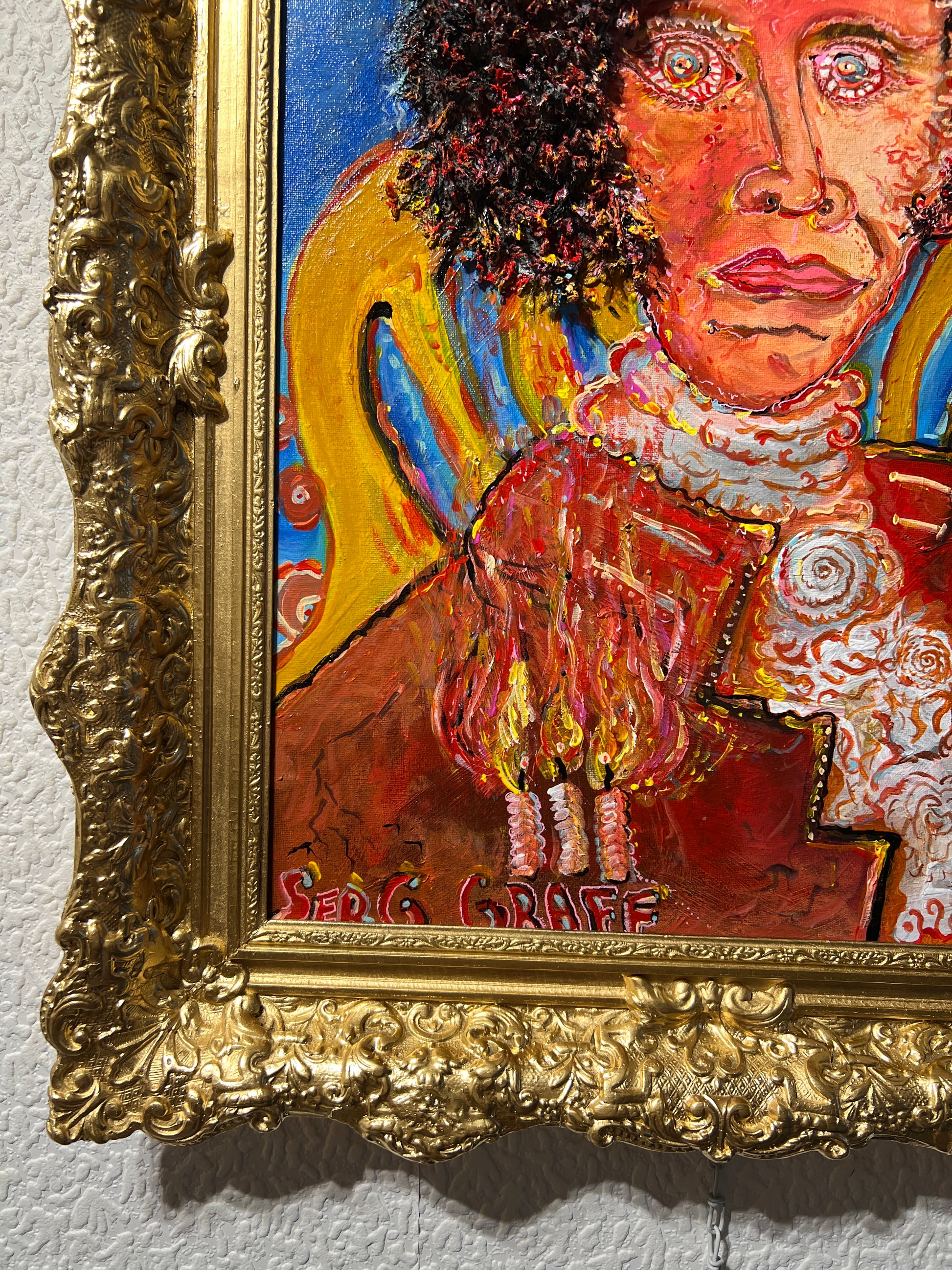 The painting is housed in an ornate gilt frame, whose rich finish complements the work’s daring color and style, giving this reimagined historical figure a sense of grandeur and modern flair. Graff’s work invites viewers to reflect on history through a fresh, imaginative, and vibrant perspective.